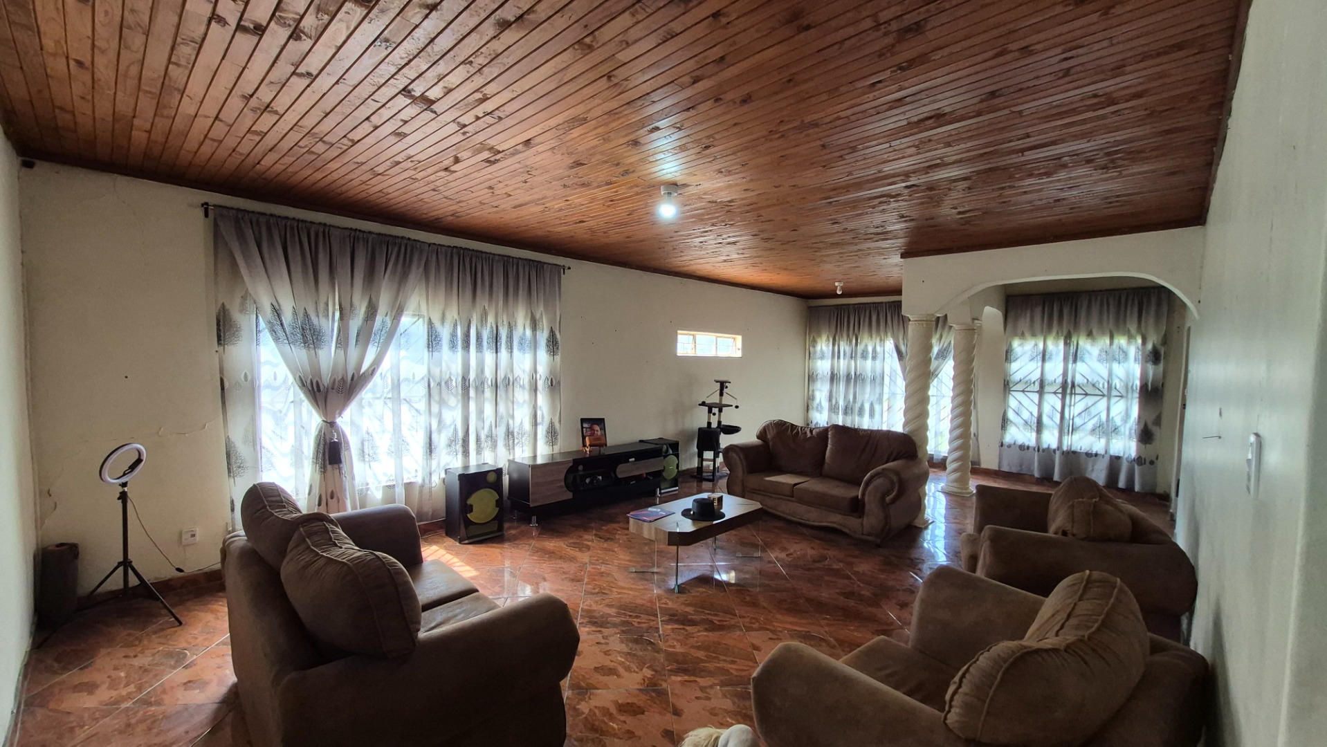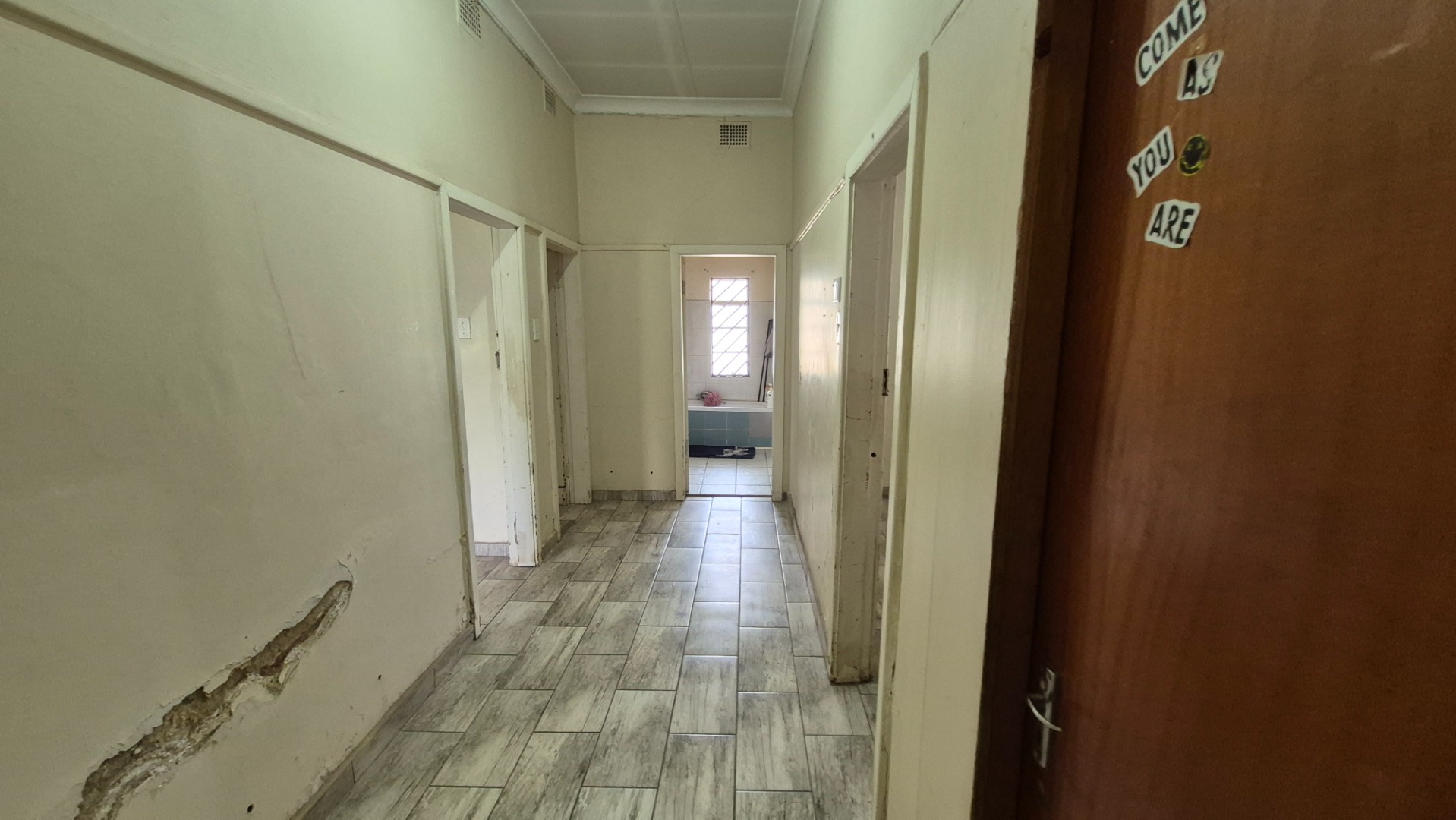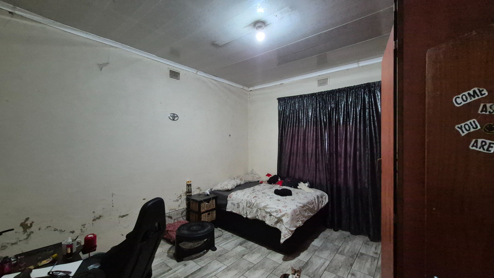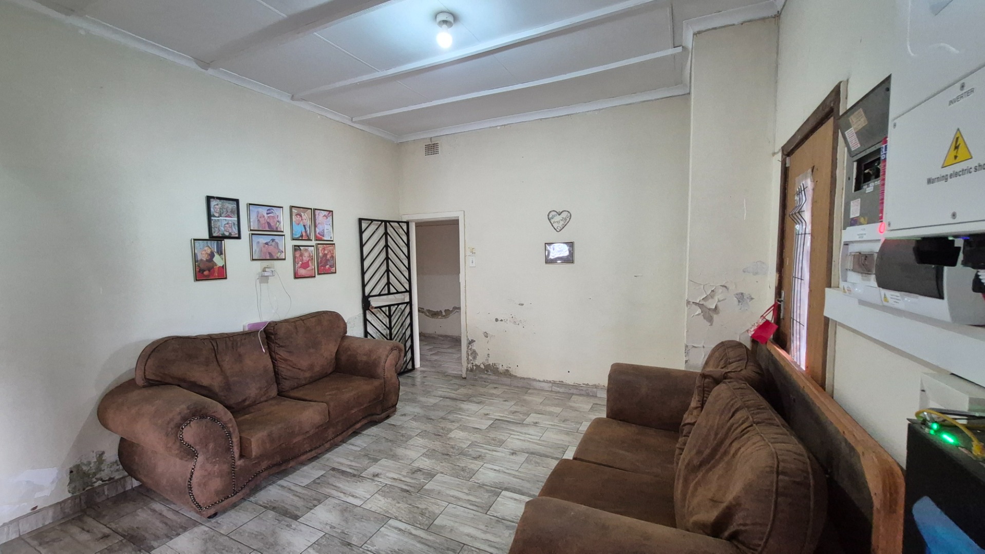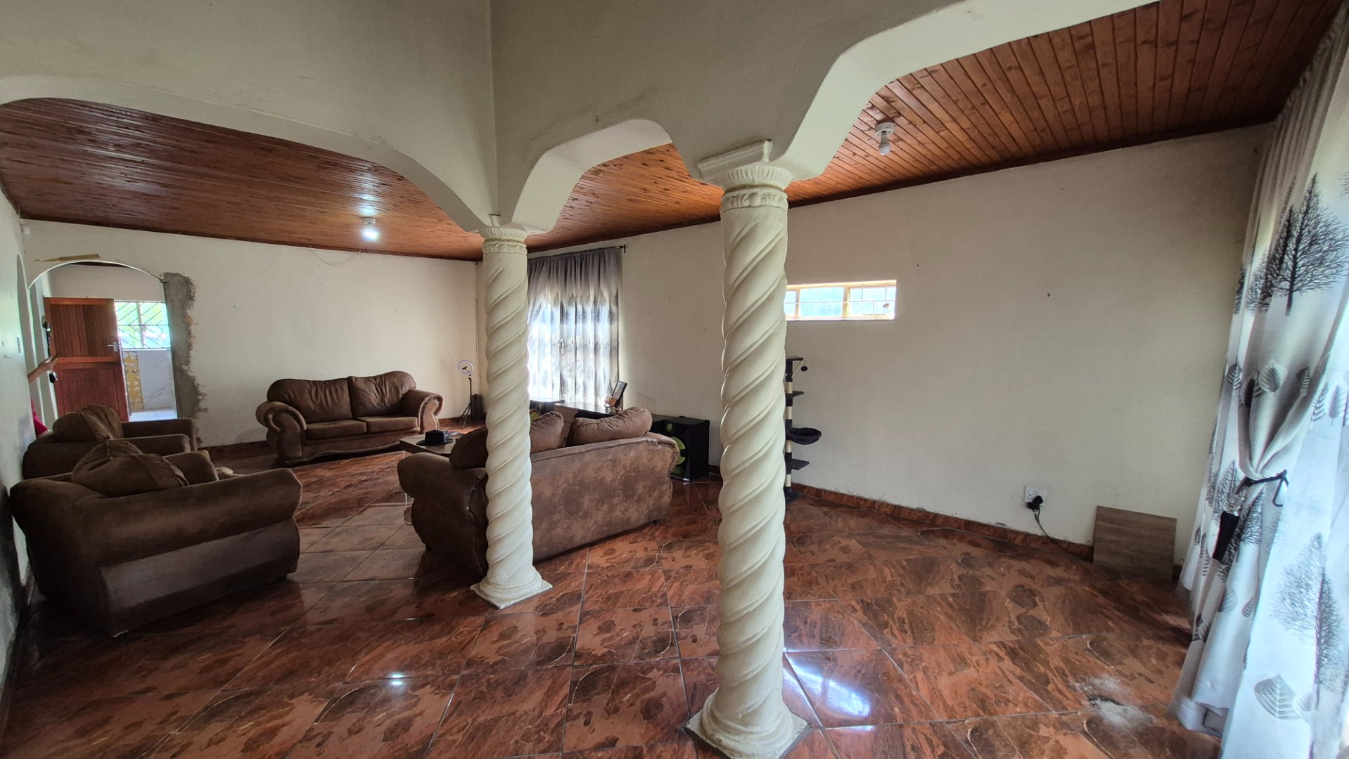 Step inside and you’ll find a spacious open-concept kitchen and dining area, perfect for family meals and entertaining. It features a lovely wooden slatted ceiling and durable tiled flooring, giving it a unique, rustic feel. The concrete countertops and open shelving offer a practical setup, ready for you to modernise and create your dream kitchen. The home offers three comfy bedrooms and a single bathroom, providing a solid foundation for comfortable living.