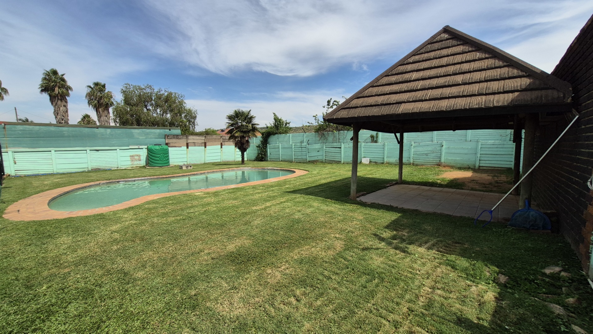 Outside, the property truly shines with its fantastic outdoor features. Imagine summer days by your very own kidney-shaped swimming pool, or relaxing under the rustic thatch-roofed lapa. The large, well-maintained grassy lawn is ideal for kids and pets to play, and there’s an expansive paved area with ample parking for two vehicles. You’ll also find multiple outbuildings, perfect for extra storage or even a workshop. The property boasts a unique architectural style and security bars on windows, plus a security gate and camera for peace of mind.