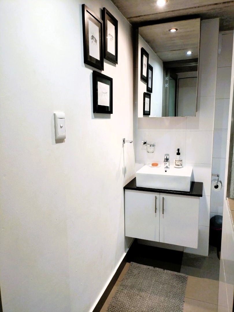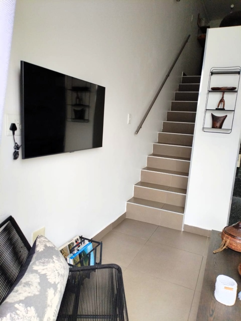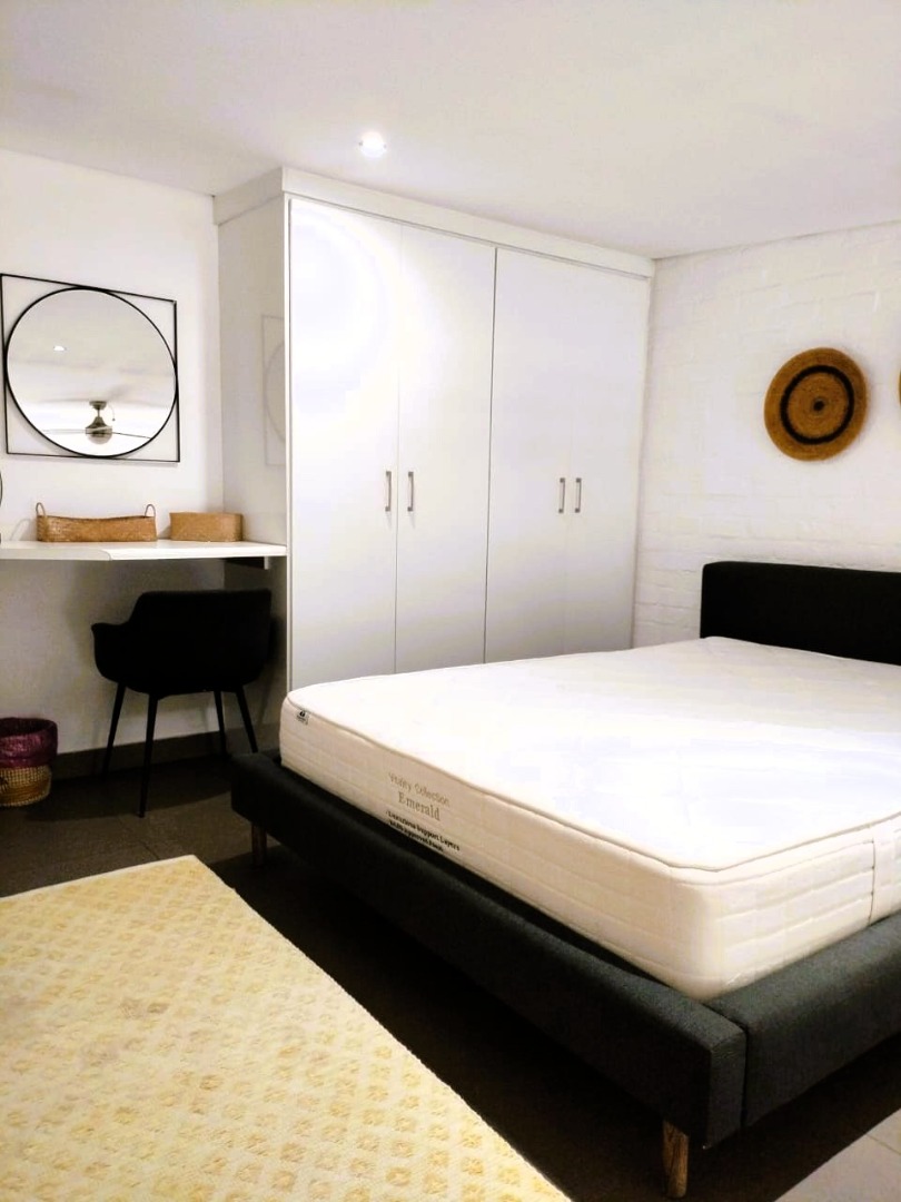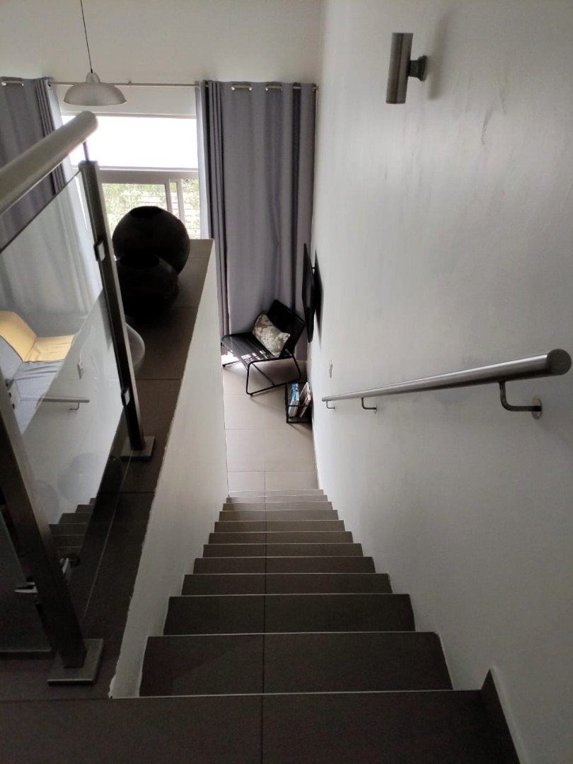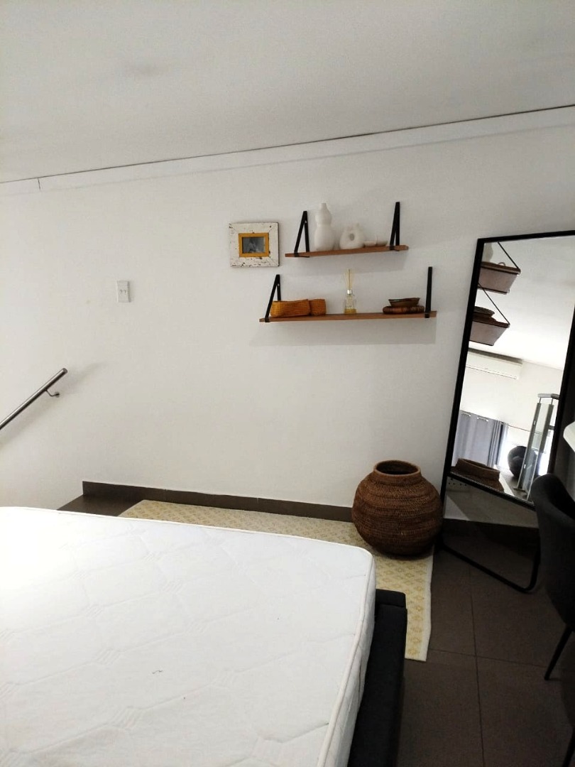 The tiled living area flows into a neat bathroom fitted with a shower, basin and toilet. Upstairs, the loft-style bedroom overlooks the living area and includes built-in cupboards. The apartment is also fitted with an air conditioner and fibre connectivity.