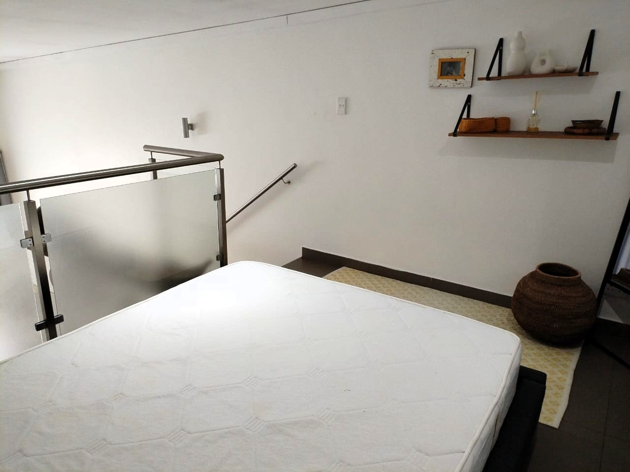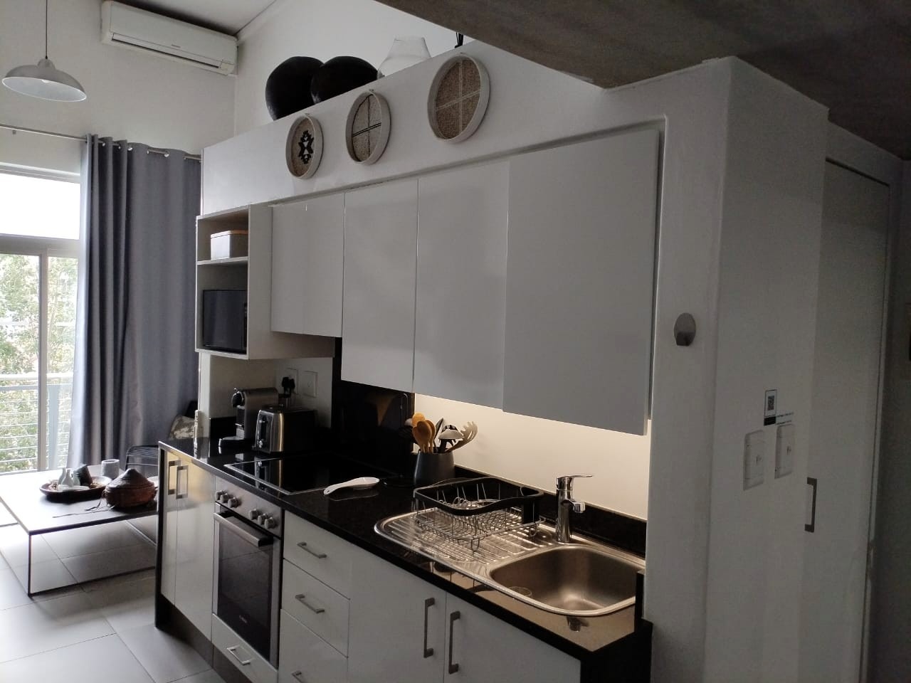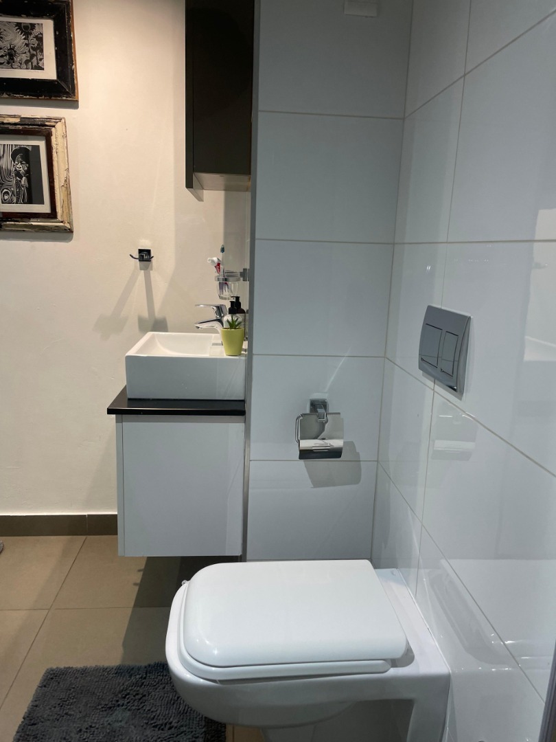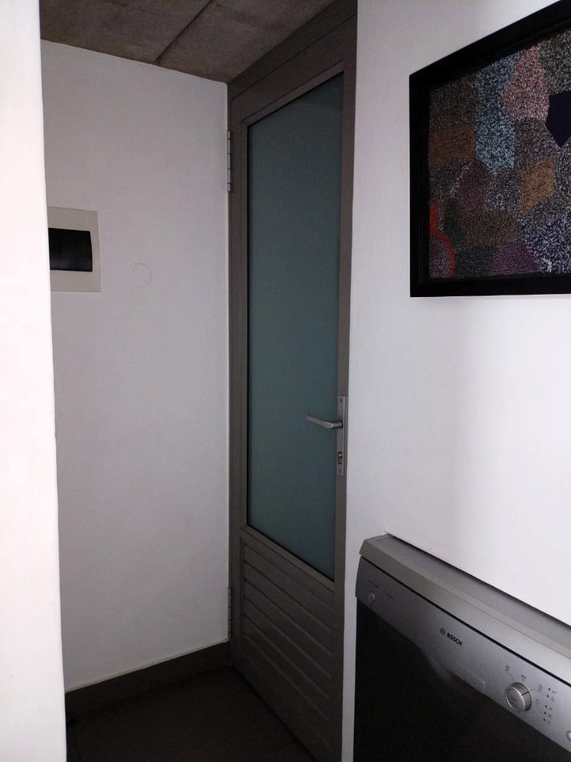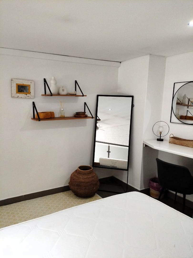 The tiled living area flows into a neat bathroom fitted with a shower, basin and toilet. Upstairs, the loft-style bedroom overlooks the living area and includes built-in cupboards. The apartment is also fitted with an air conditioner and fibre connectivity.