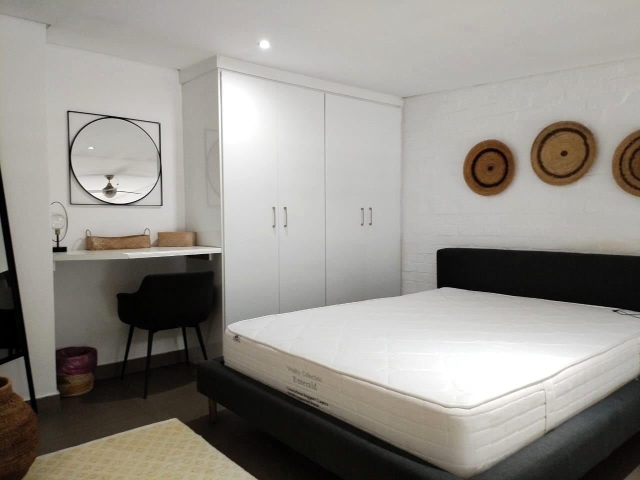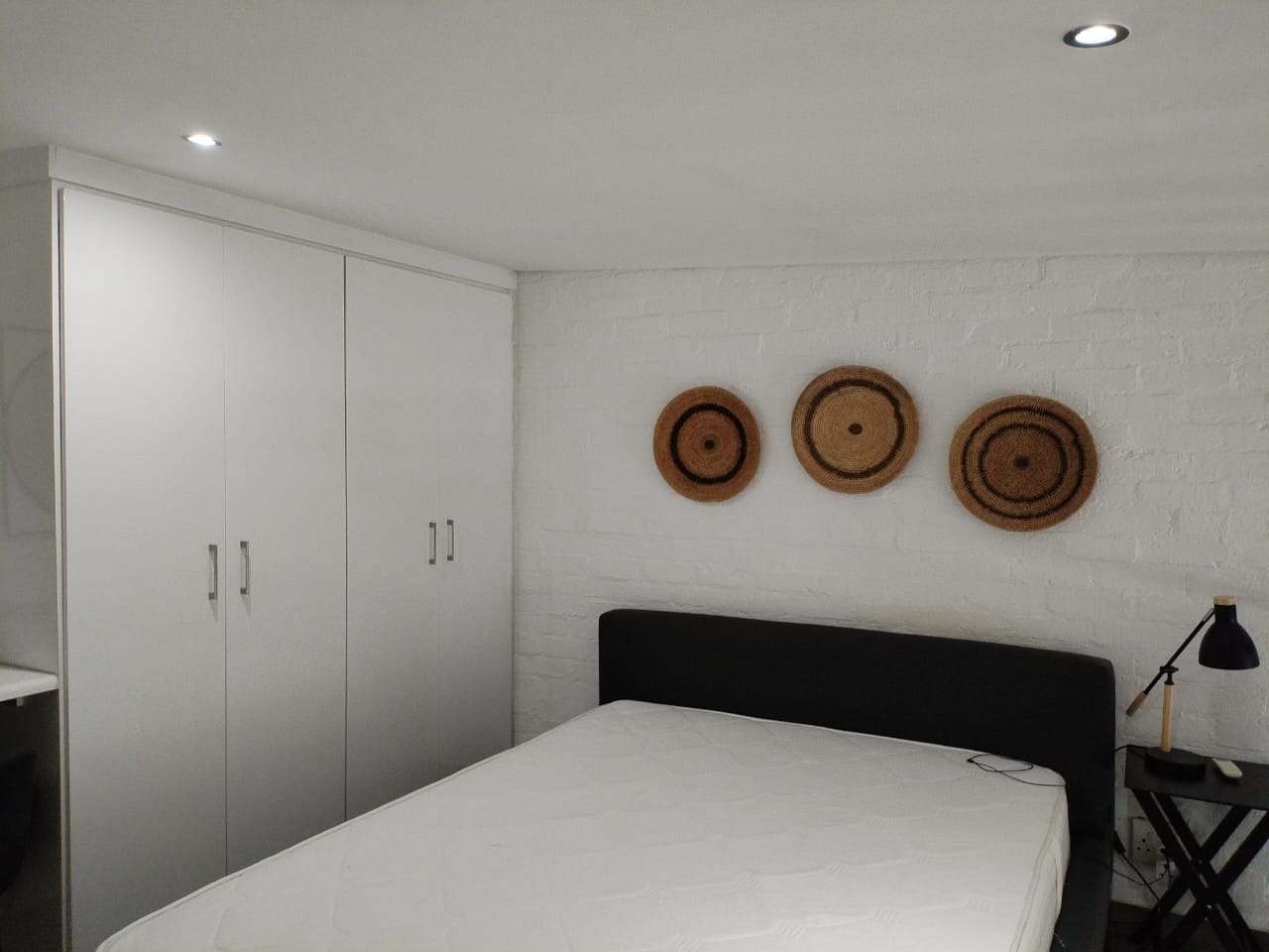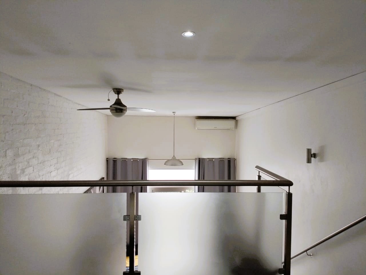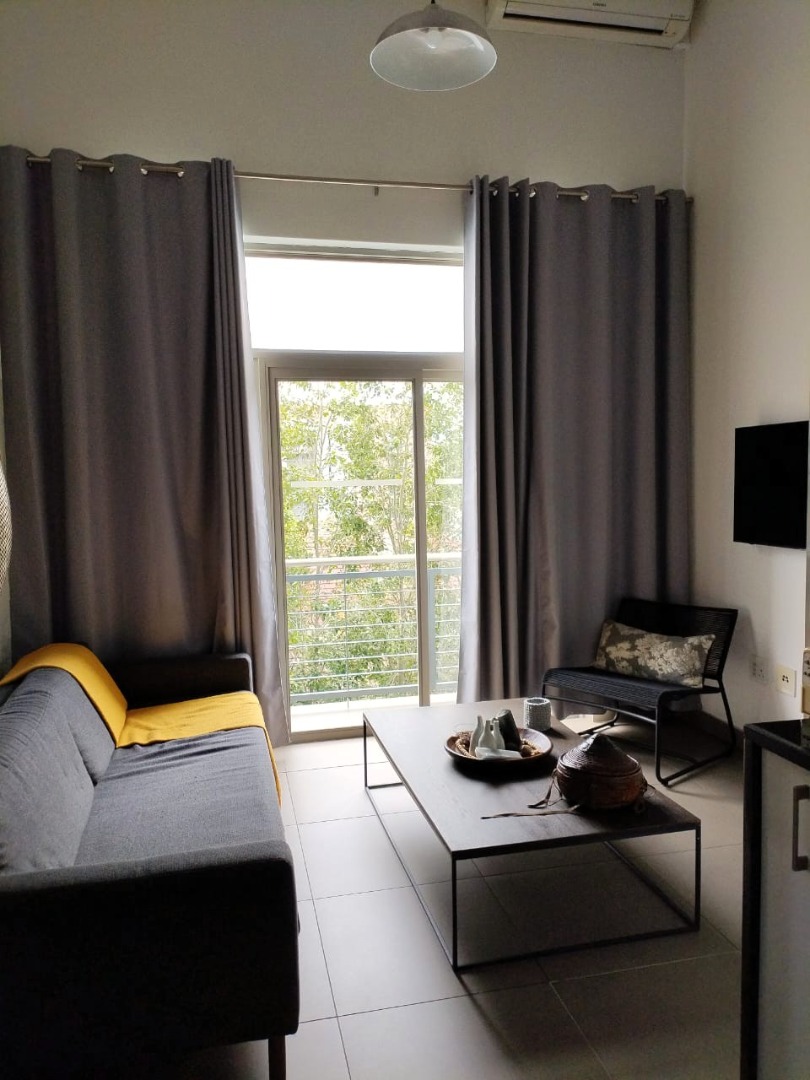 The tiled living area flows into a neat bathroom fitted with a shower, basin and toilet. Upstairs, the loft-style bedroom overlooks the living area and includes built-in cupboards. The apartment is also fitted with an air conditioner and fibre connectivity.