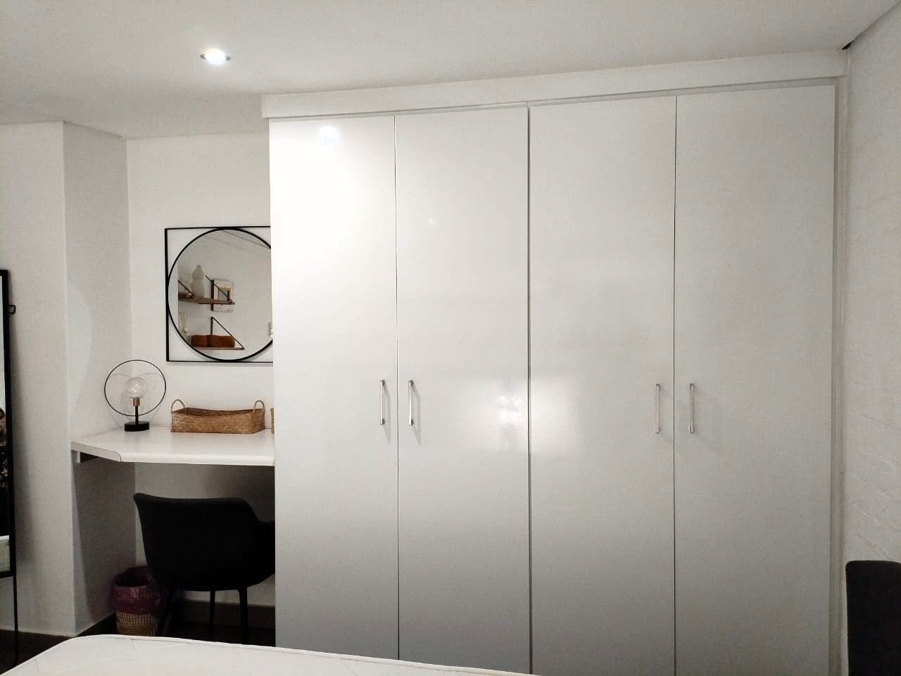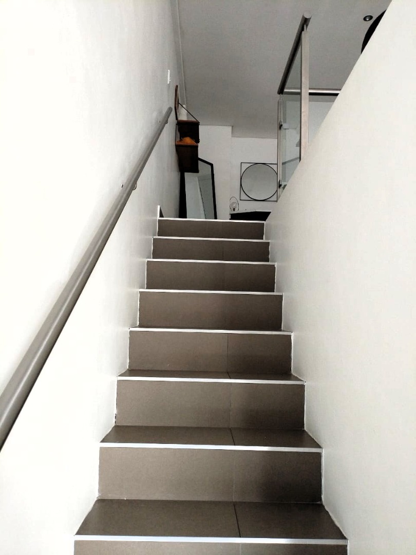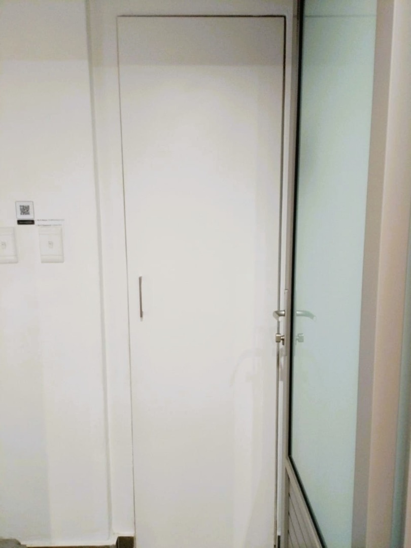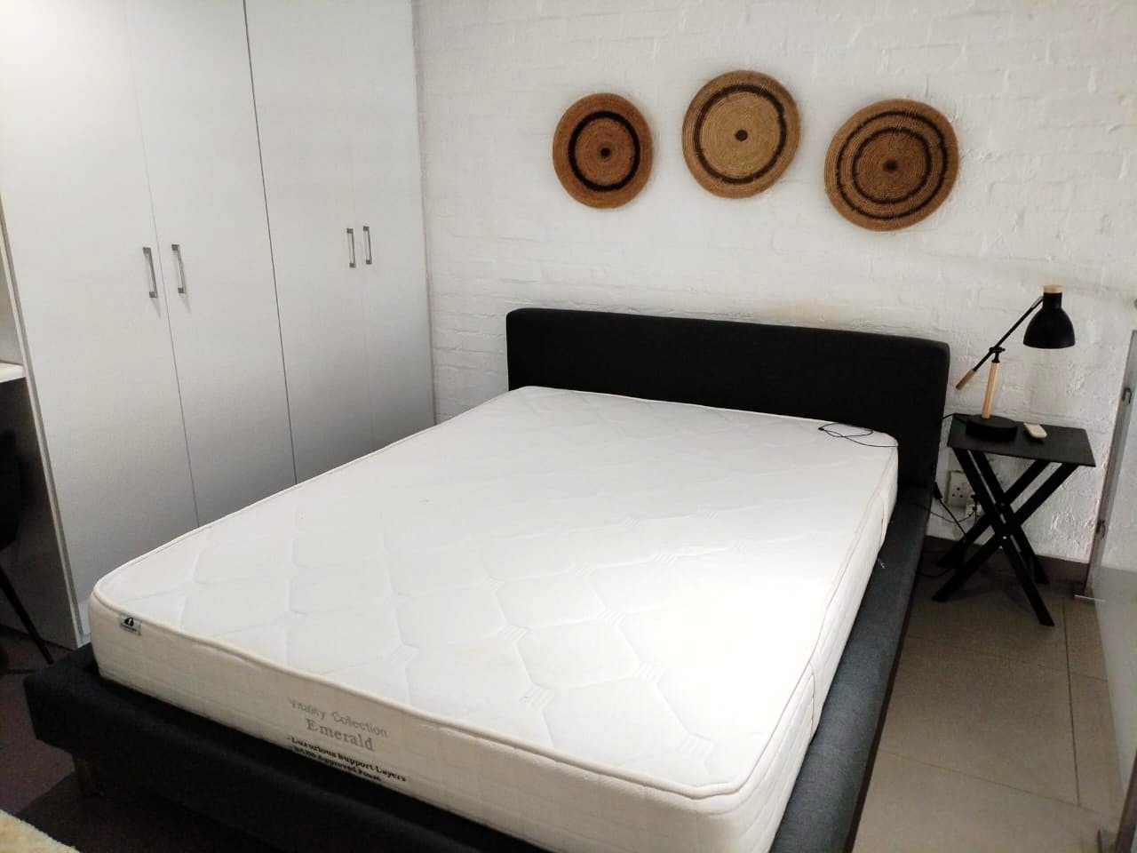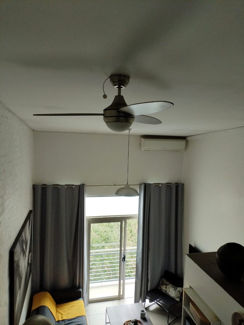 The tiled living area flows into a neat bathroom fitted with a shower, basin and toilet. Upstairs, the loft-style bedroom overlooks the living area and includes built-in cupboards. The apartment is also fitted with an air conditioner and fibre connectivity.