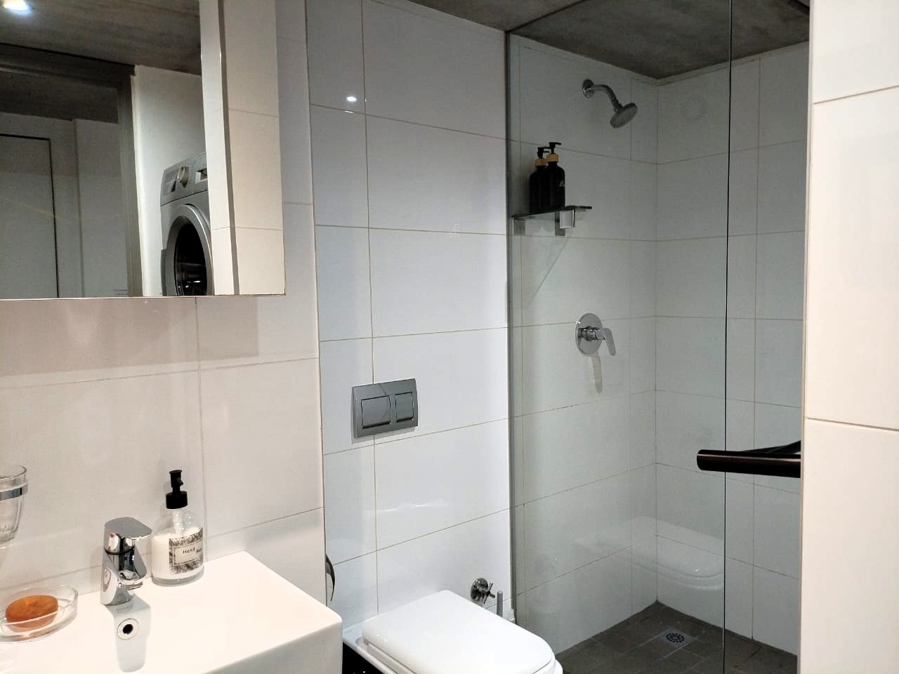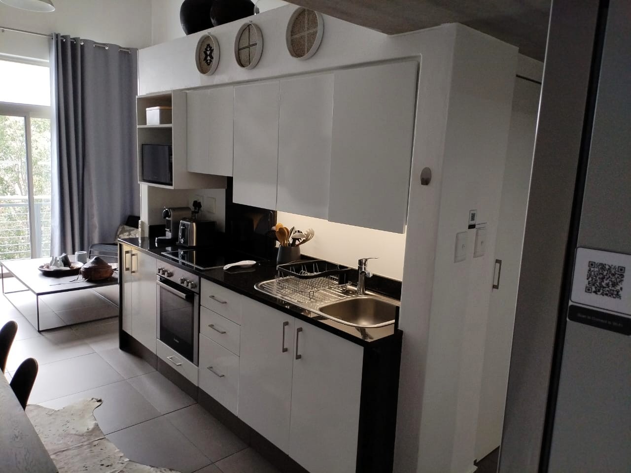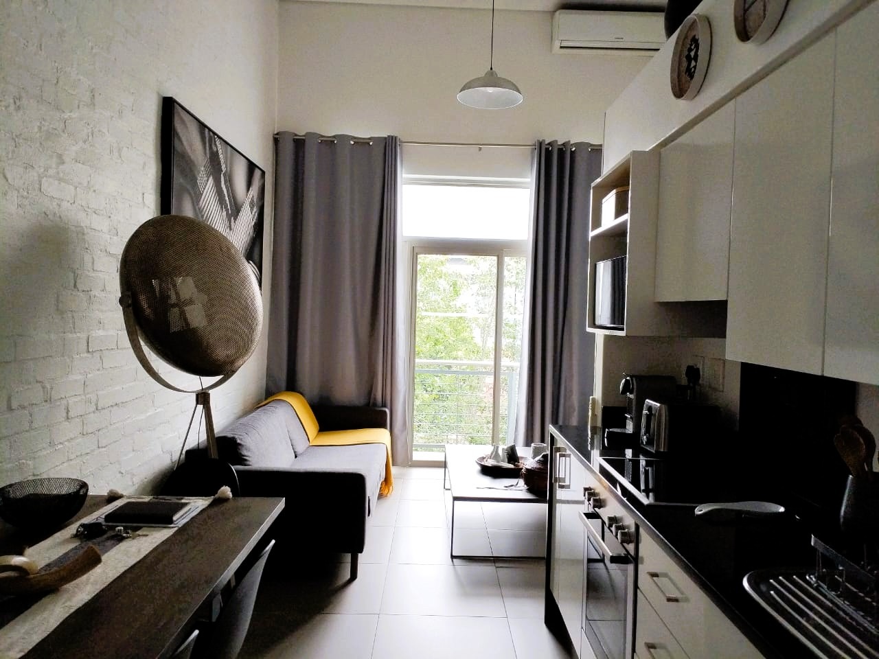 The unit measures 51 m² and offers a modern open-plan, double-volume living space with aluminium windows and doors. The contemporary kitchen features granite countertops and comes fully equipped, with all appliances and verified modern furniture included in the selling price, all still in very good condition — making this a true walk-in, rent-ready investment.