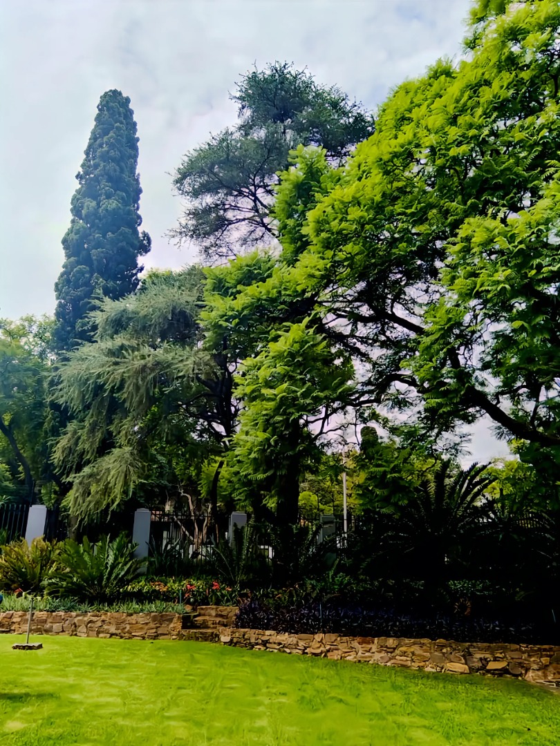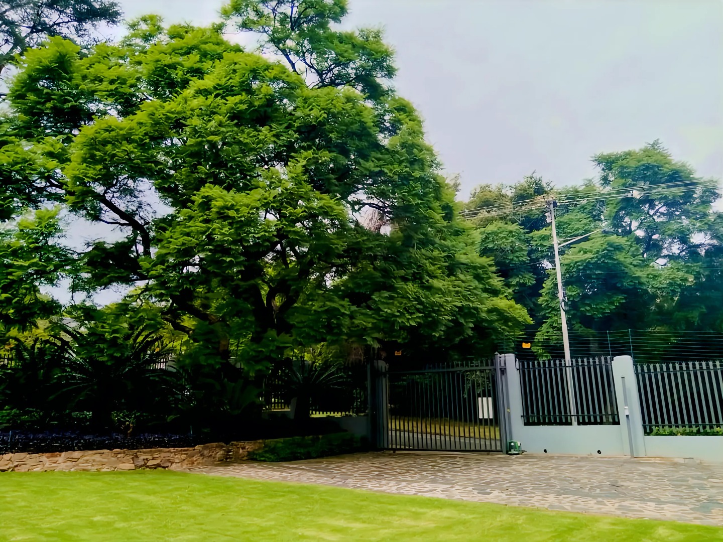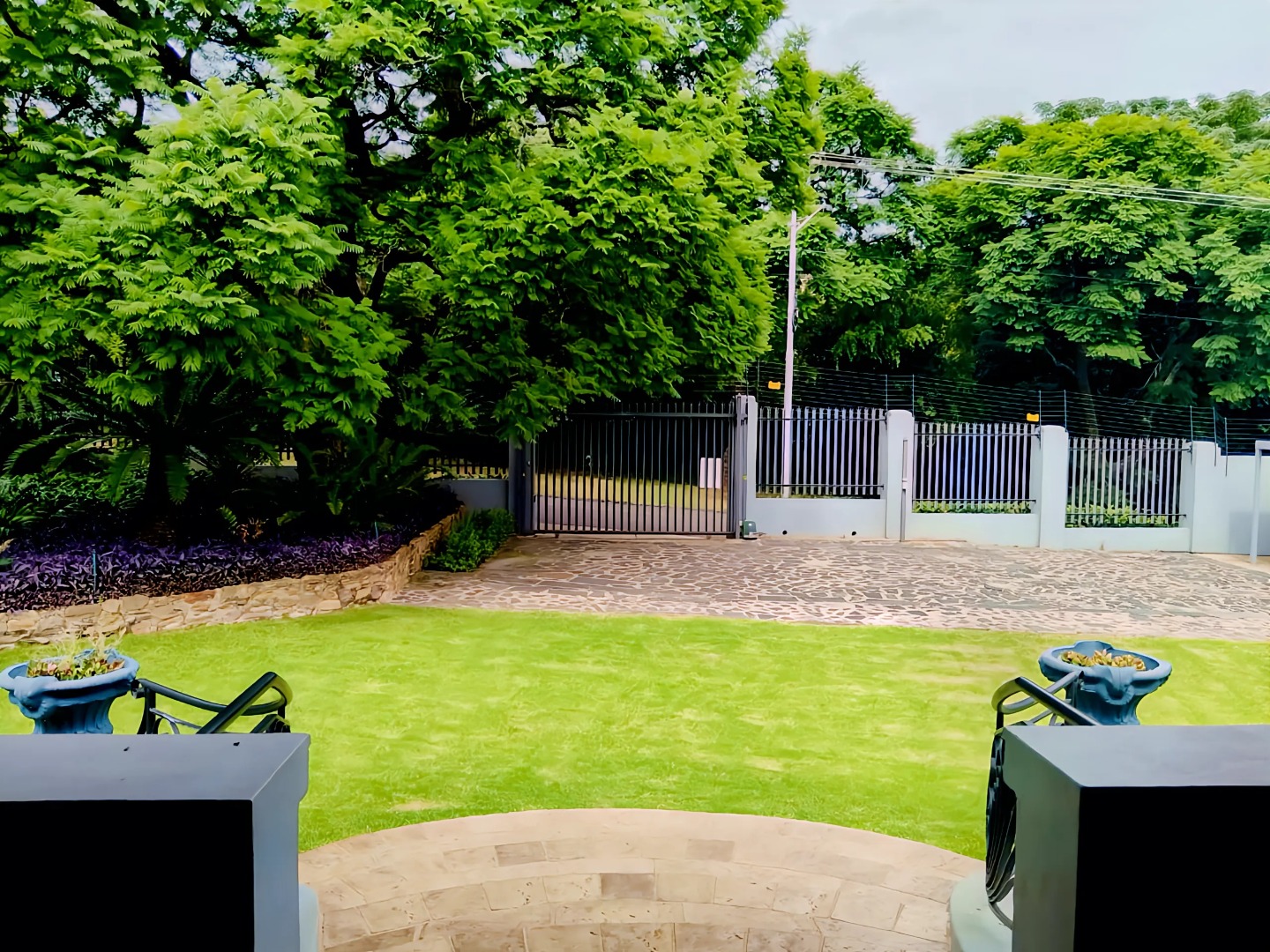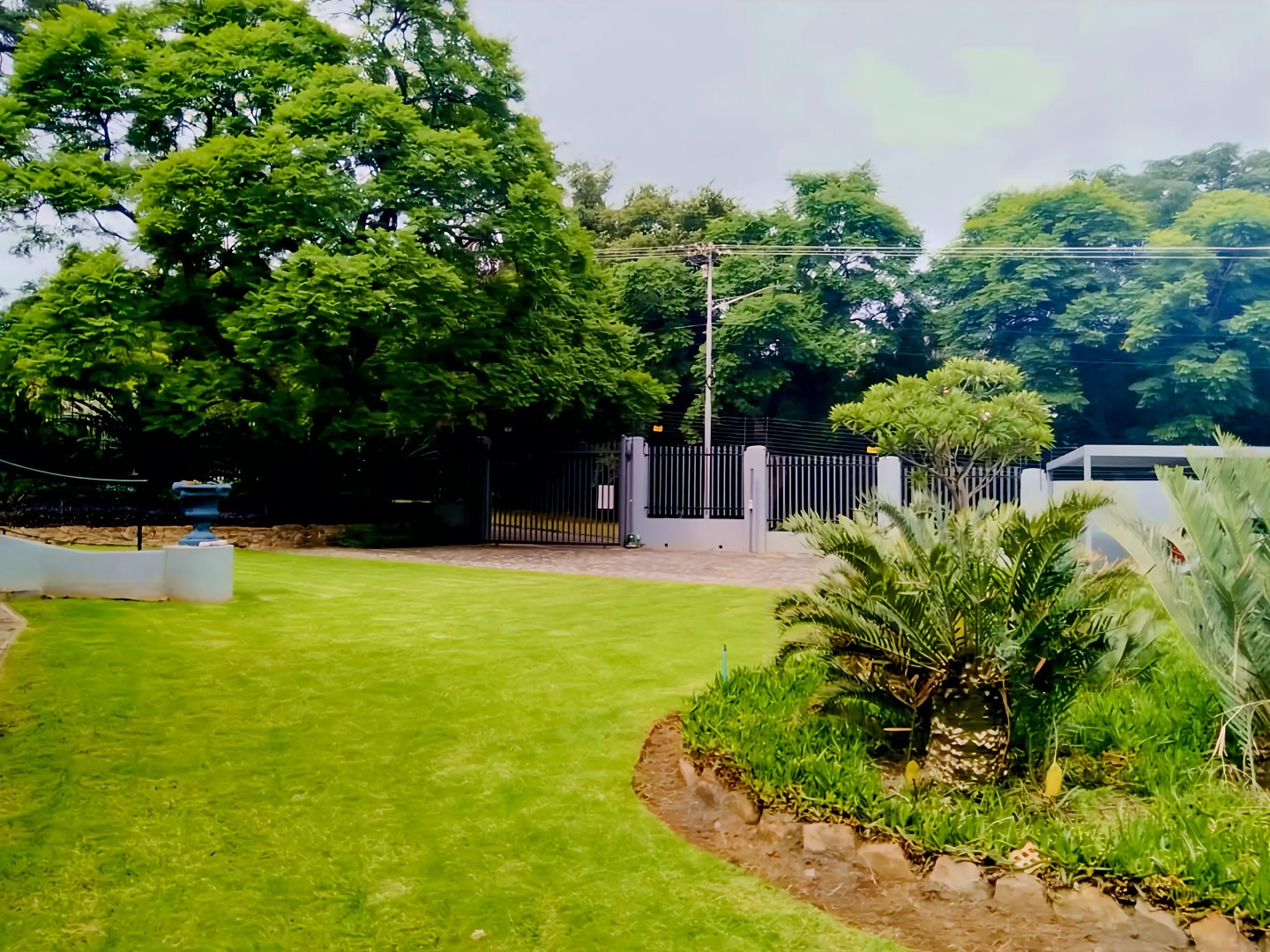 - Beautifully landscaped garden with mature trees, cycads, grass, and plants