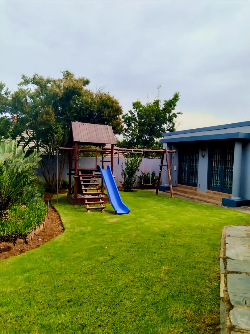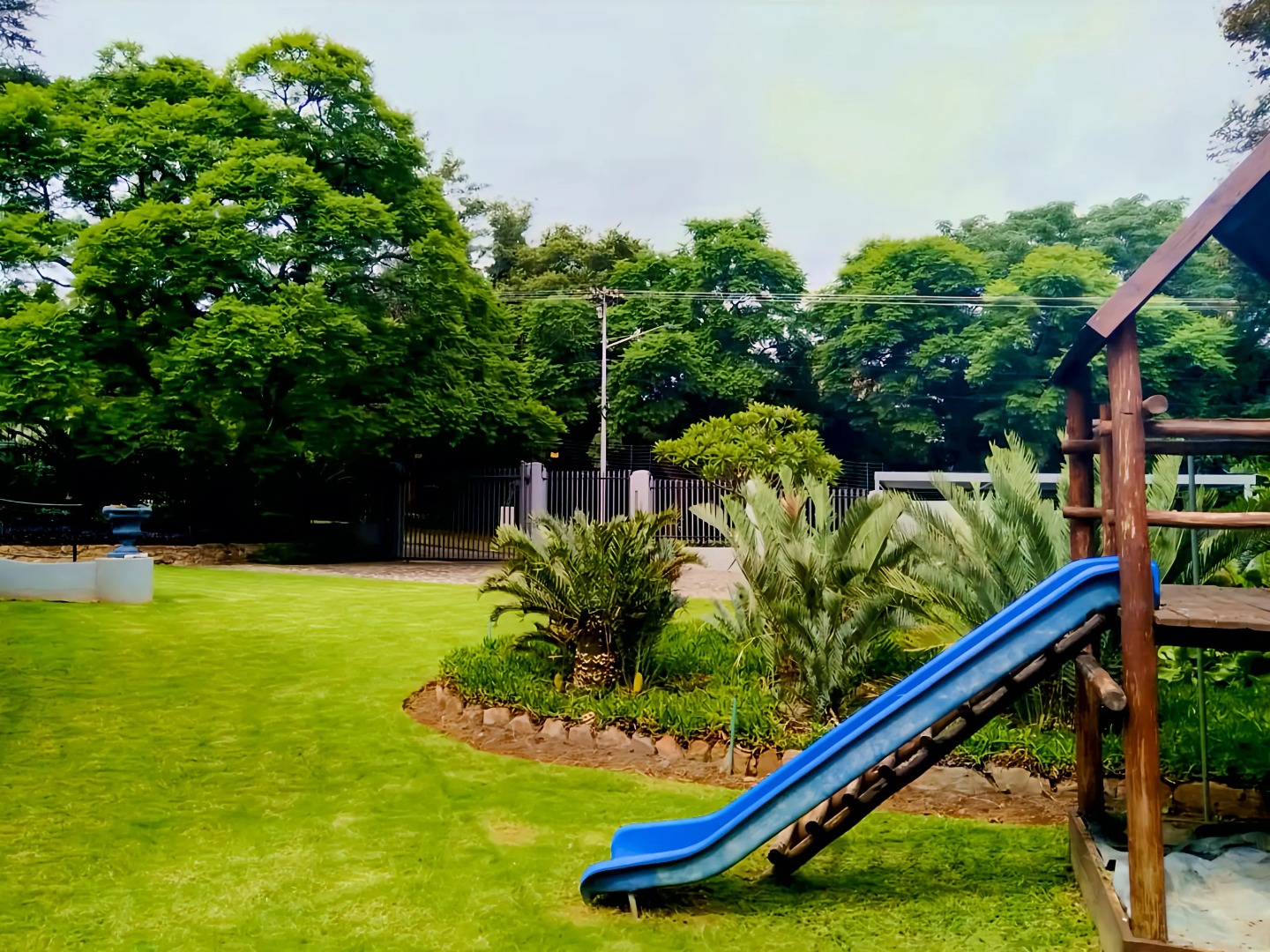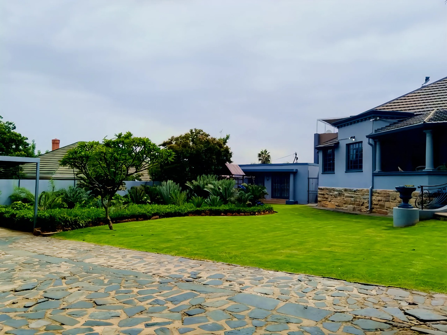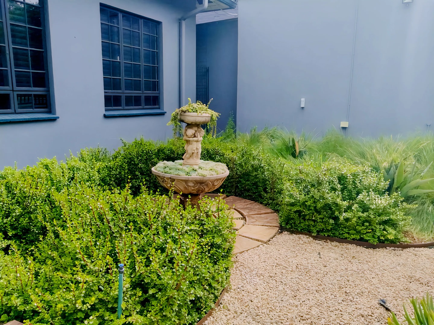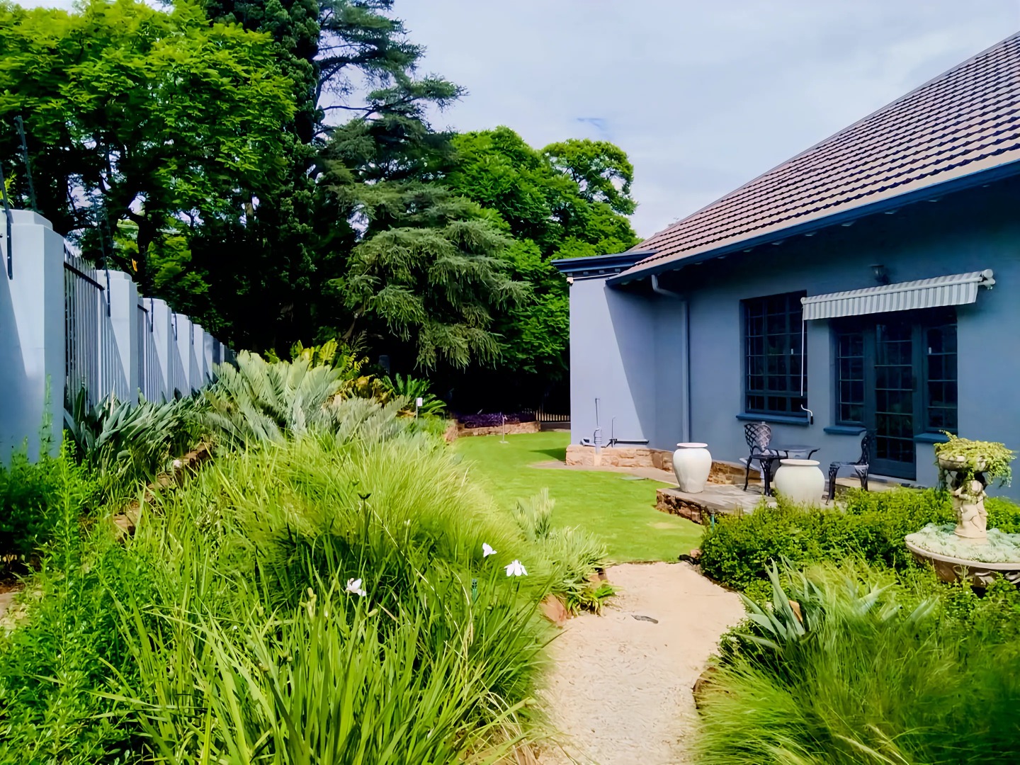 - Beautifully landscaped garden with mature trees, cycads, grass, and plants