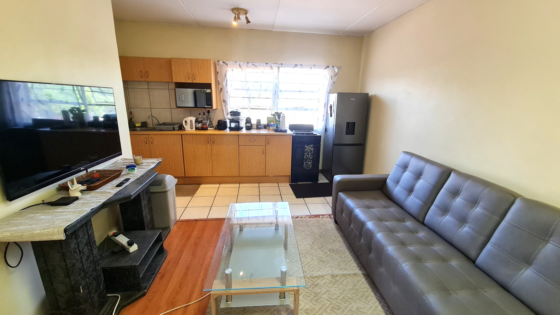 Open plan lounge, dining room and kitchen.