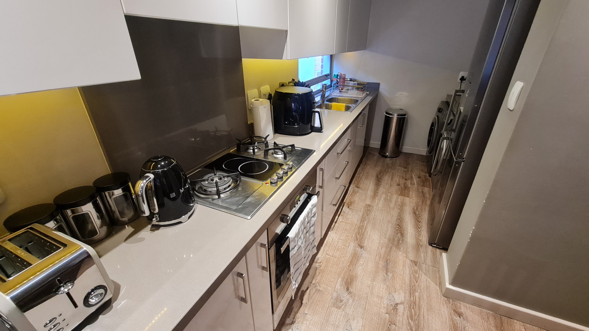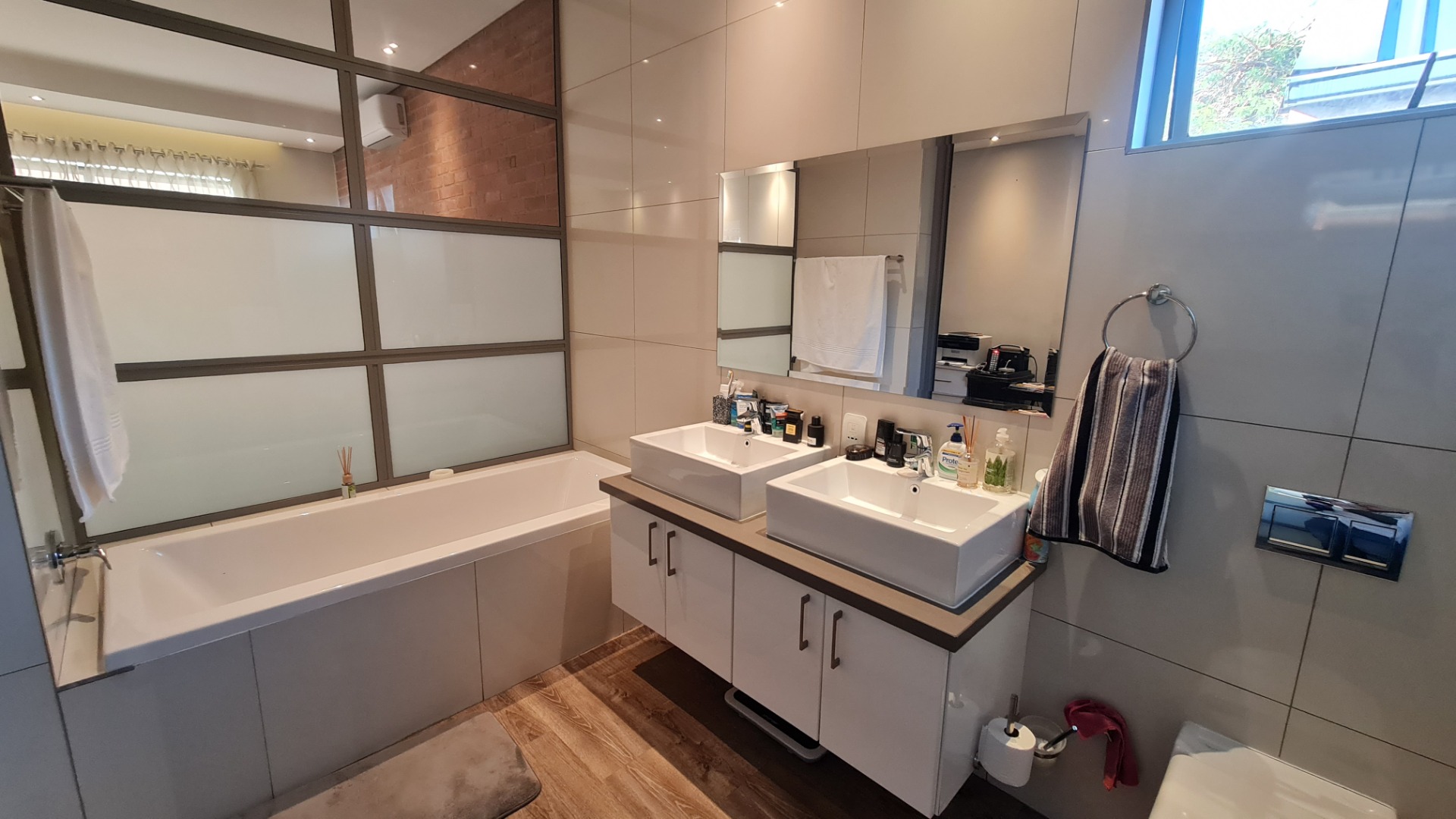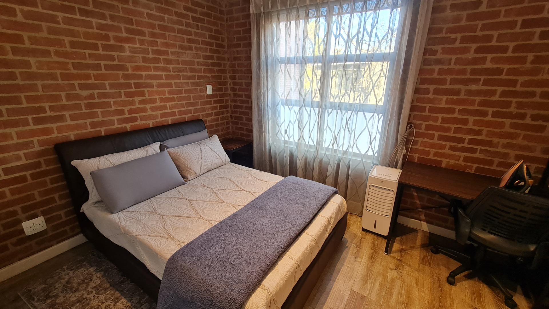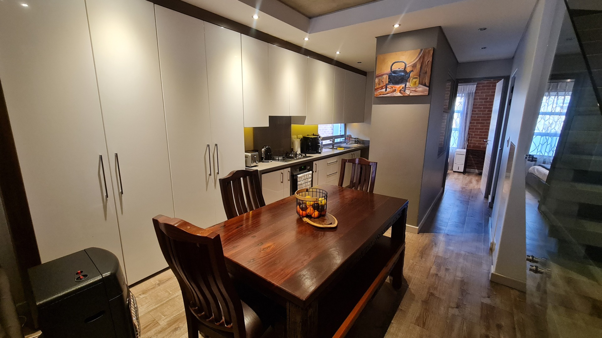 The unit has a large double garage (automatic) and occupants have the use of a communal garden at the back of the unit. A backup battery system powers essential lights and plugs in the unit during loadshedding.