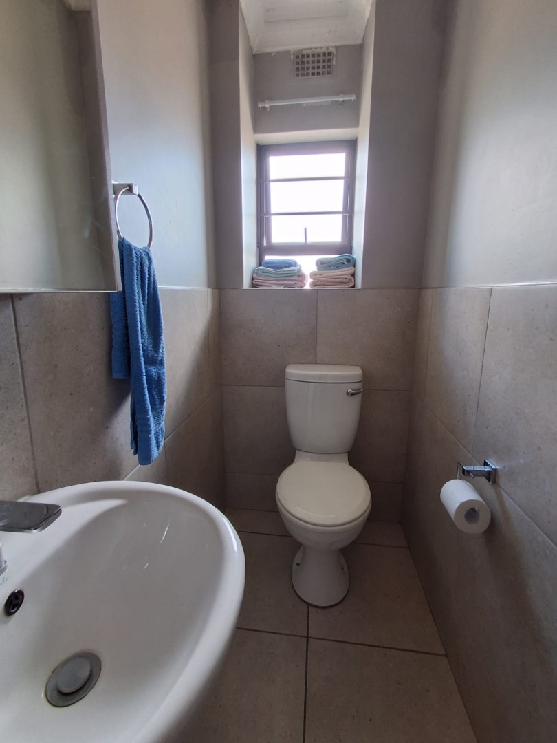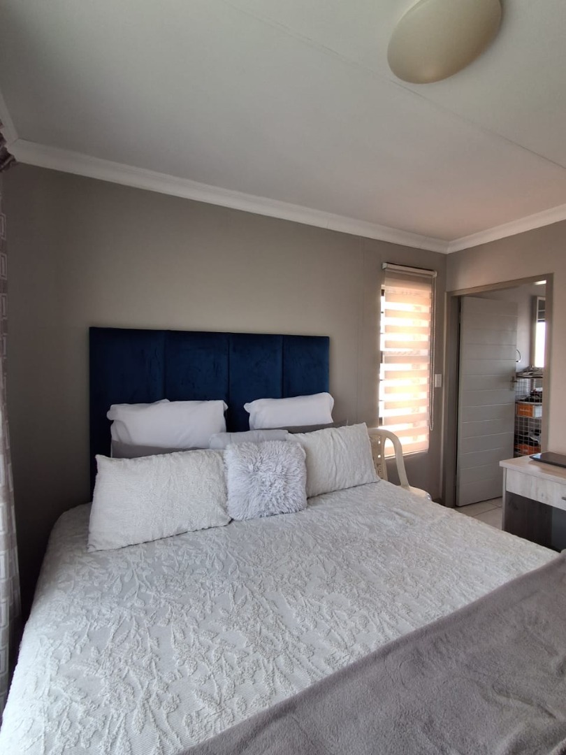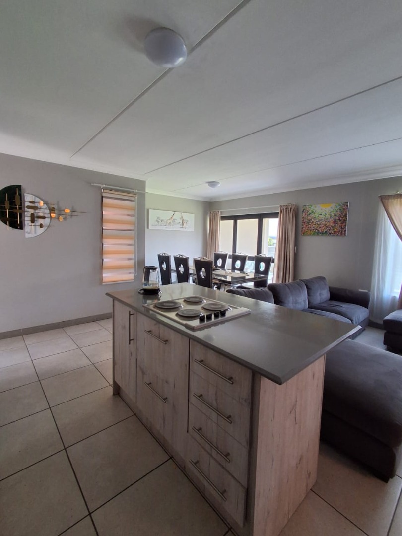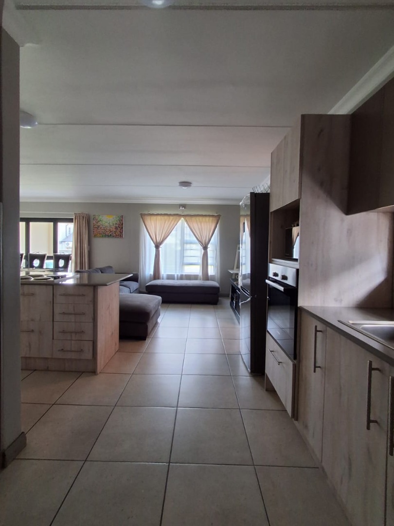 This modern two-story townhouse in Montana, Pretoria, offers an inviting open-plan layout. The living, dining, and kitchen areas flow seamlessly, featuring contemporary finishes, tiled flooring, and abundant natural light. The kitchen boasts modern cabinetry, an island with an integrated hob, and space for essential appliances.