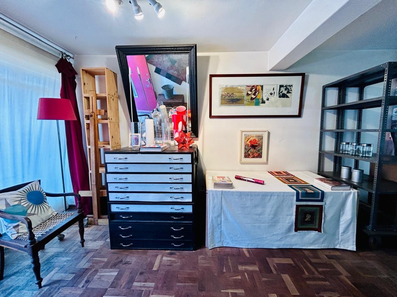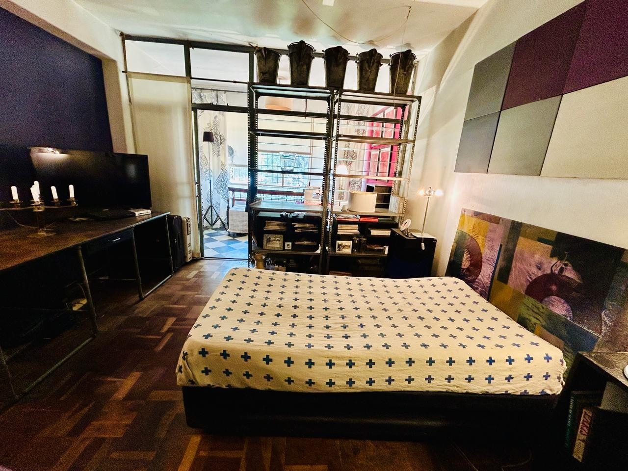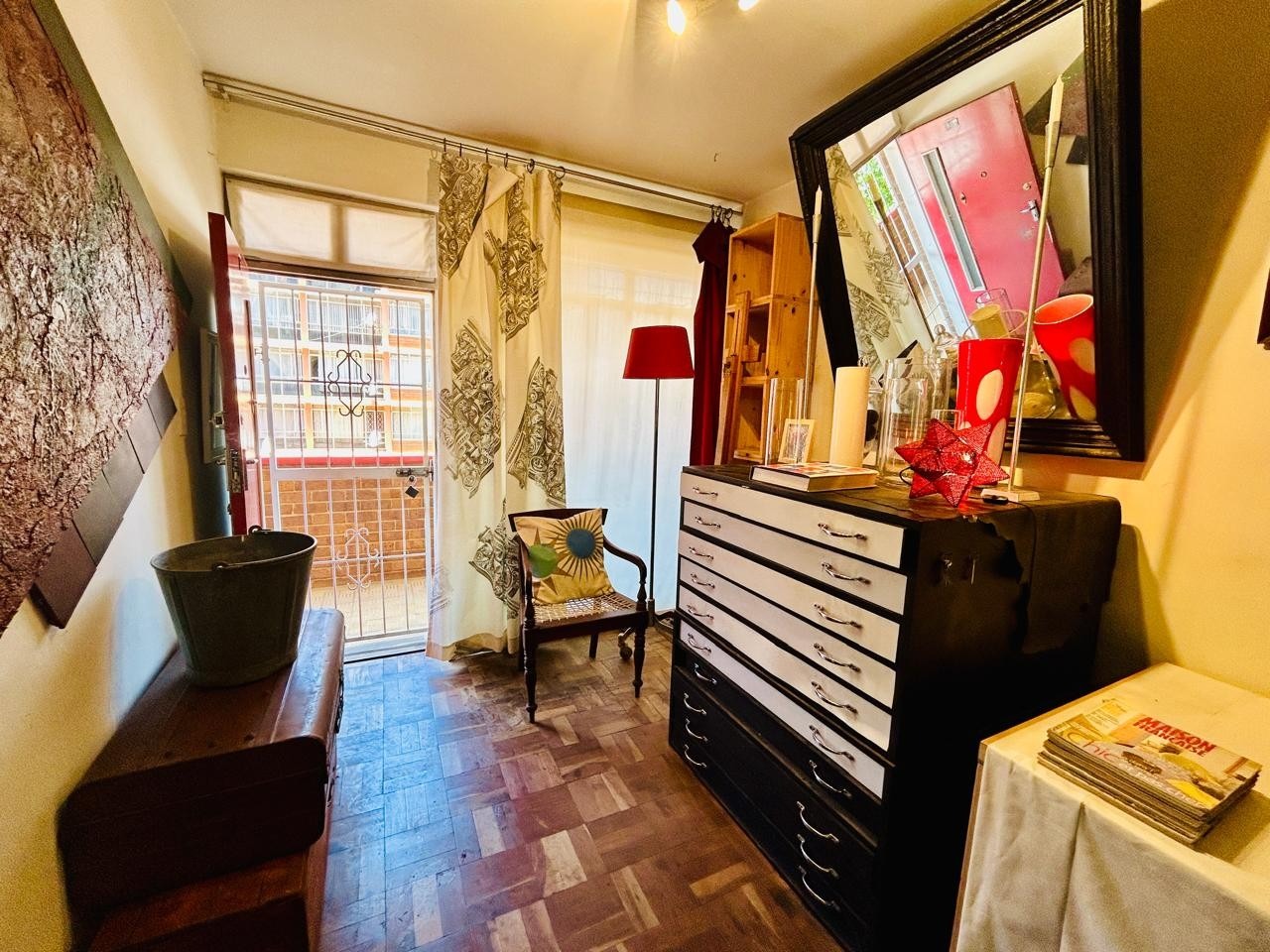 Inside, the apartment features a well-defined lounge and a separate dining room, both benefiting from natural light. The charming parquet flooring, visible throughout the main living areas and bedrooms, adds character to the space. While some areas showcase an eclectic decor, the high ceilings enhance the sense of openness. The functional kitchen is ready for your personal touch.
