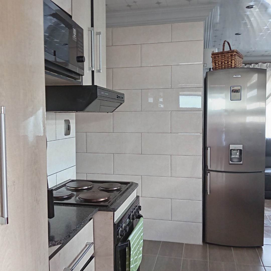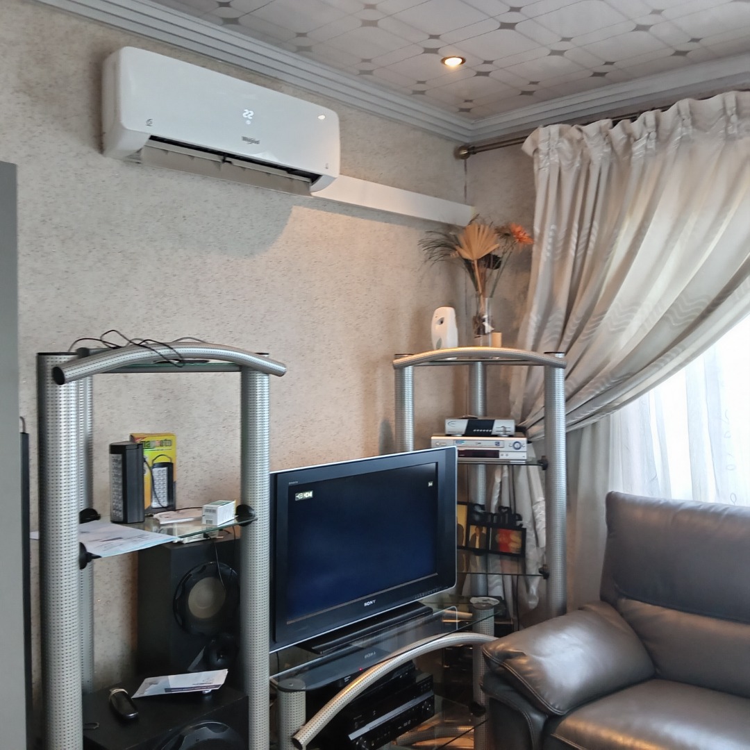 This inviting 3-bedroom, 2-bathroom residential property for sale in Nellmapius, Pretoria, offers comfortable suburban living. The interior layout is designed for practical family life, beginning with a spacious lounge area. This welcoming space is bathed in ample natural light from large windows, complemented by comfortable dark leather sofas and an air conditioning unit, ensuring a pleasant atmosphere year-round. The flow between living spaces supports both daily relaxation and entertaining.