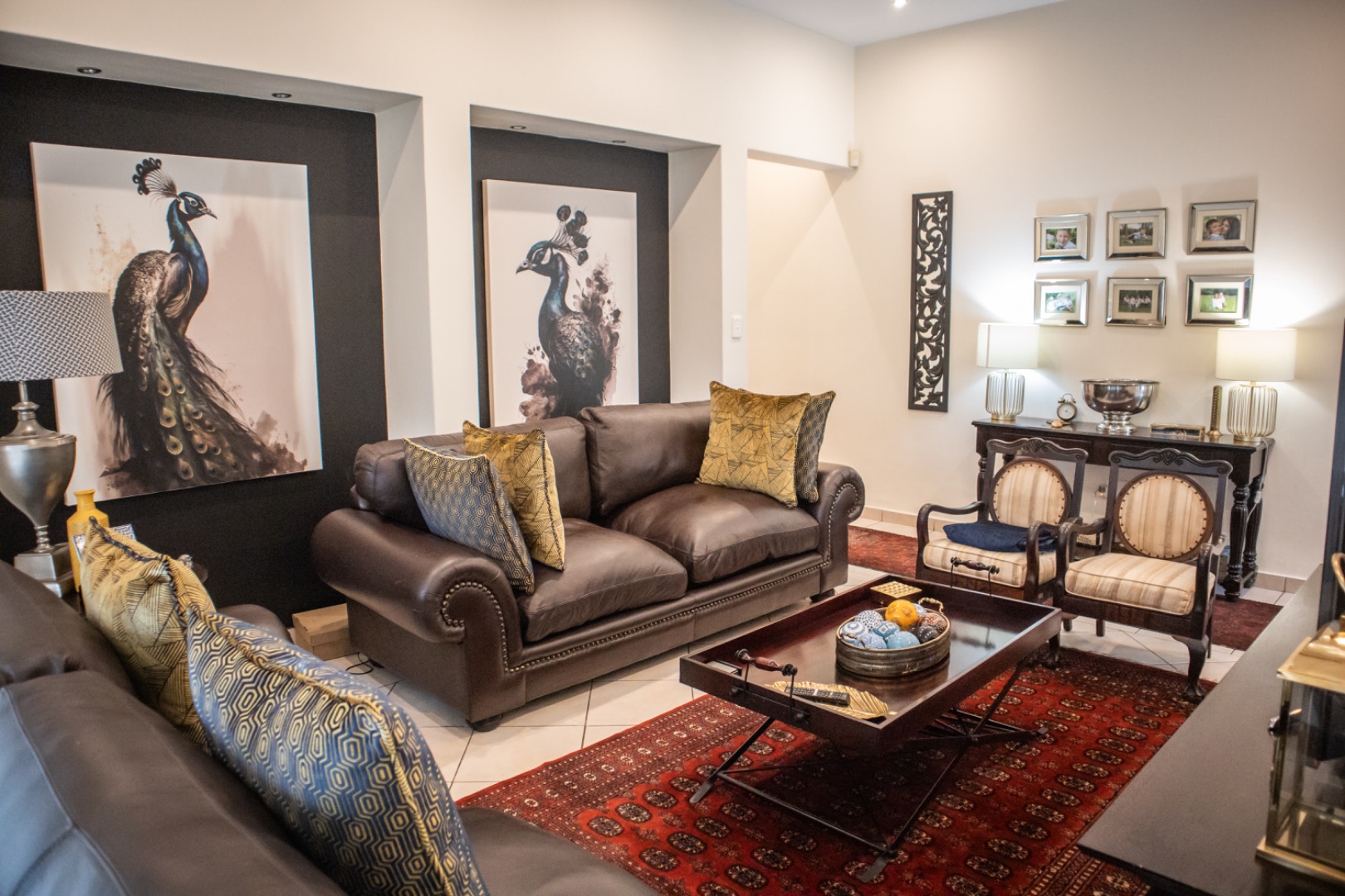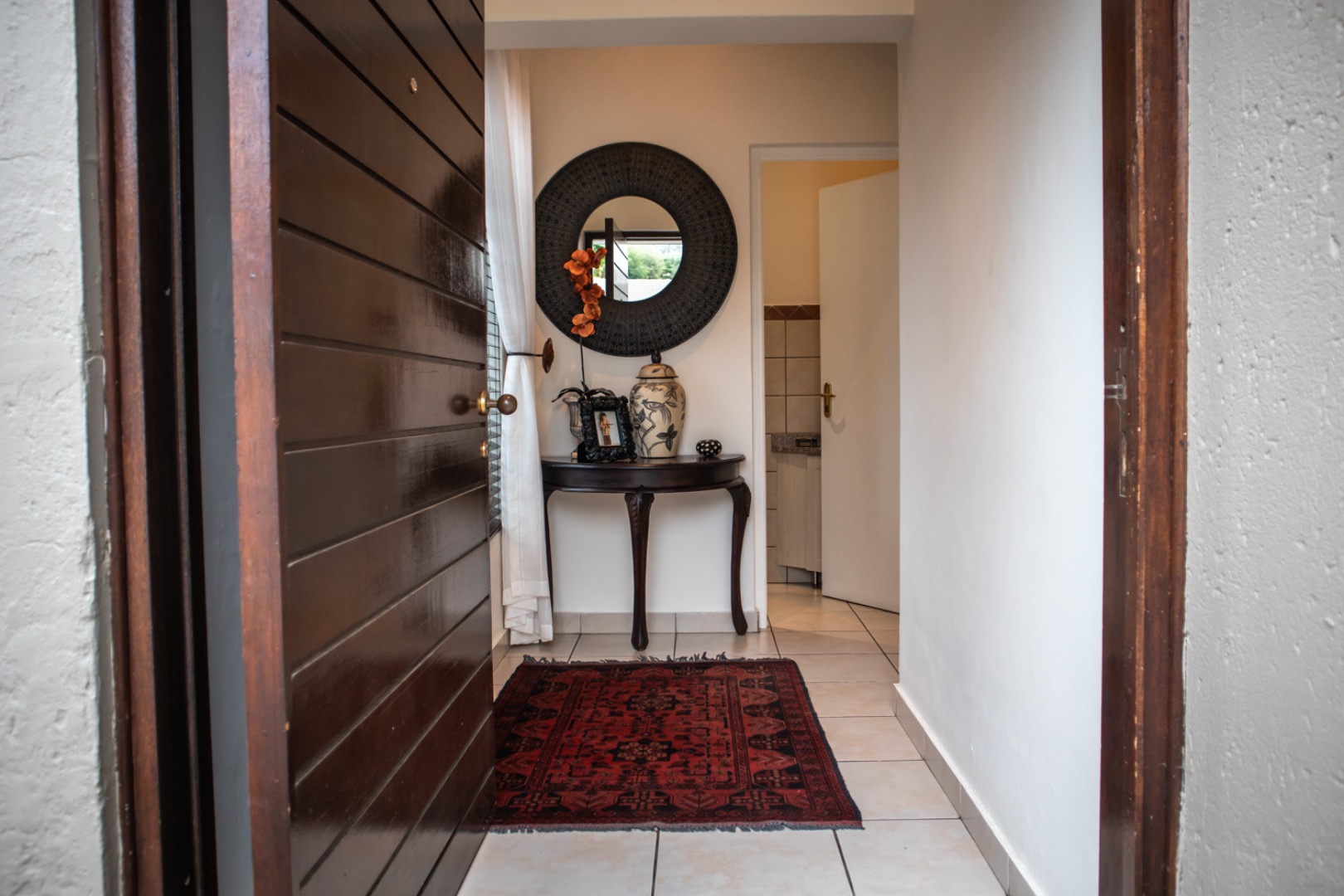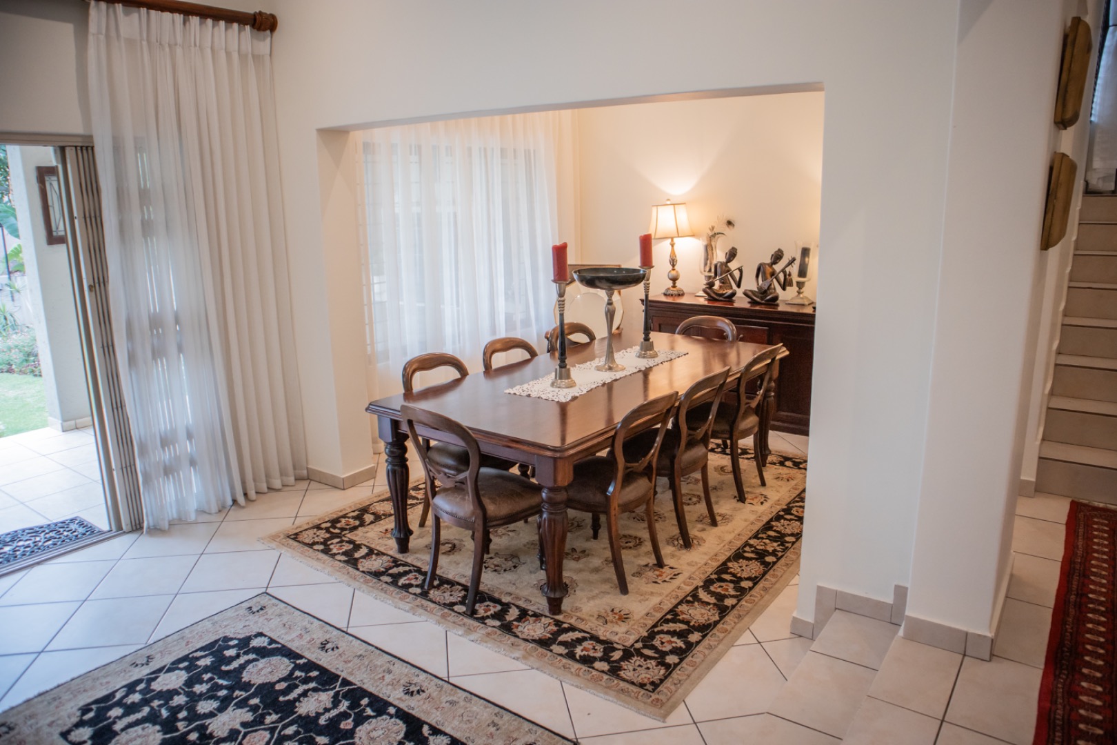 Step inside to an elegantly appointed interior spanning 288 sqm, where a welcoming entryway with decorative accents leads to expansive living areas. The home boasts a dedicated lounge and a formal dining room, both designed for refined entertaining and comfortable family life. Tiled flooring flows throughout, complemented by classic wooden furniture and tasteful artwork, creating an atmosphere of timeless elegance. The layout provides a seamless transition, with the dining area offering direct access to an outdoor space, perfect for al fresco dining and relaxation.
