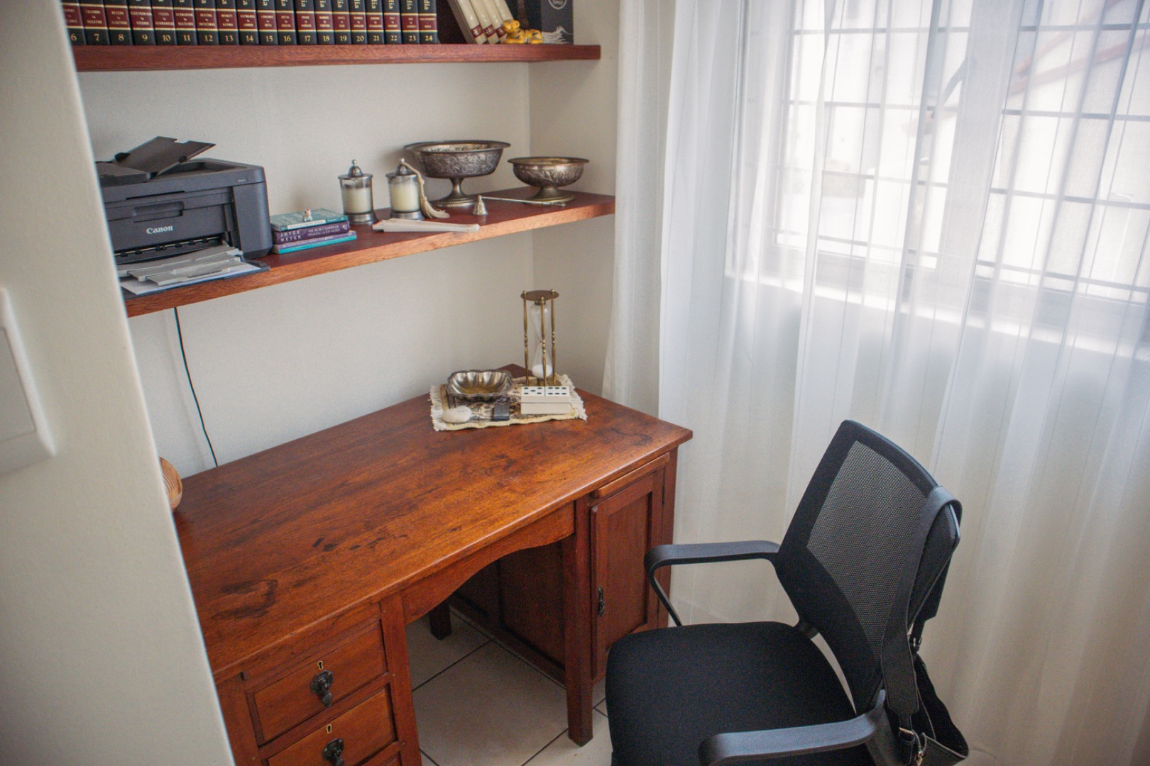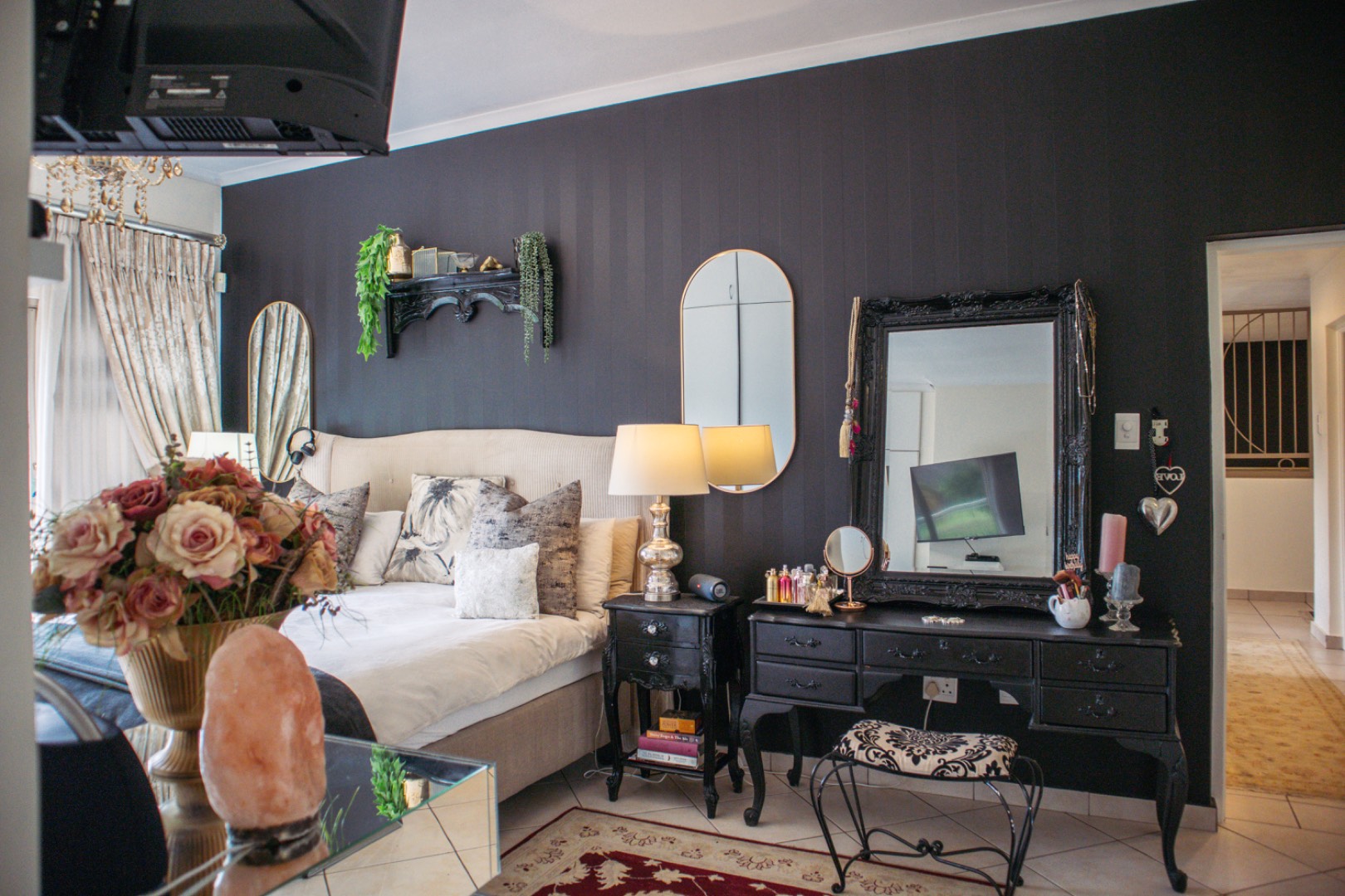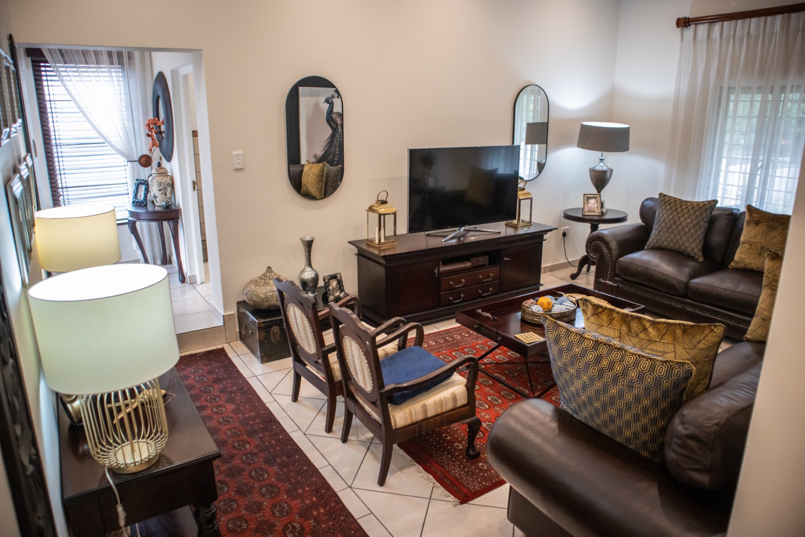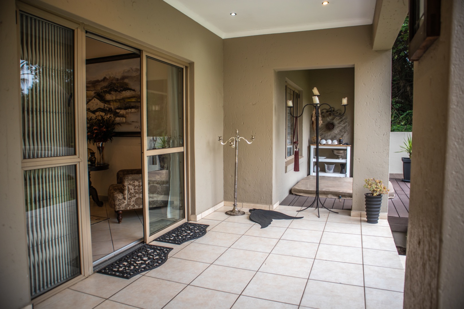 Step inside to an elegantly appointed interior spanning 288 sqm, where a welcoming entryway with decorative accents leads to expansive living areas. The home boasts a dedicated lounge and a formal dining room, both designed for refined entertaining and comfortable family life. Tiled flooring flows throughout, complemented by classic wooden furniture and tasteful artwork, creating an atmosphere of timeless elegance. The layout provides a seamless transition, with the dining area offering direct access to an outdoor space, perfect for al fresco dining and relaxation.