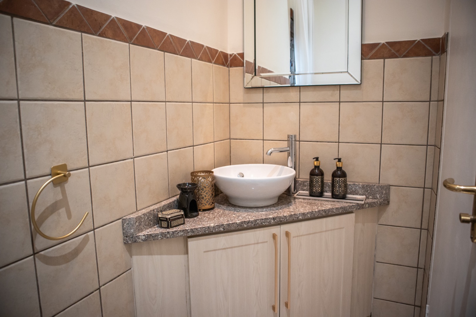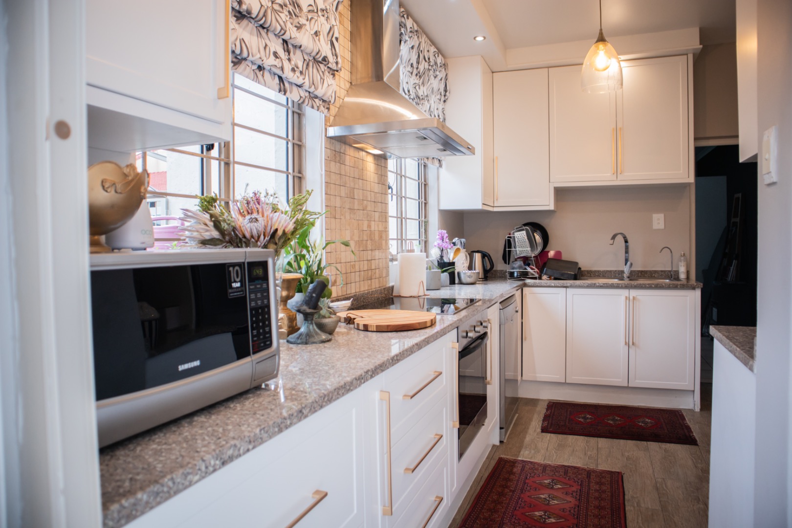 This magnificent home features three generously proportioned bedrooms, including a luxurious en-suite, alongside two and a half meticulously designed bathrooms. Each space is crafted for comfort and privacy, with modern fixtures such as a stylish vessel sink and granite countertops enhancing the contemporary appeal. The property also includes convenient staff quarters, adding to its practical amenities.