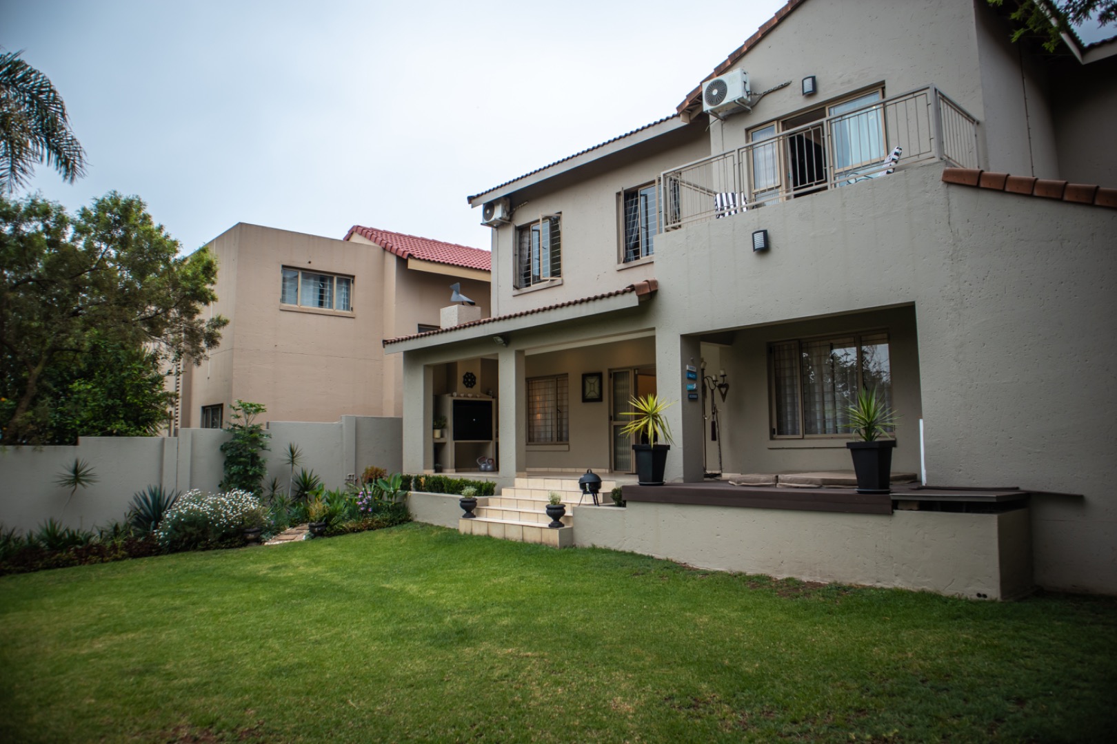 Discover an exquisite residence in the sought-after suburban enclave of North Riding, Randburg, South Africa, offering a harmonious blend of sophisticated living and robust security. This distinguished multi-level property immediately captivates with its modern exterior, traditional tiled roof, and a prominent double garage featuring attractive wooden doors, ensuring exceptional kerb appeal and a grand welcome.