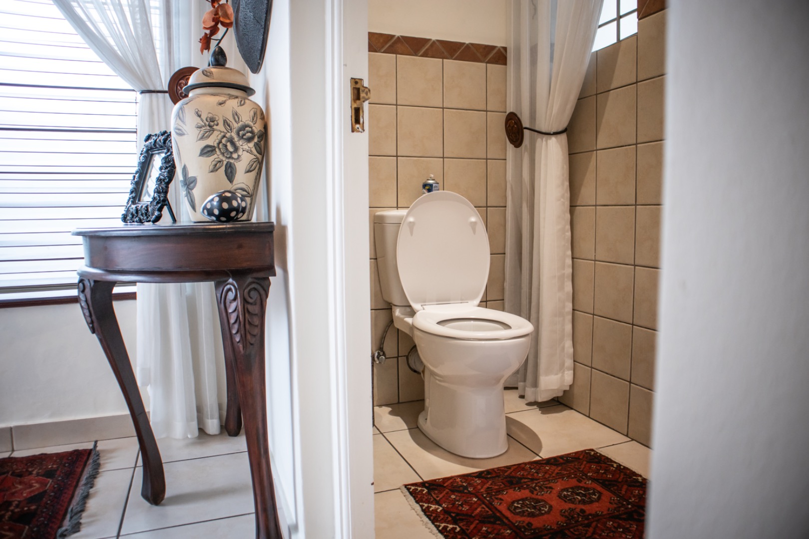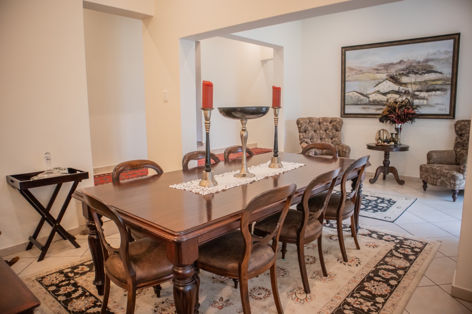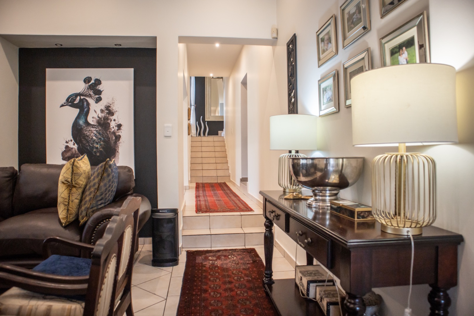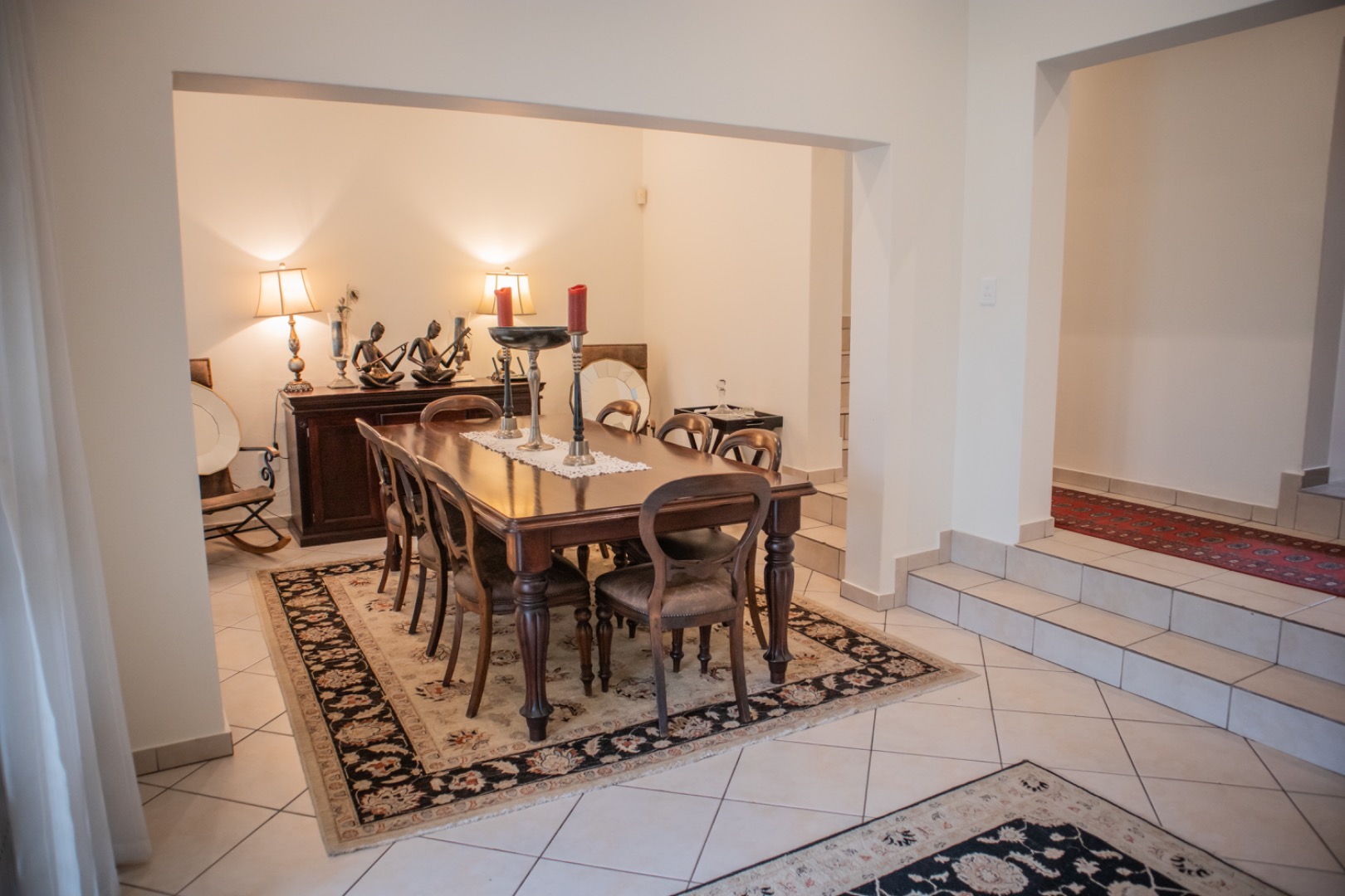 Step inside to an elegantly appointed interior spanning 288 sqm, where a welcoming entryway with decorative accents leads to expansive living areas. The home boasts a dedicated lounge and a formal dining room, both designed for refined entertaining and comfortable family life. Tiled flooring flows throughout, complemented by classic wooden furniture and tasteful artwork, creating an atmosphere of timeless elegance. The layout provides a seamless transition, with the dining area offering direct access to an outdoor space, perfect for al fresco dining and relaxation.