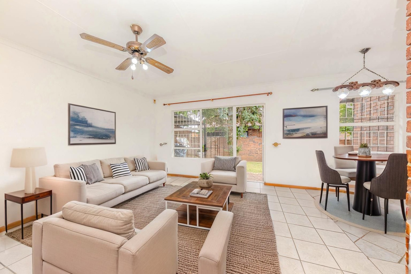 From the moment you arrive, you’ll be greeted by a cobblestone driveway leading to a single garage and covered carport, framed by lush gardens and mature trees that create a calm and welcoming atmosphere. Inside, the home opens into a spacious, light-filled living area where neutral tiled flooring and large windows invite natural light and enhance the home’s airy ambiance. Tasteful exposed brick accents lend a rustic charm that complements the bright and airy layout.