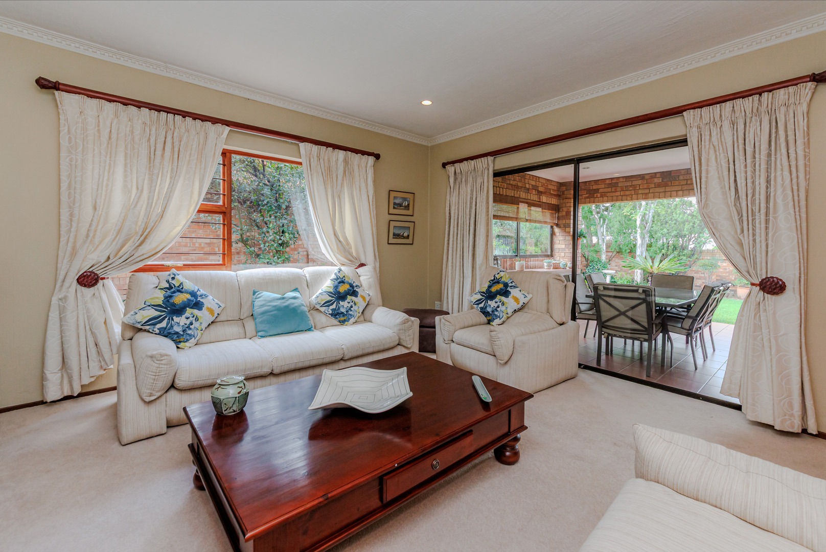 The interior boasts an inviting open-plan layout, seamlessly connecting two lounges and a dedicated dining room, ideal for both relaxation and entertaining. Large sliding glass doors provide abundant natural light and direct access to the garden. The home comprises two generously proportioned bedrooms, including a master suite with an en-suite bathroom, complemented by a second well-appointed bathroom. A functional kitchen with a pantry completes the internal amenities.