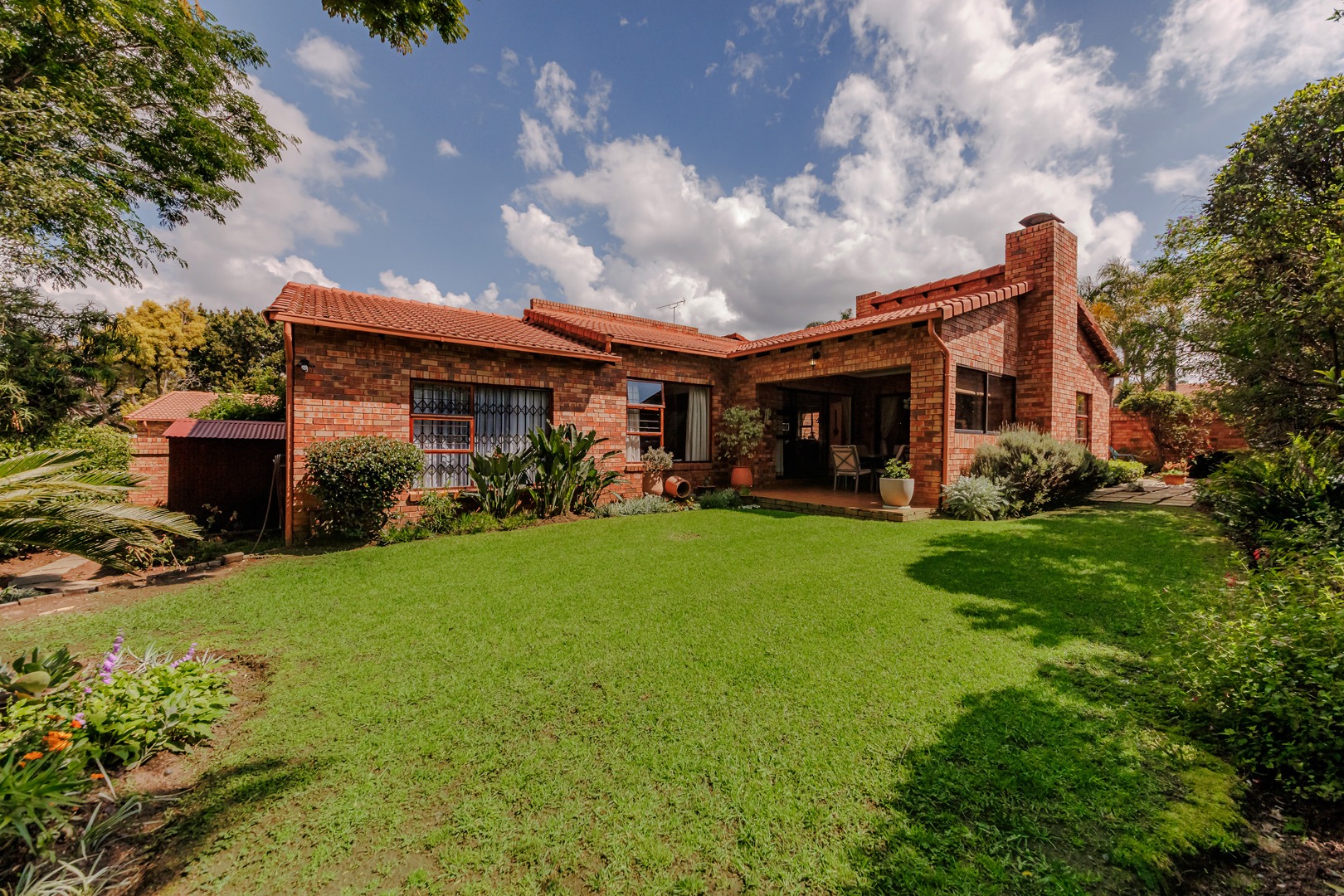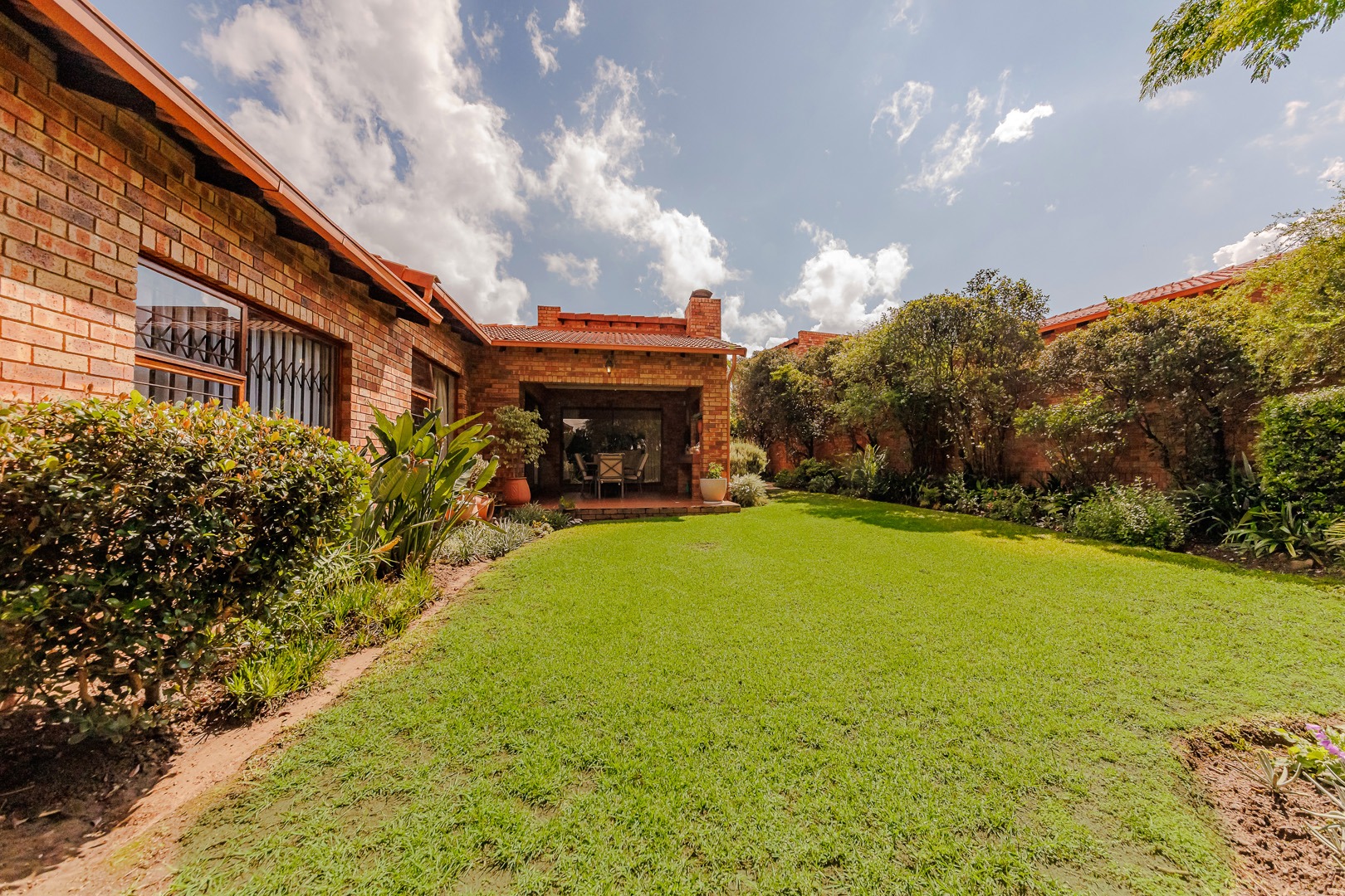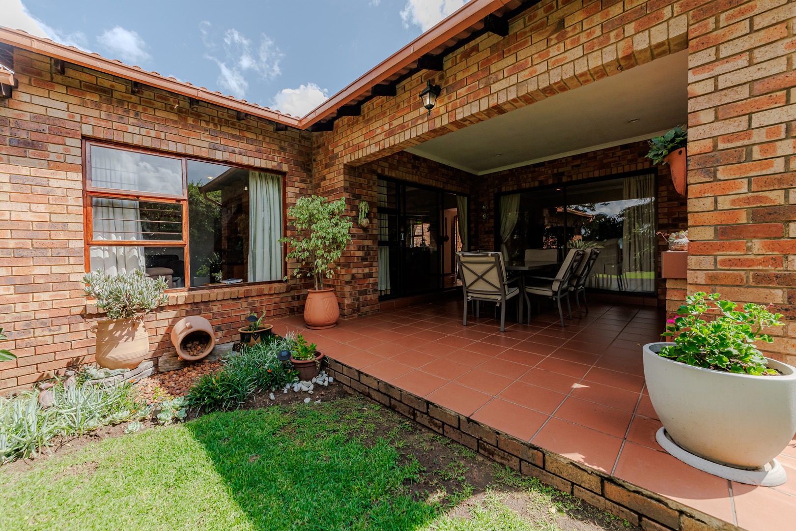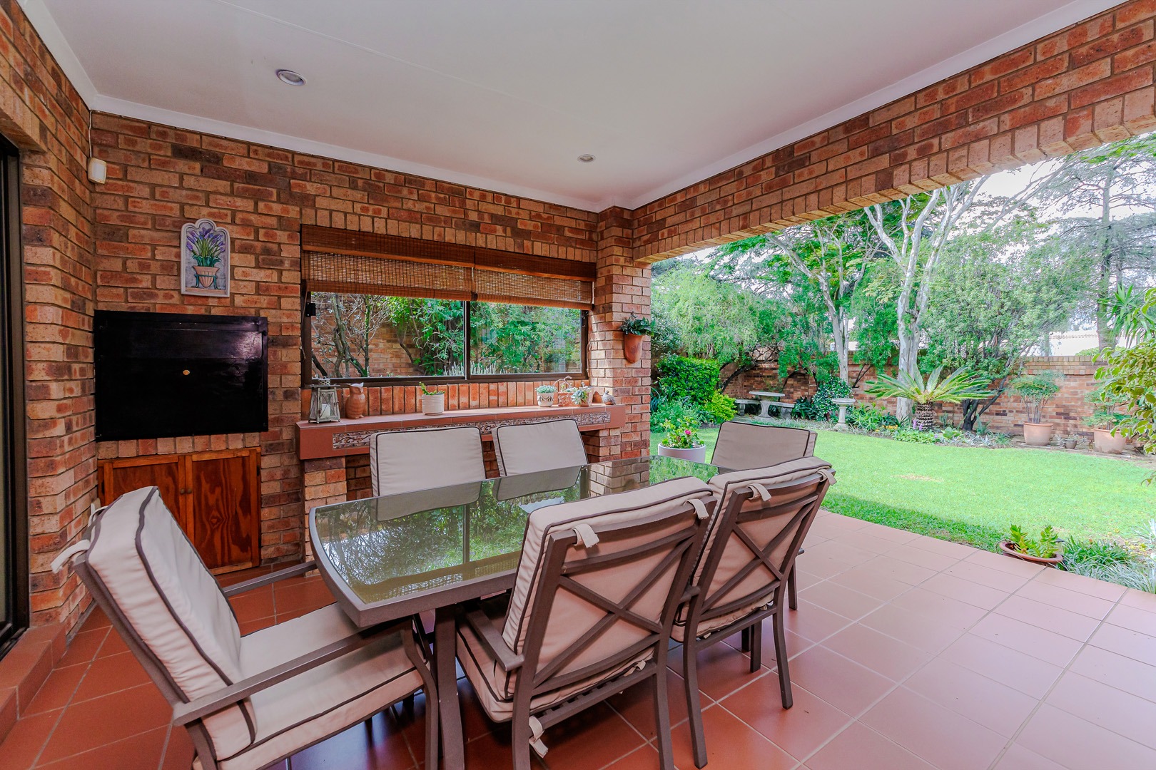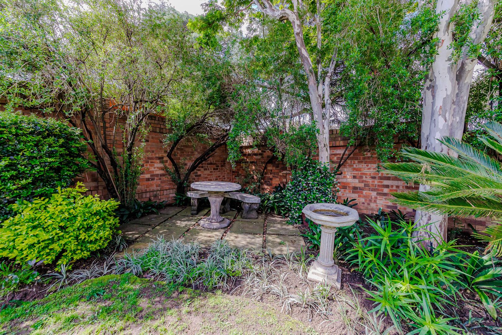 The outdoor area features a charming covered patio, perfect for al fresco dining, overlooking the established garden. A built-in braai and dedicated braai room enhance entertainment possibilities, and pets are permitted. Security is prioritised with an alarm system, intercom, burglar bars, and the inherent safety of a complex with an access gate.