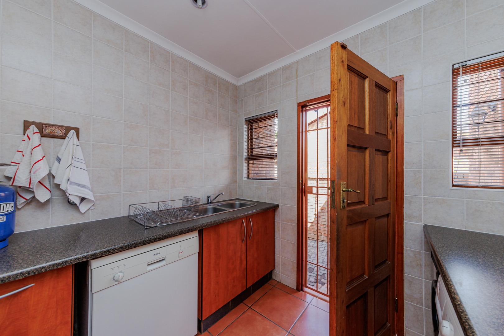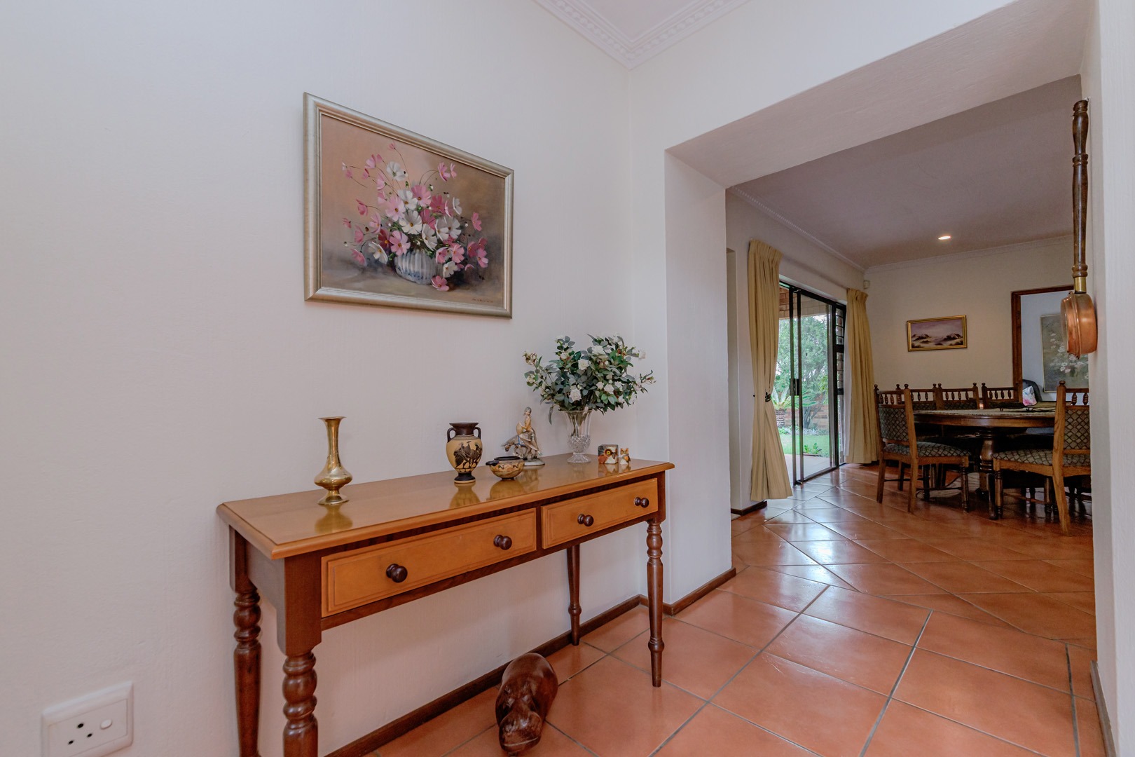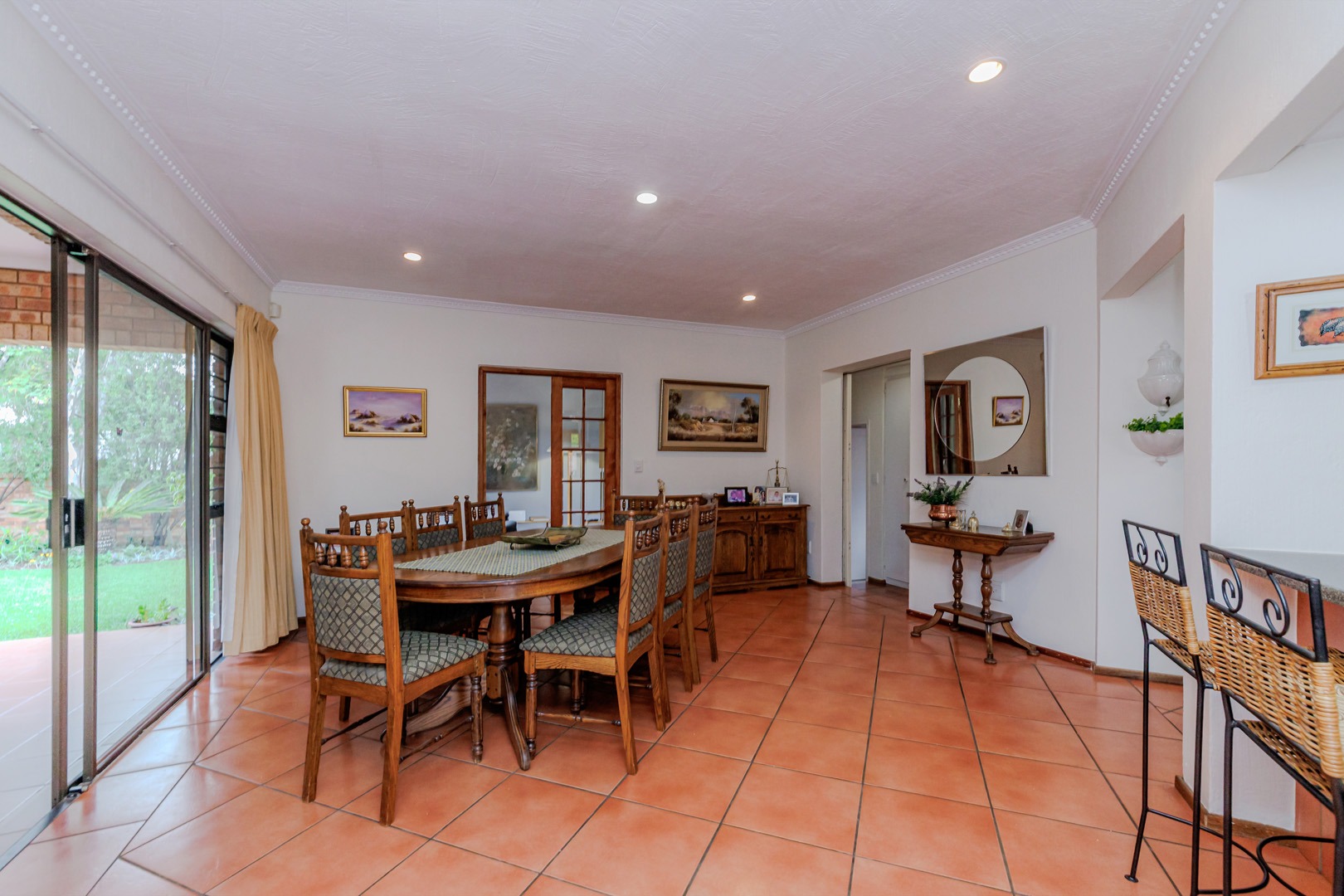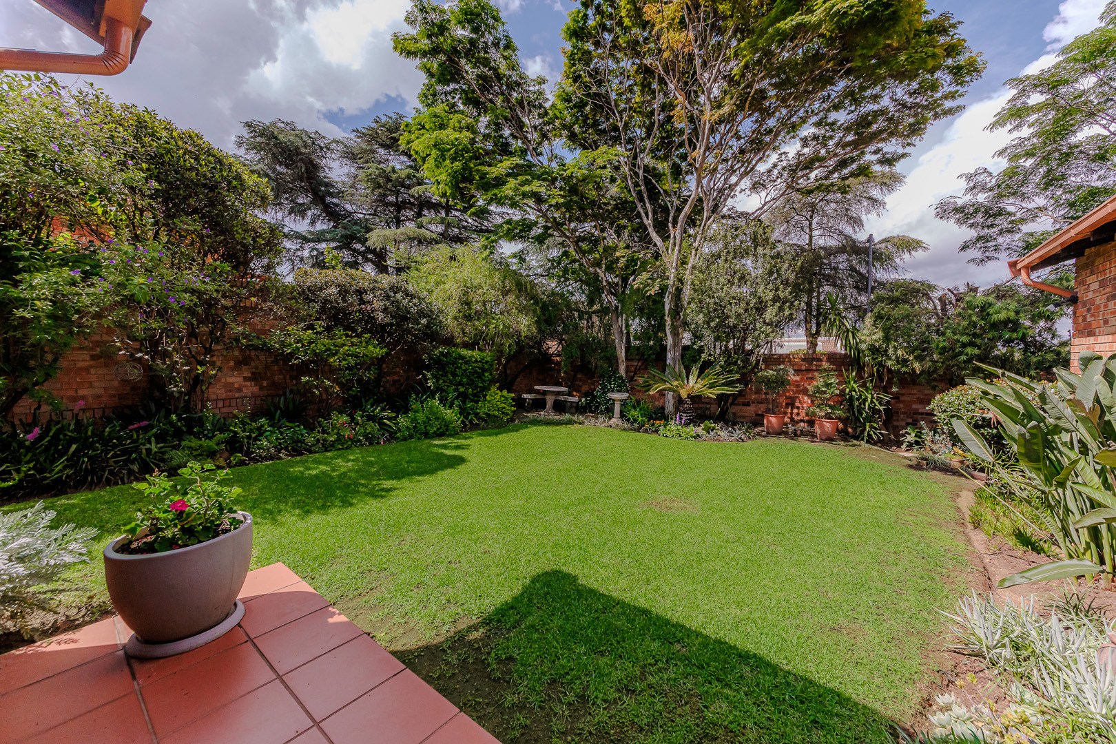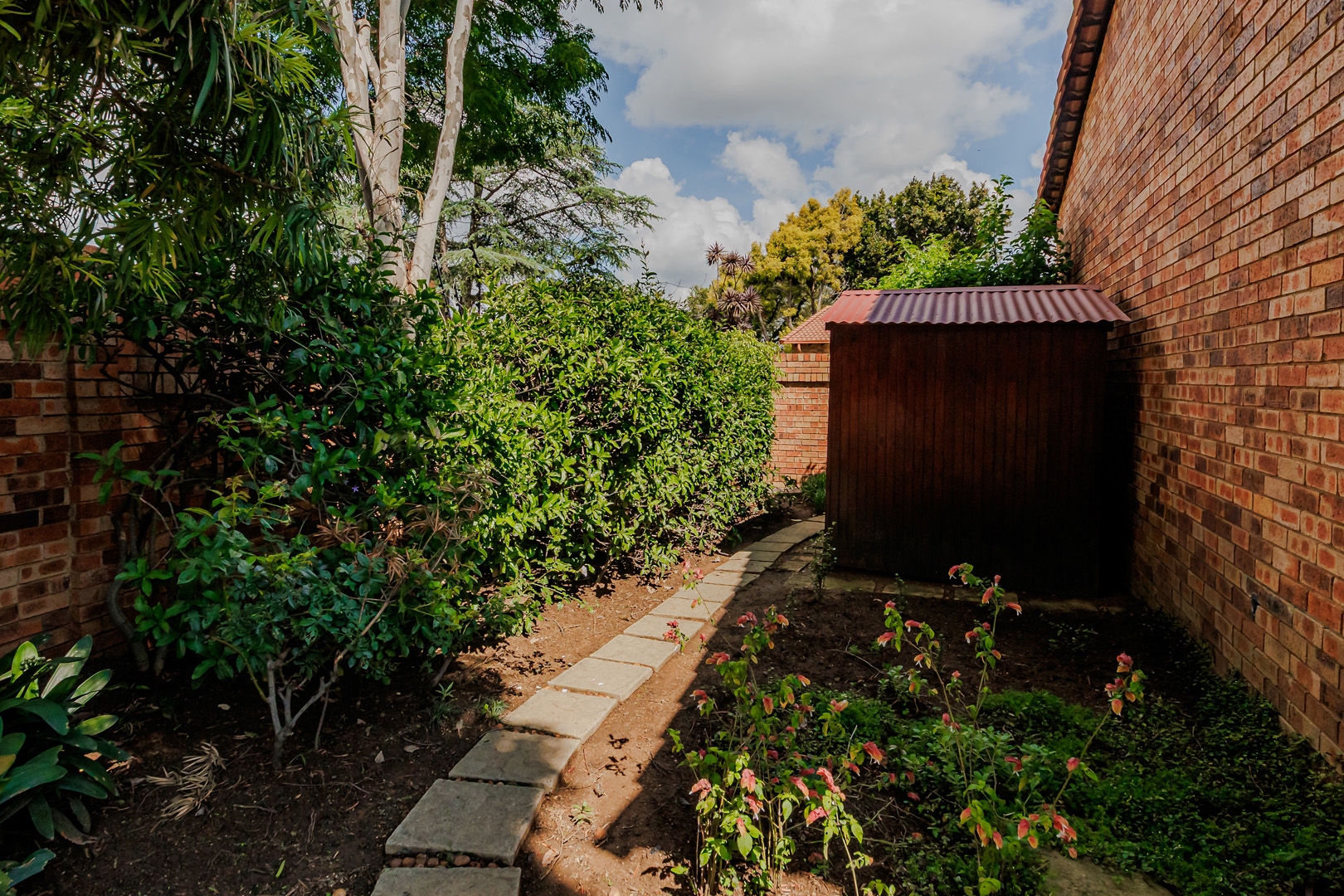 The outdoor area features a charming covered patio, perfect for al fresco dining, overlooking the established garden. A built-in braai and dedicated braai room enhance entertainment possibilities, and pets are permitted. Security is prioritised with an alarm system, intercom, burglar bars, and the inherent safety of a complex with an access gate.