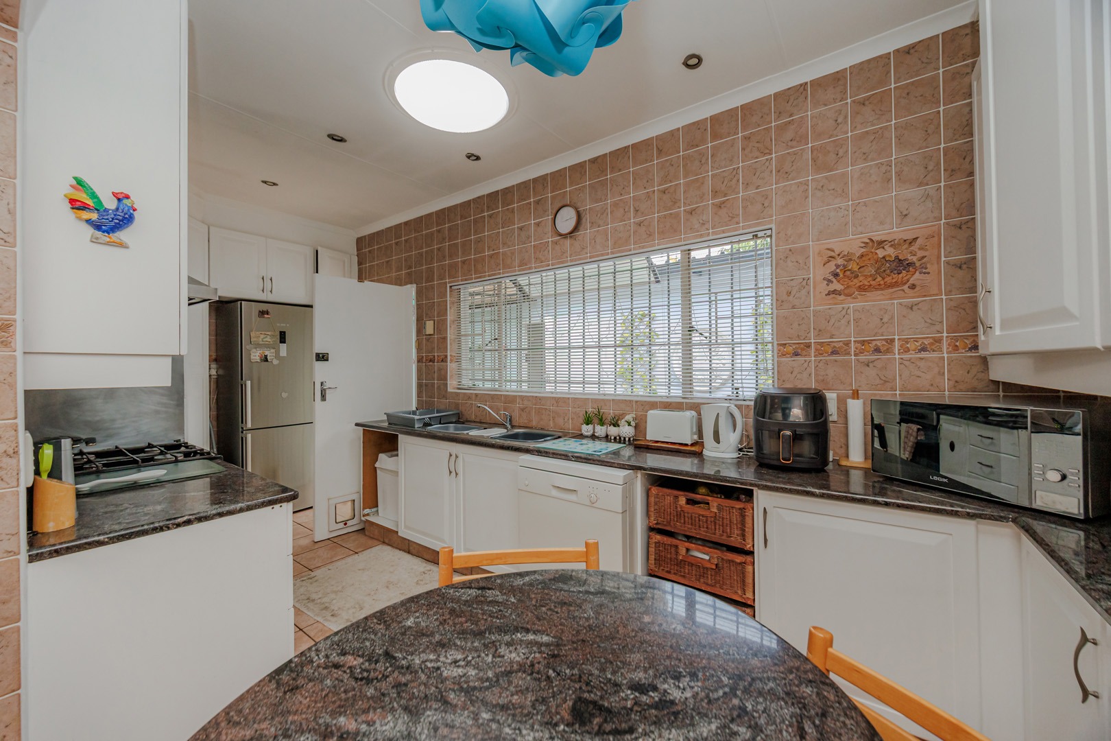 The heart of this home is its well-appointed kitchen, featuring crisp white cabinetry and durable granite countertops. Equipped with a modern gas stove, extractor fan, and a practical double sink, it provides extensive storage and preparation space. A compact breakfast nook offers a convenient spot for casual dining, all bathed in natural light from a large window. Seamlessly connected, the spacious living and dining areas boast easy-to-maintain tiled flooring and benefit from abundant natural light, with sliding doors providing direct access to an outdoor patio, perfect for indoor-outdoor living and entertaining.