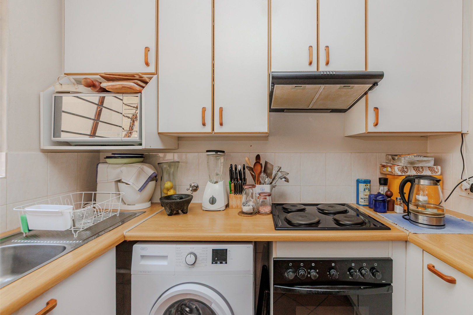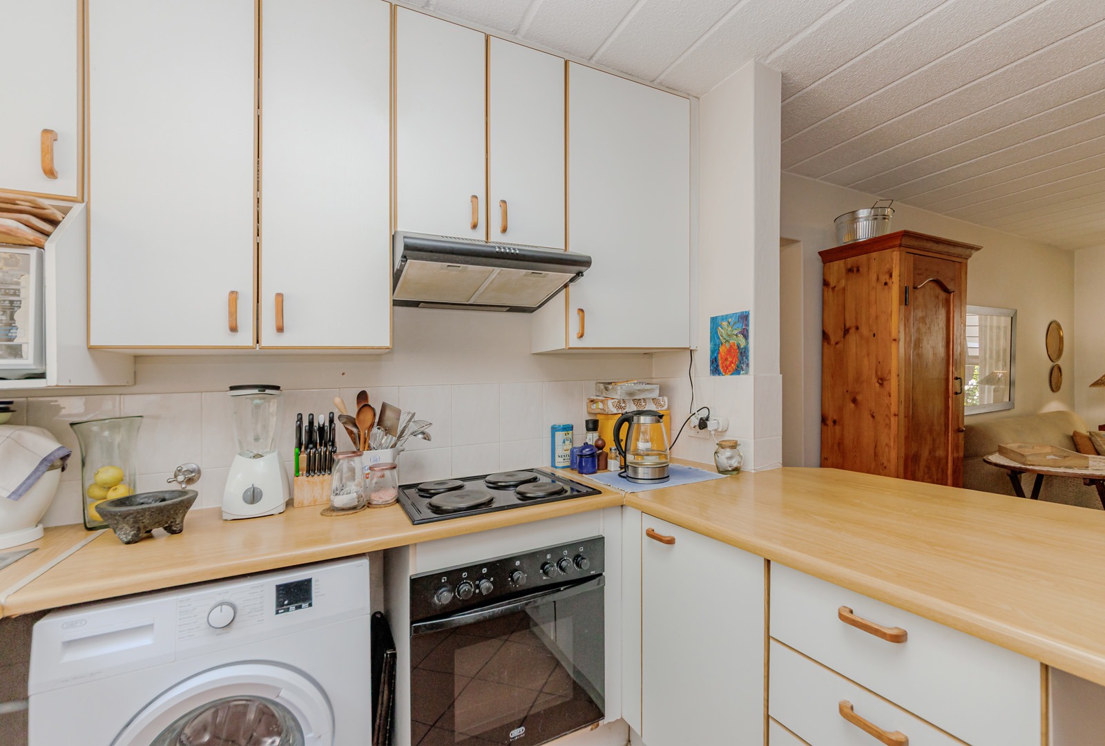 At the heart of the home is a stylish and functional kitchen that complements the open-plan design. Fitted with crisp white cabinetry and light wood-look countertops, it also includes a convenient breakfast bar that doubles as a casual dining area or additional workspace. The kitchen comes equipped with essential appliances such as a stove, extractor fan, fridge, and washing machine—making it move-in ready and perfect for everyday convenience.