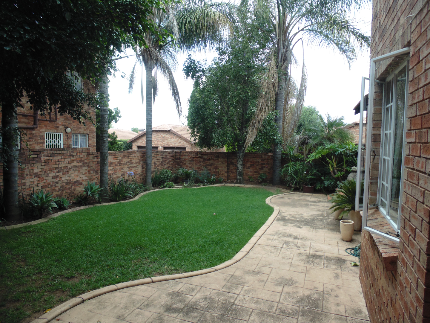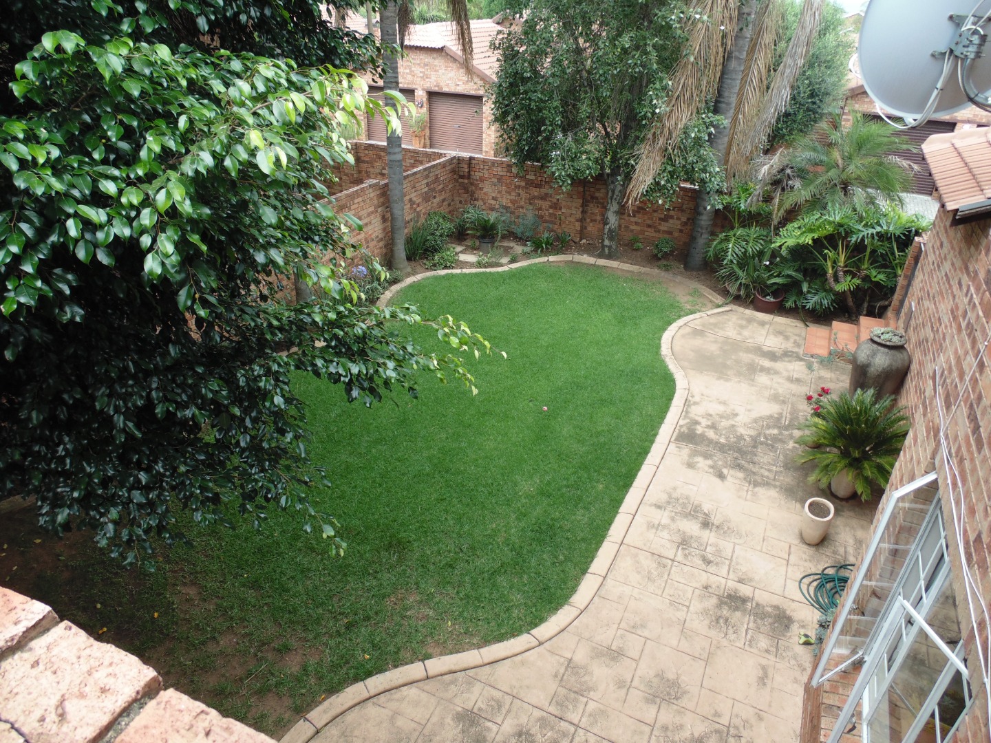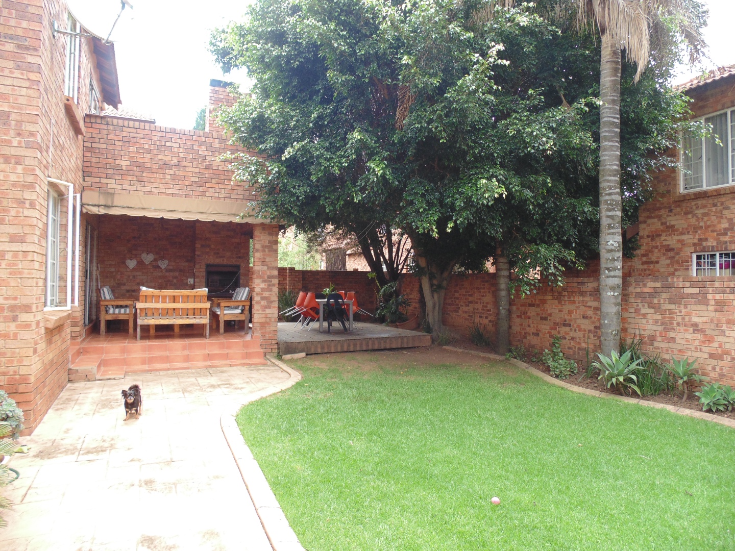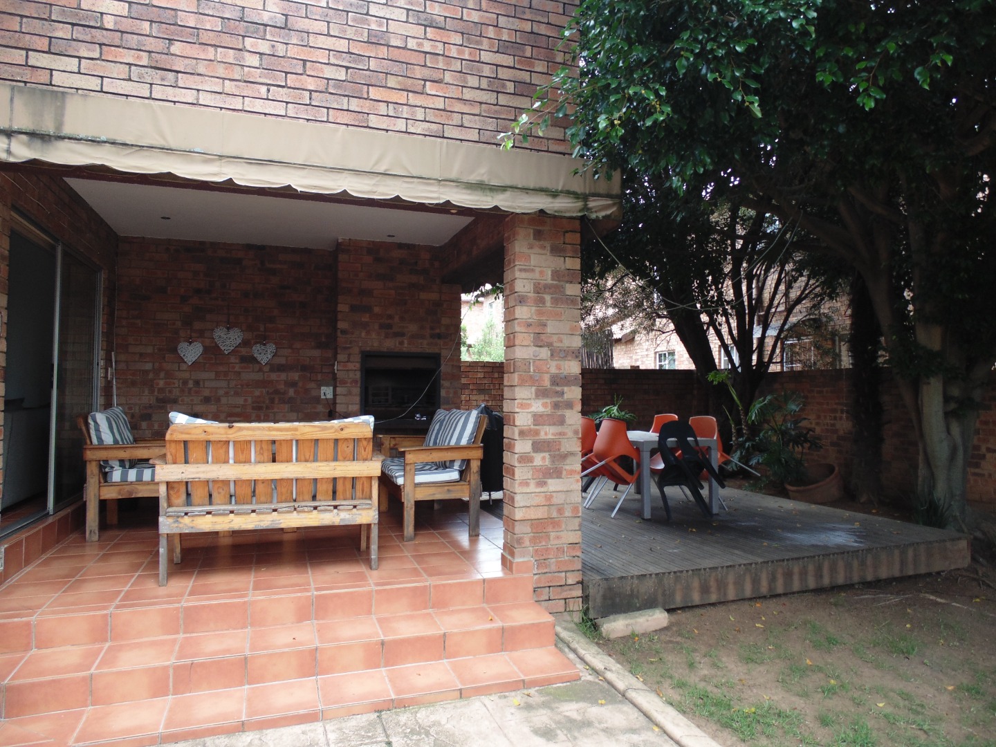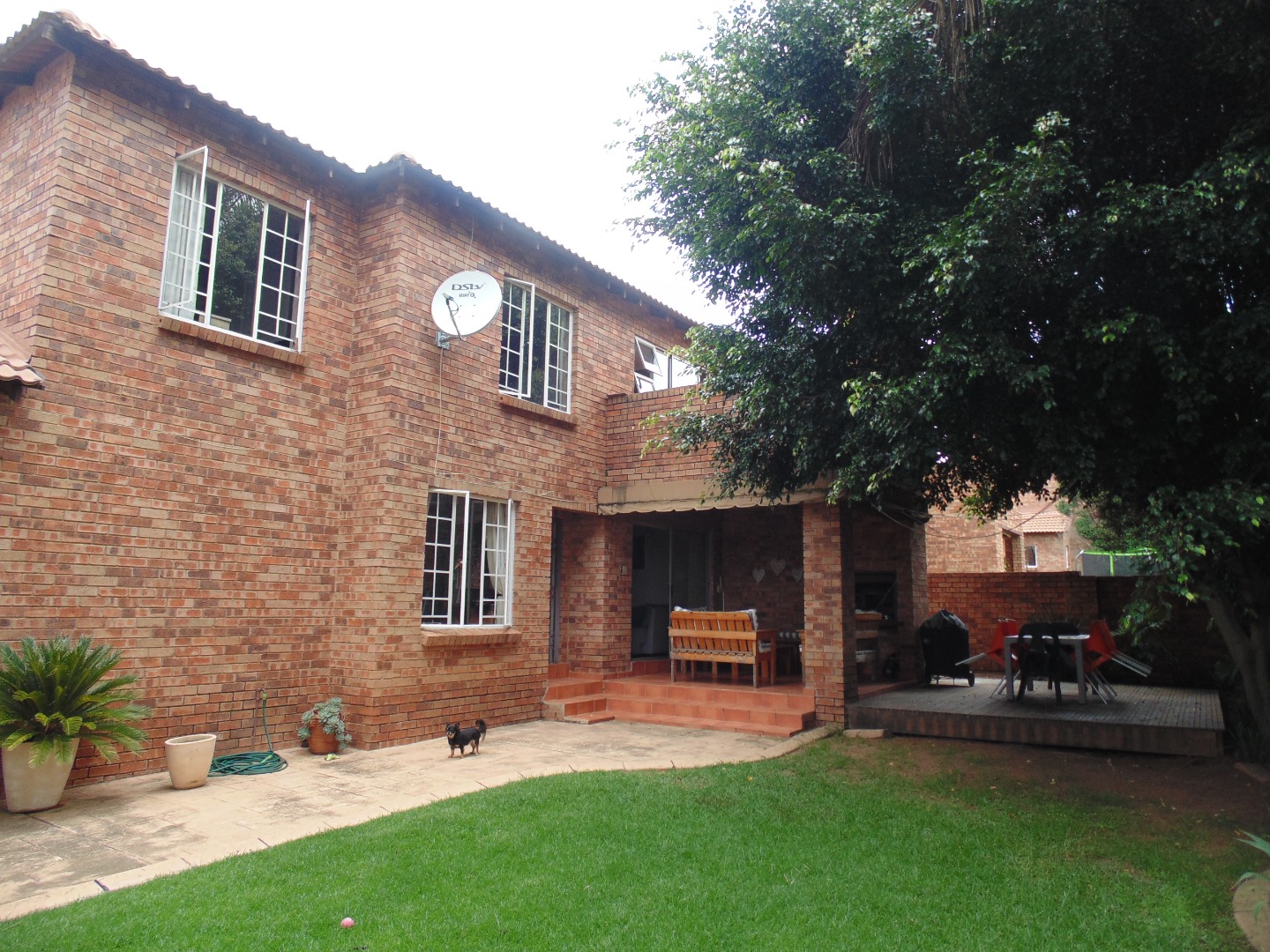 This charming residential property in Sundowner, Randburg, features a durable two-story brick construction. The exterior boasts a well-maintained garden with mature trees providing natural shade, creating a private and established atmosphere. A covered patio with a built-in braai and an adjacent wooden deck offer versatile outdoor seating and dining areas, perfect for entertaining. High brick walls enhance privacy, complemented by burglar bars on windows for added security.