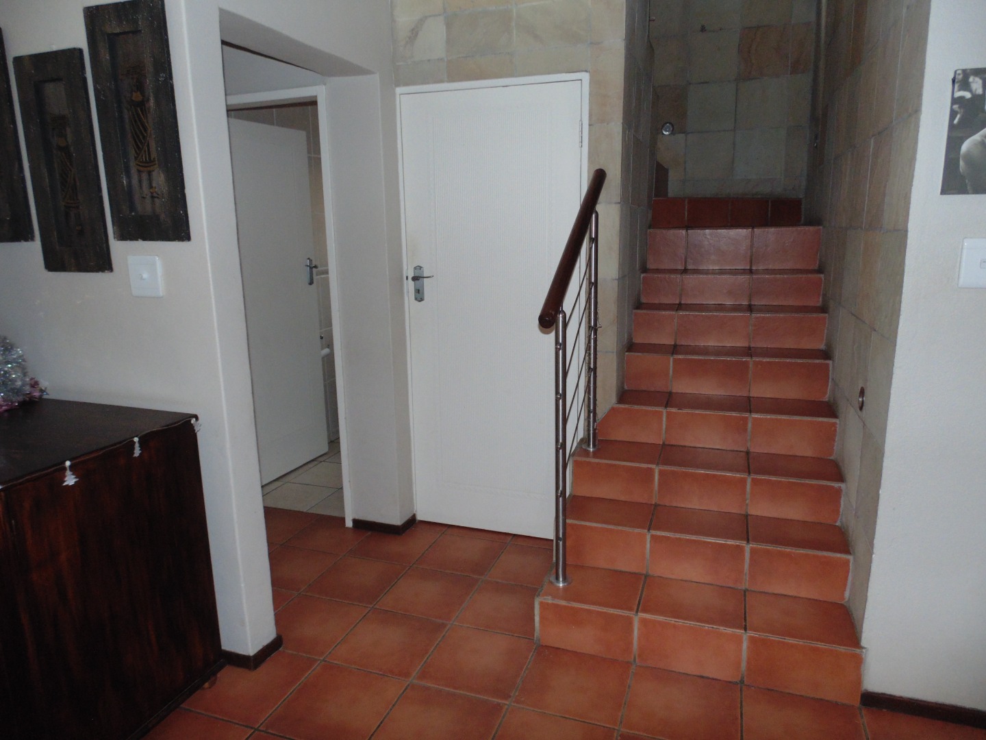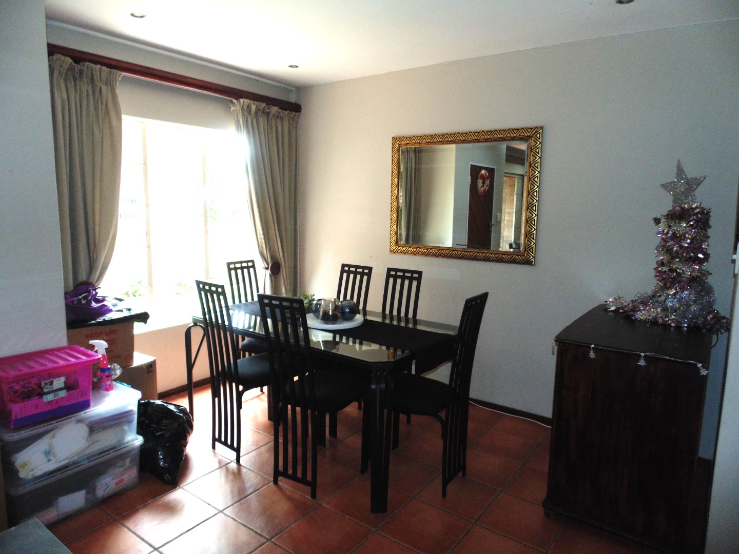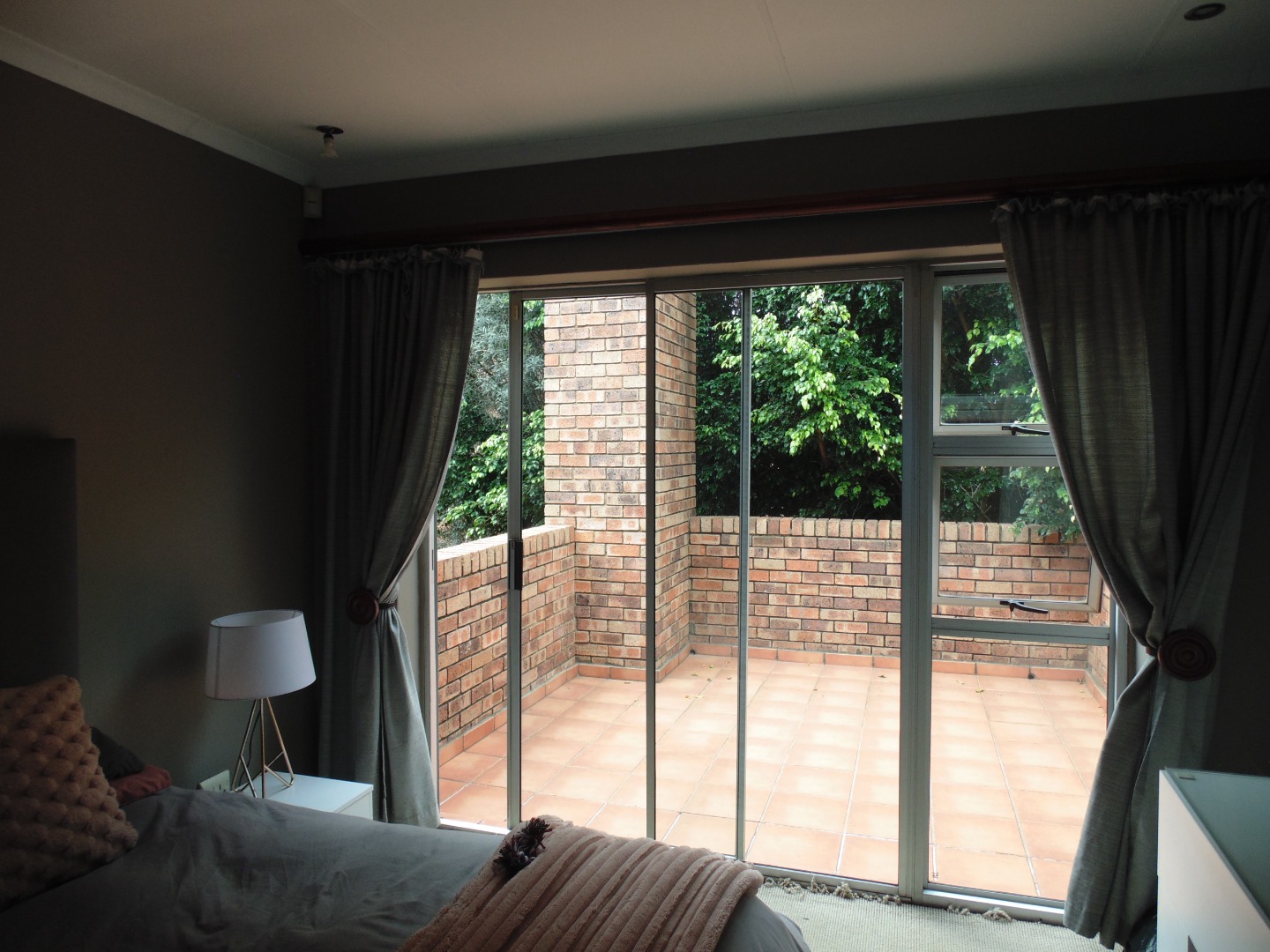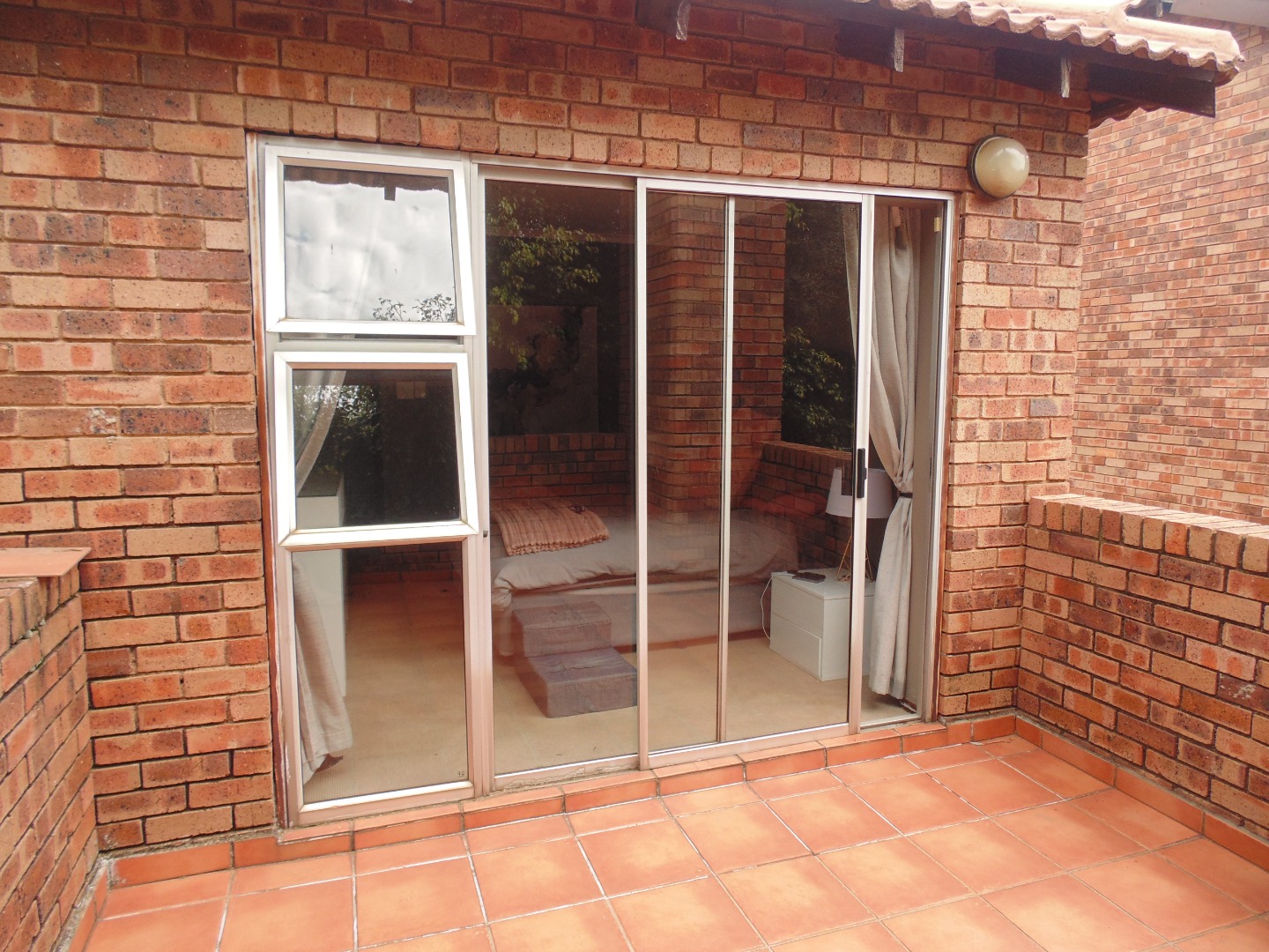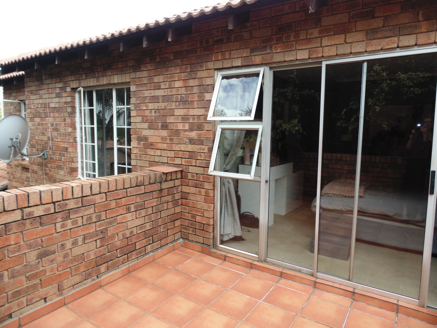 This charming residential property in Sundowner, Randburg, features a durable two-story brick construction. The exterior boasts a well-maintained garden with mature trees providing natural shade, creating a private and established atmosphere. A covered patio with a built-in braai and an adjacent wooden deck offer versatile outdoor seating and dining areas, perfect for entertaining. High brick walls enhance privacy, complemented by burglar bars on windows for added security.