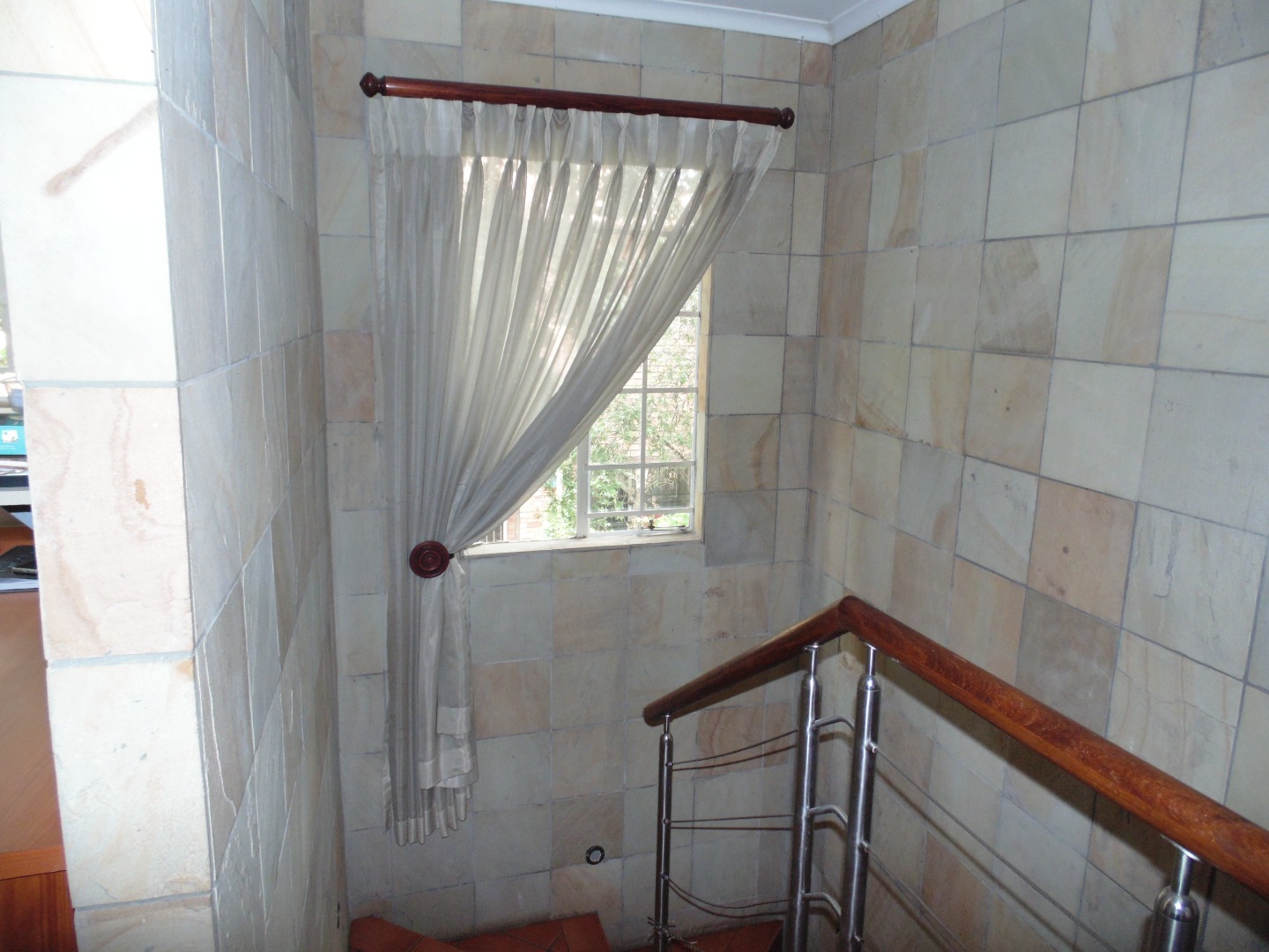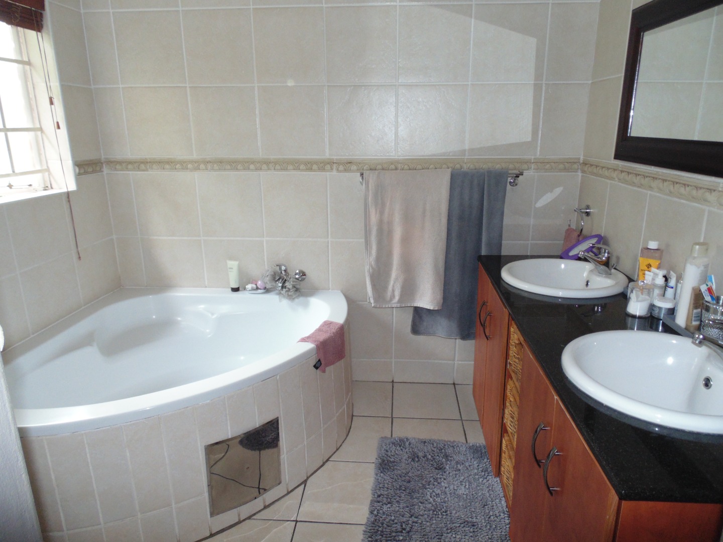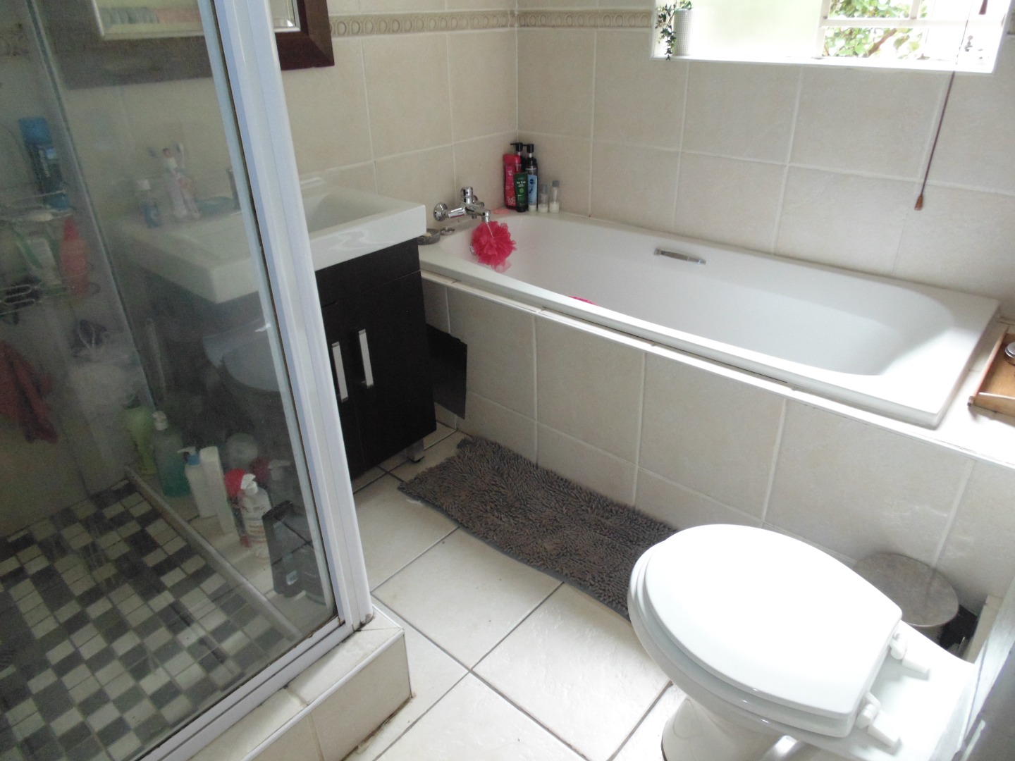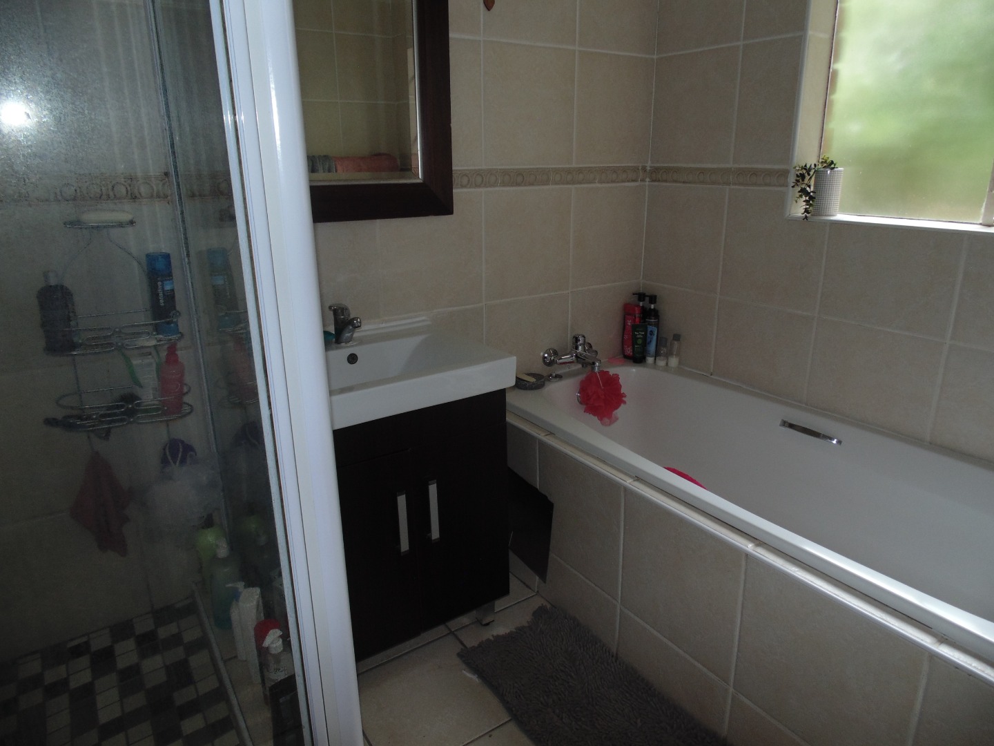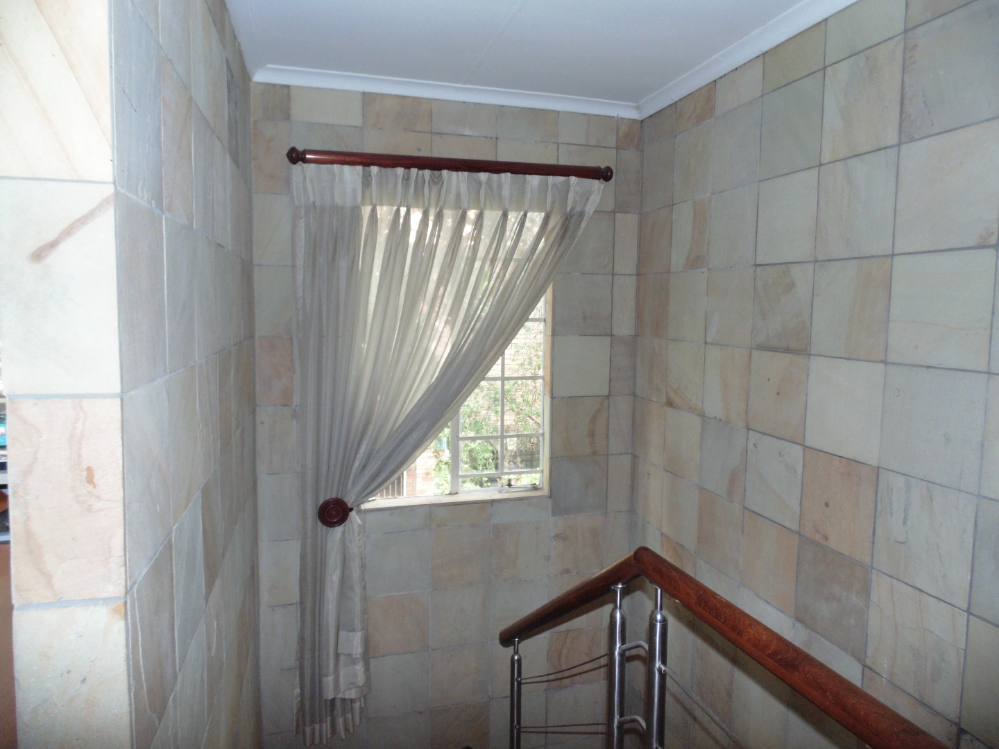 This charming residential property in Sundowner, Randburg, features a durable two-story brick construction. The exterior boasts a well-maintained garden with mature trees providing natural shade, creating a private and established atmosphere. A covered patio with a built-in braai and an adjacent wooden deck offer versatile outdoor seating and dining areas, perfect for entertaining. High brick walls enhance privacy, complemented by burglar bars on windows for added security.