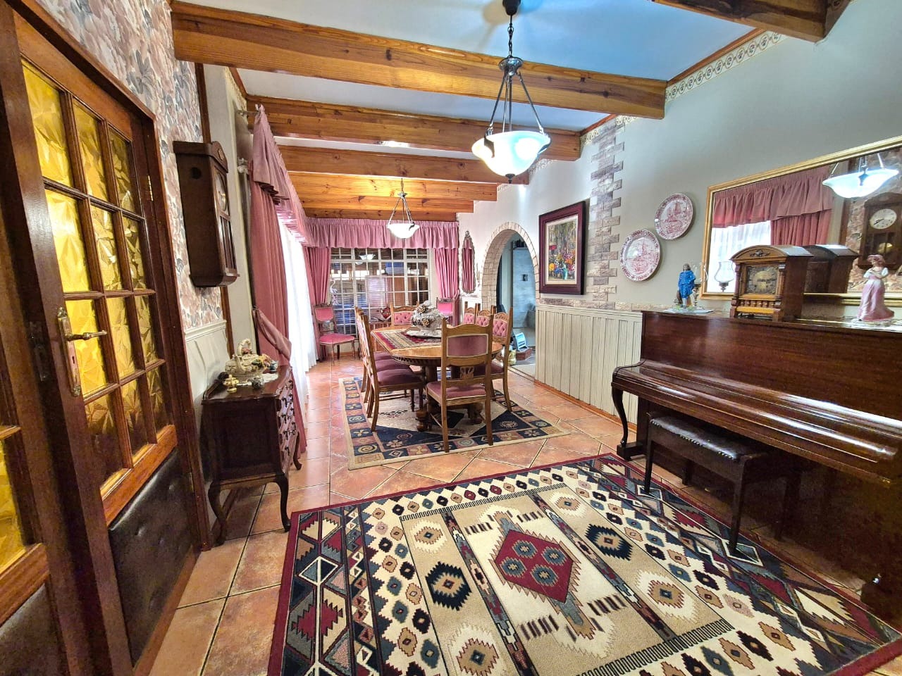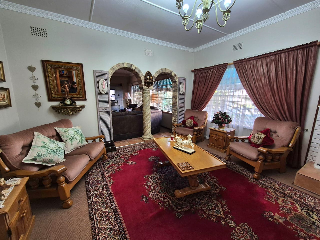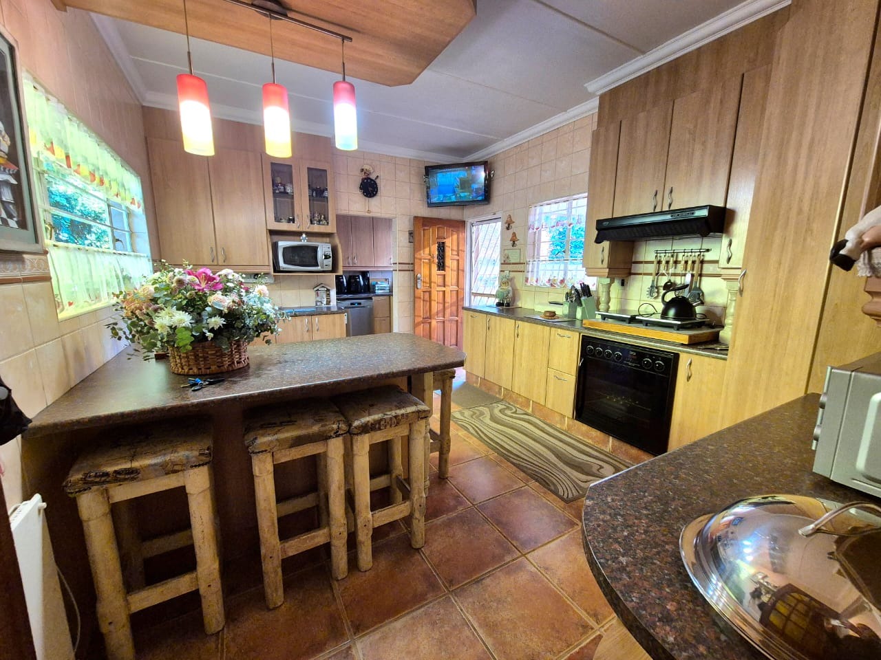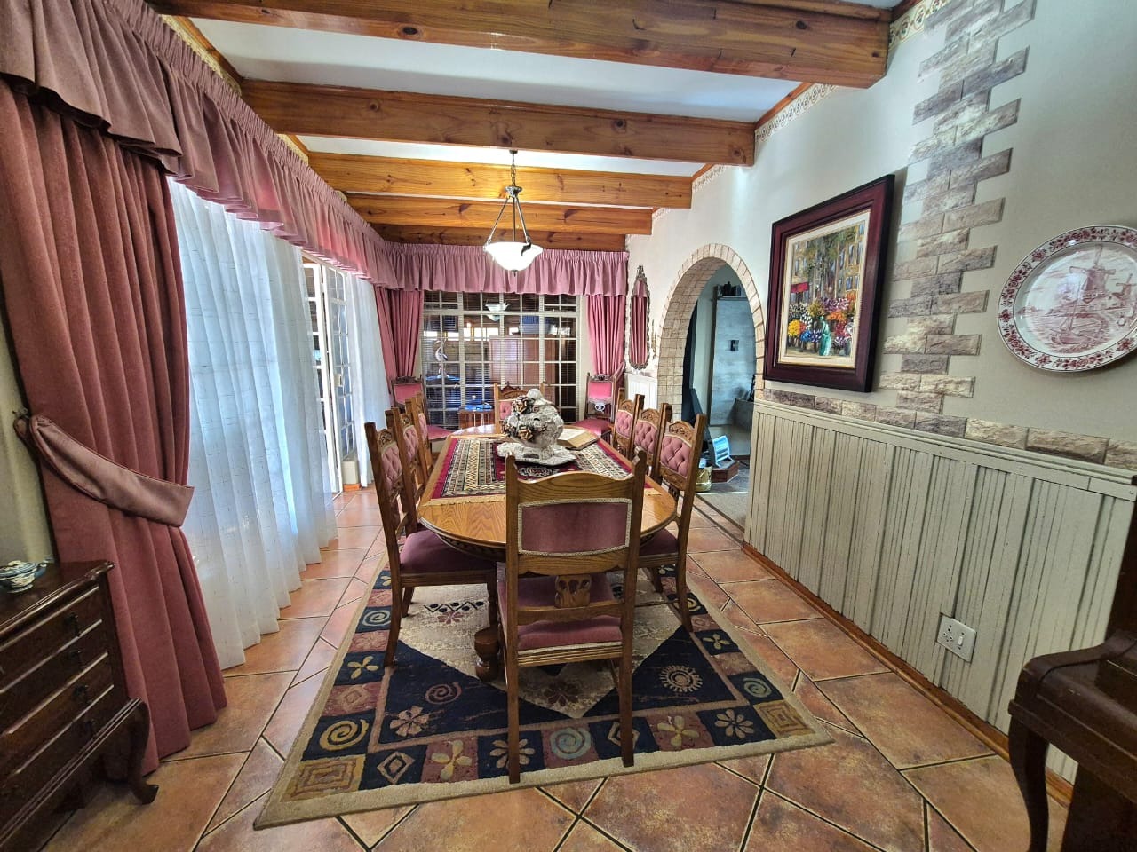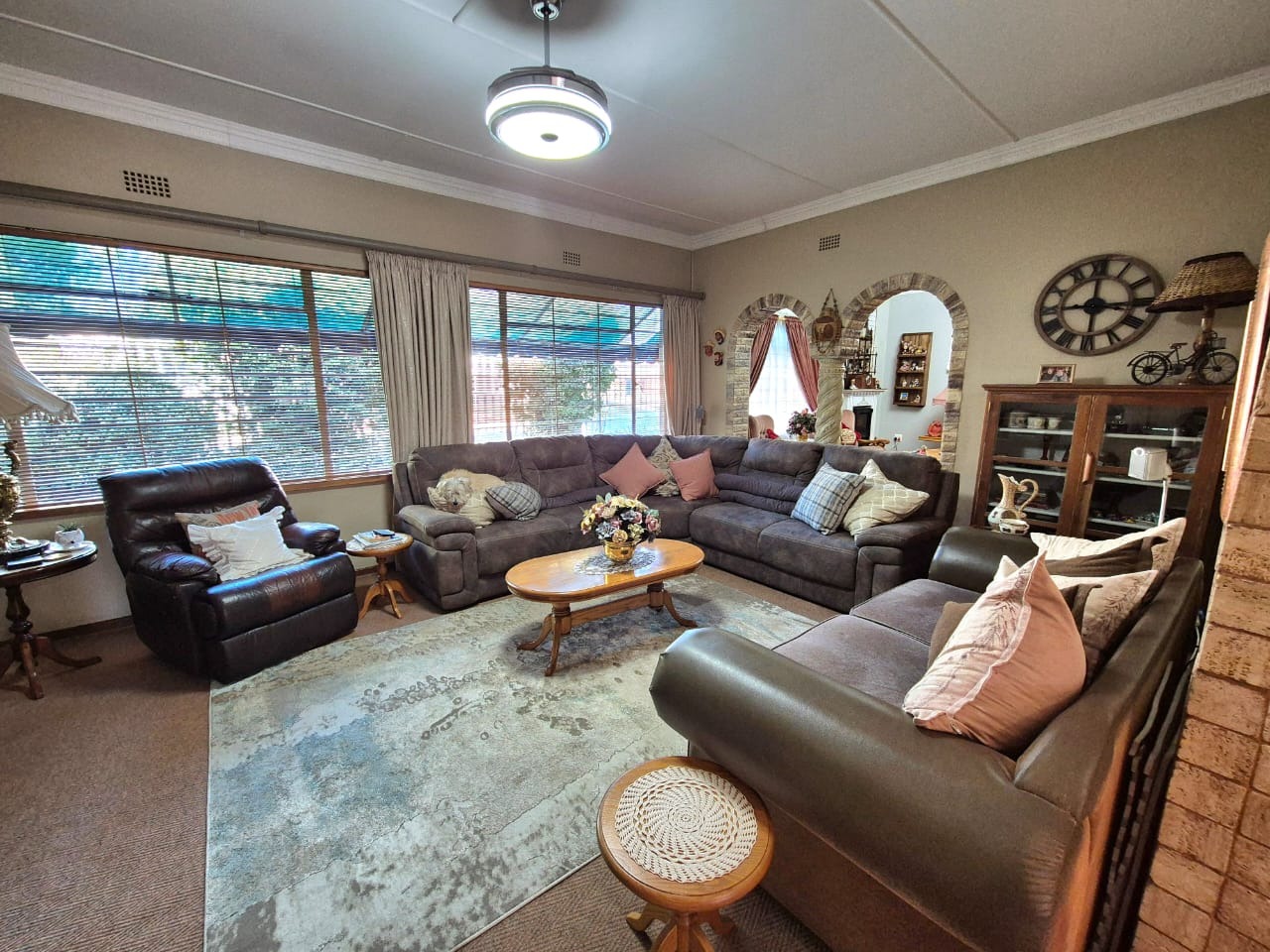 The heart of the home is the well-appointed kitchen, complete with built-in cupboards, tiled floors, and a cozy breakfast nook perfect for casual dining. Adjacent to the kitchen are multiple living spaces including a formal dining room, a TV room, and a welcoming lounge with a fireplace — ideal for relaxing evenings.