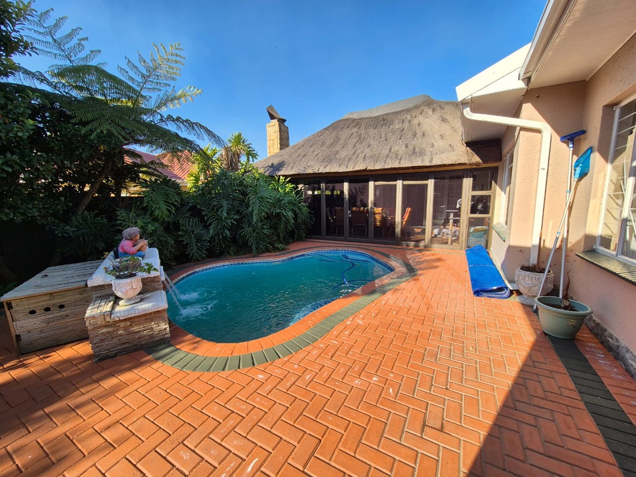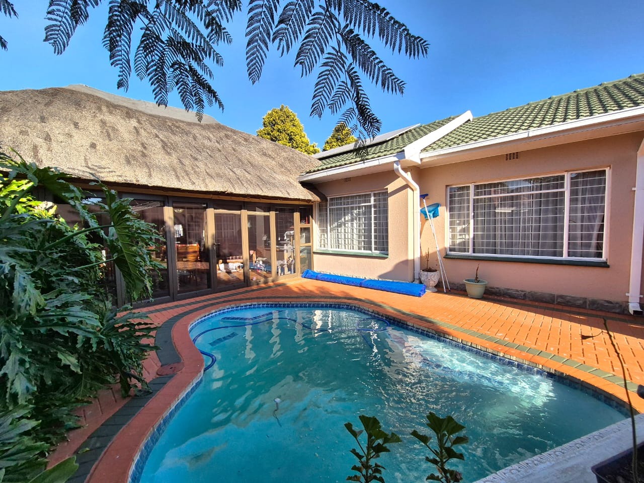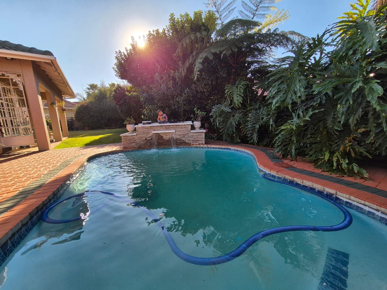 Step outside and enjoy the beautifully manicured garden and sparkling swimming pool. The entertainment area features a built-in braai, making it perfect for gatherings with friends and family.