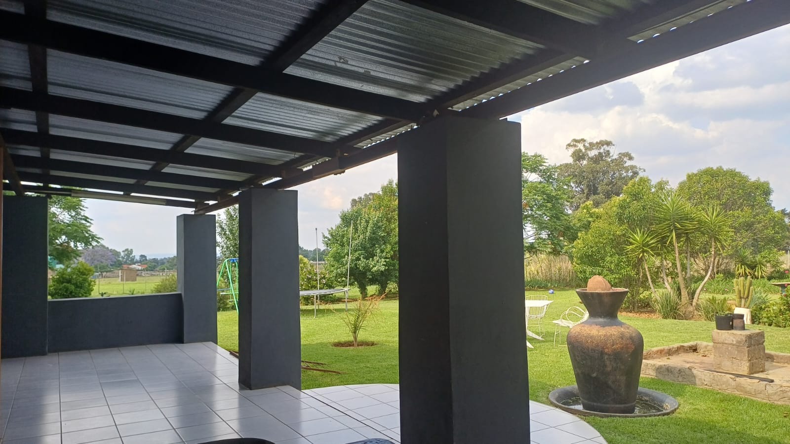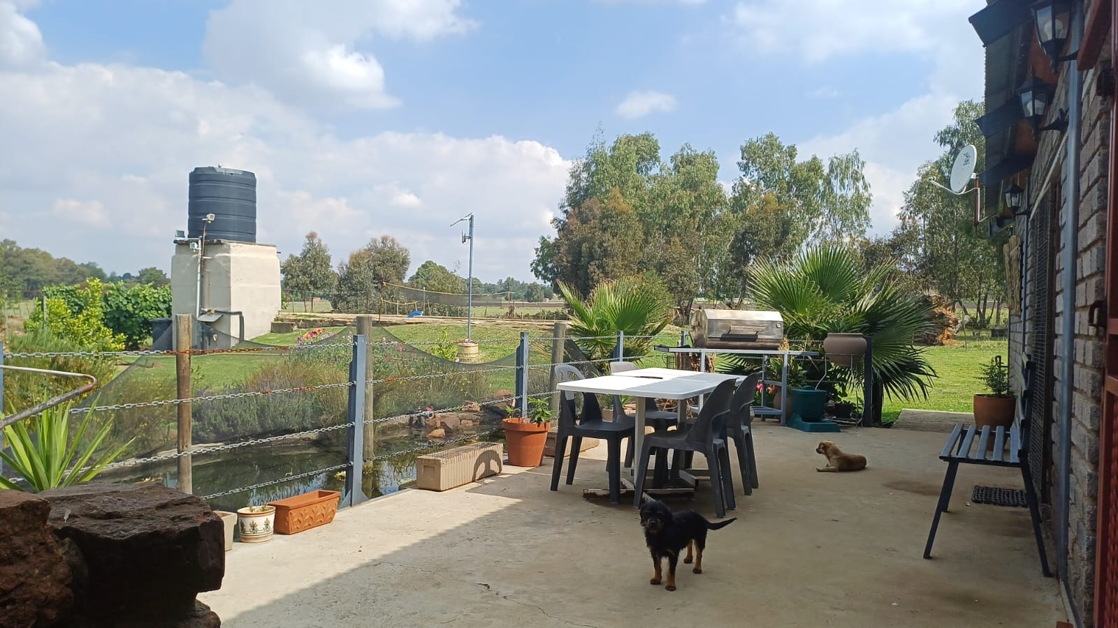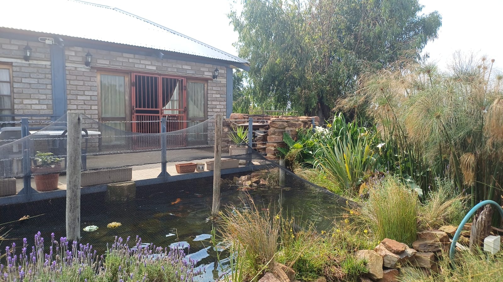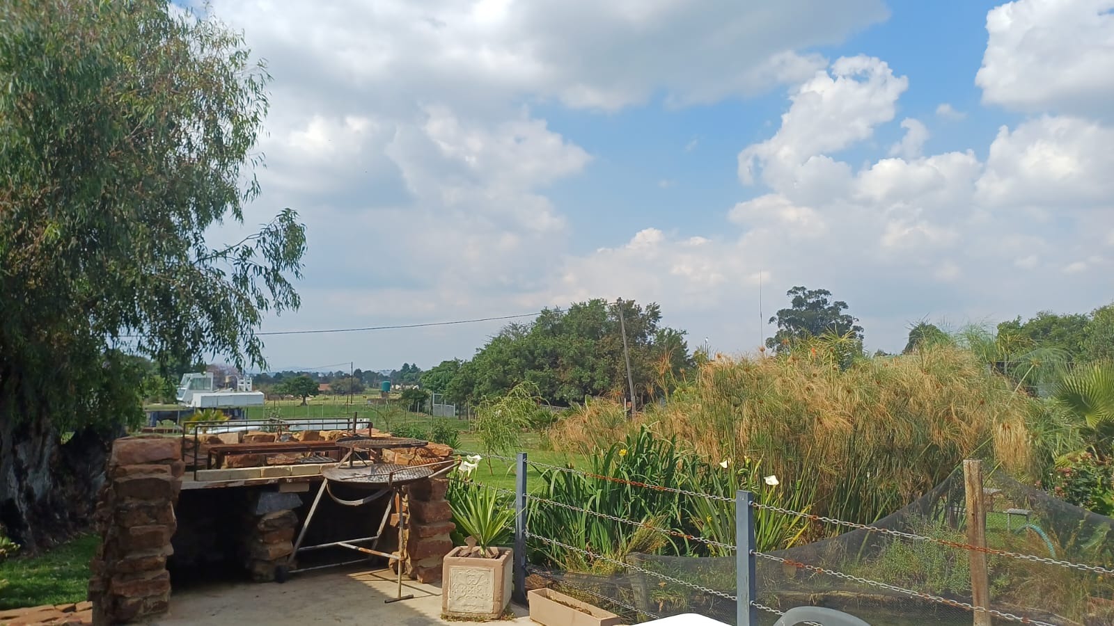This solid home with a corrugated roof is fully secured with burglar bars and security gates for peace of mind. The exterior is exceptionally neat, complemented by a lush, irrigated garden and a tranquil fishpond. A spacious deck-style patio with a built-in braai provides the perfect setting for entertainment and relaxation. Additional features include a carport for three vehicles and a JoJo tank that overflows into a large dam, forming a unique natural swimming pool ideal for warm summer days.