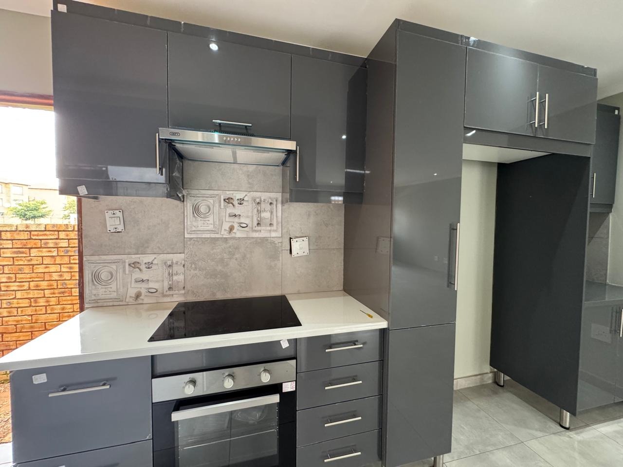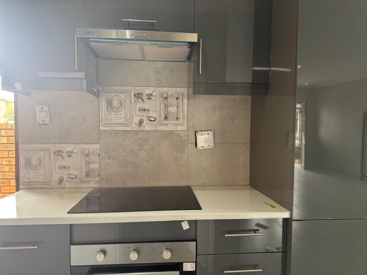 Step inside to an inviting interior featuring an open-plan layout, ideal for contemporary living. The property includes a comfortable lounge and a dedicated dining area, both benefiting from neutral paint finishes and durable tiled flooring throughout. The modern kitchen is a highlight, boasting sleek high-gloss grey cabinetry, pristine white countertops, and integrated appliances including an oven, hob, and extractor fan. A built-in wine rack and dedicated space for a large refrigerator enhance its functionality and style, making it perfect for culinary enthusiasts.