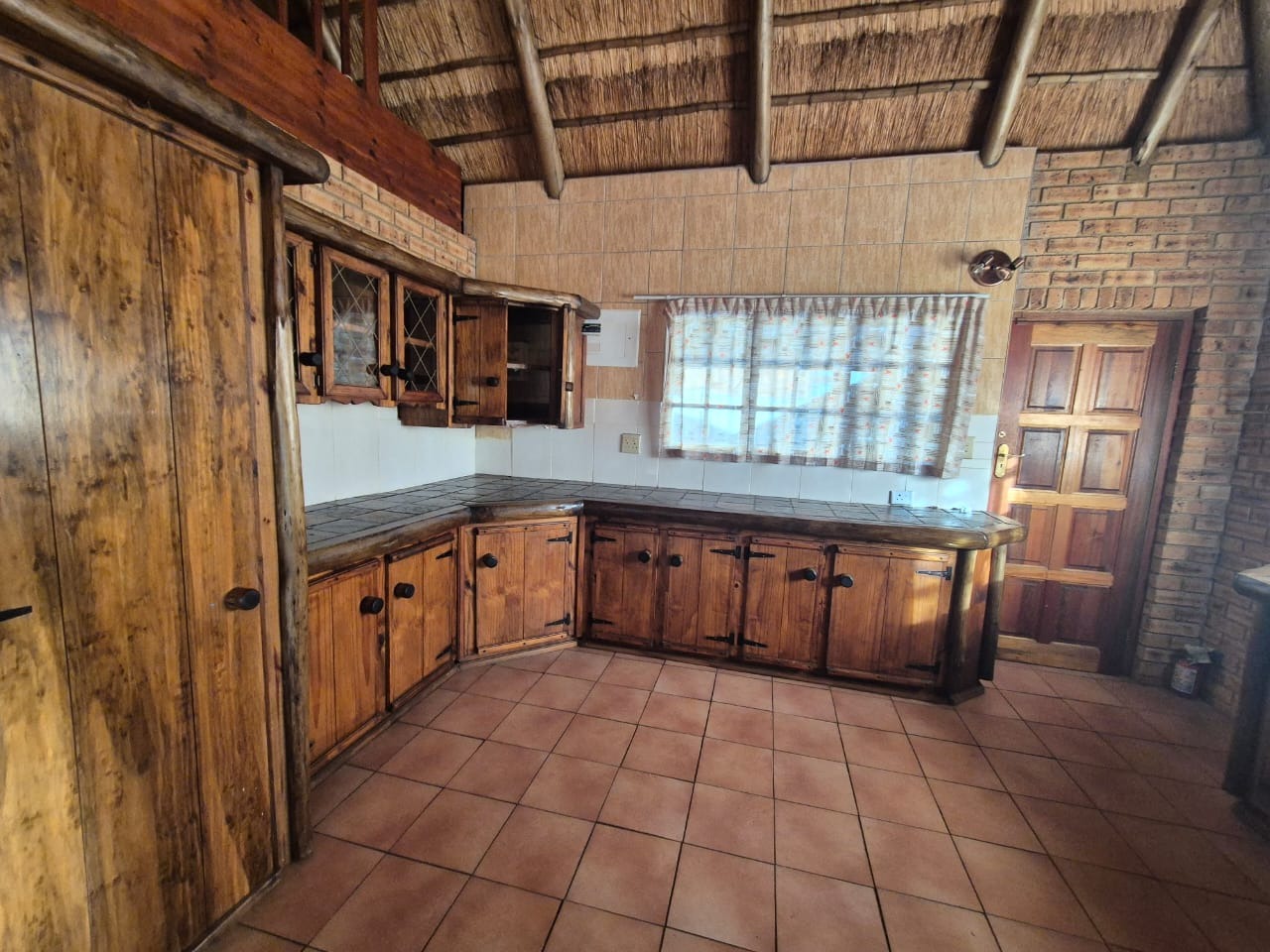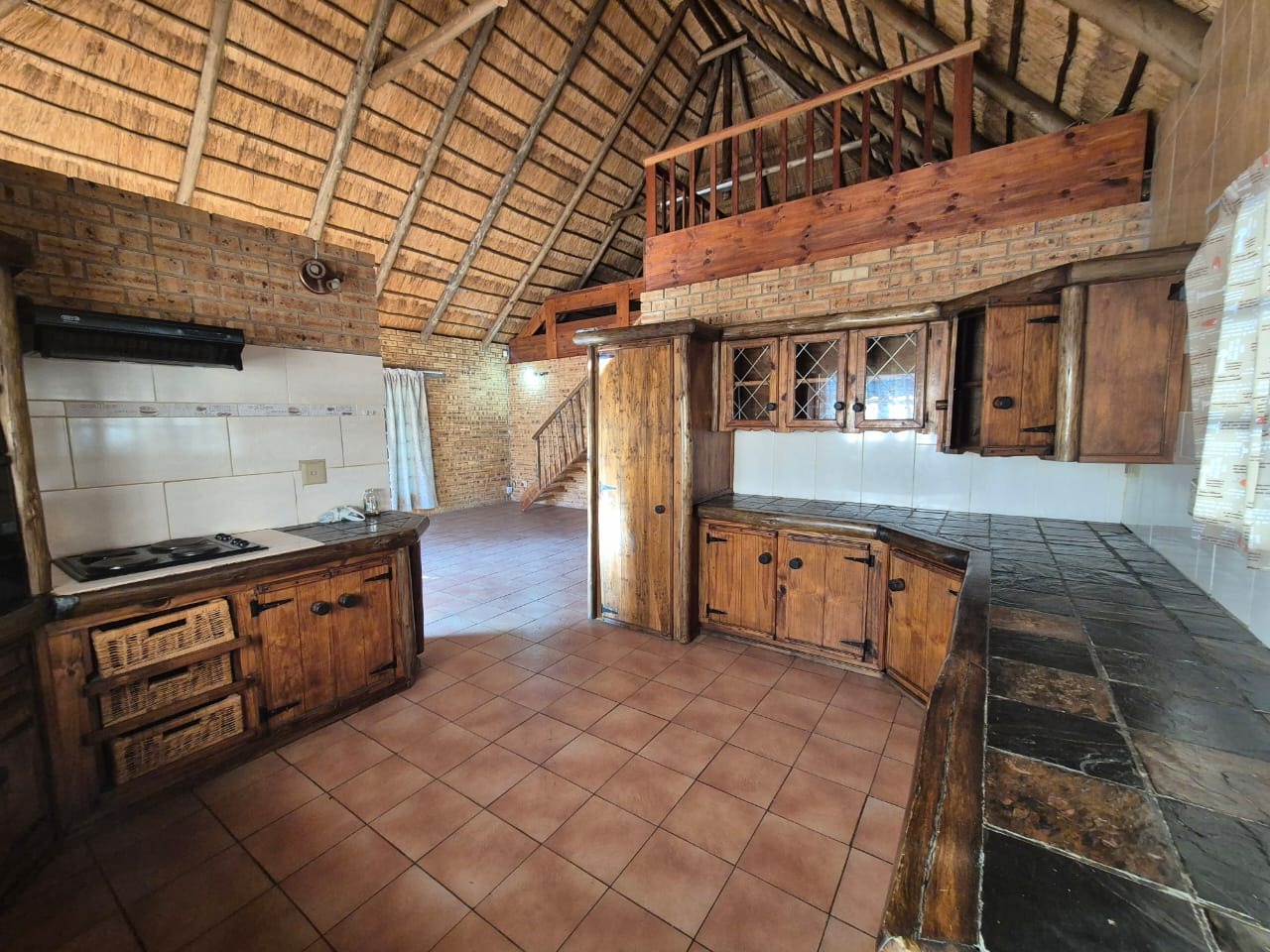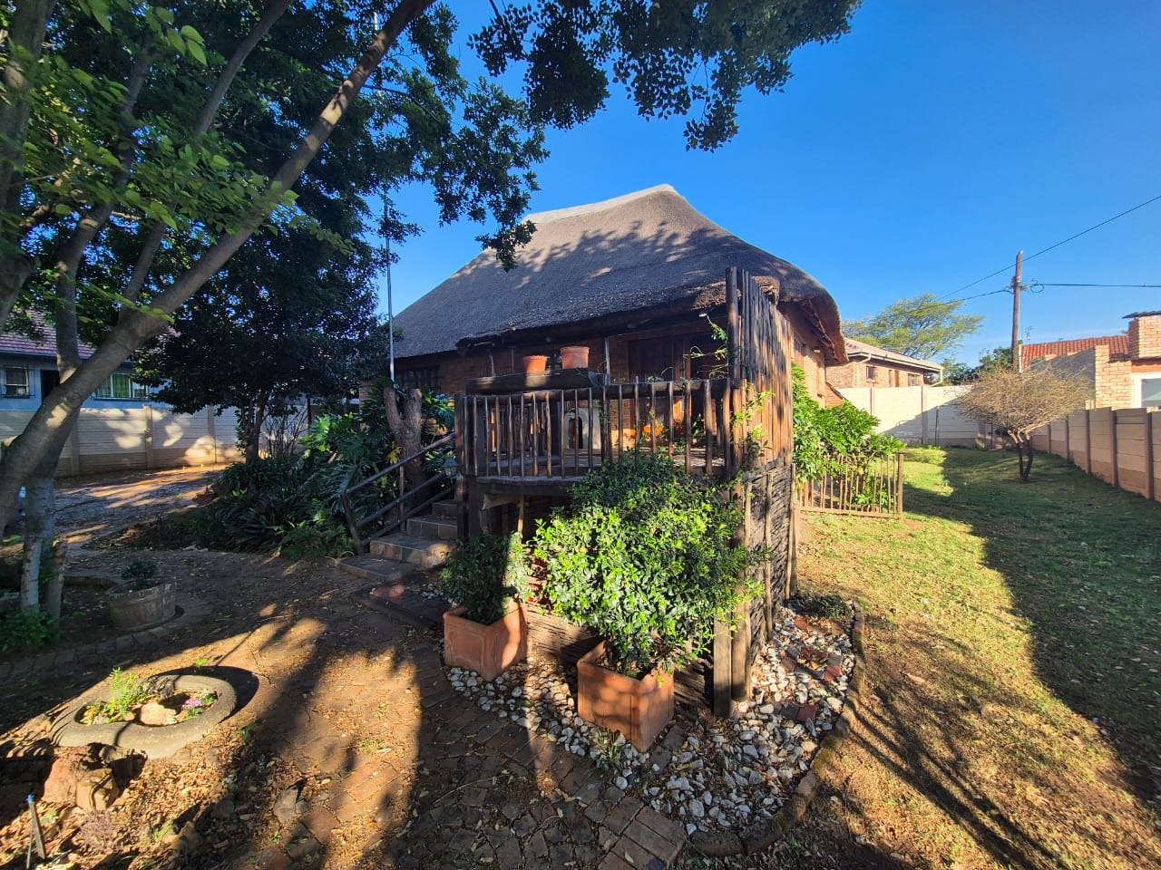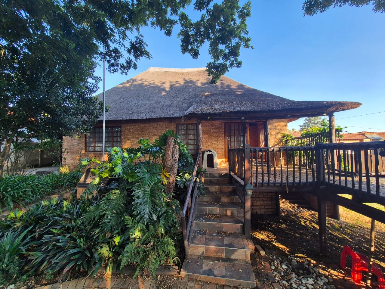 This warm and inviting thatch home in the heart of Greenhills offers a relaxed lifestyle with open-plan living and seamless indoor-outdoor flow. The spacious lounge and dining area feature tiled floors and connect effortlessly to a well-equipped kitchen with ample cupboard space, an eye-level oven, hob, extractor fan, and a separate scullery for convenience.