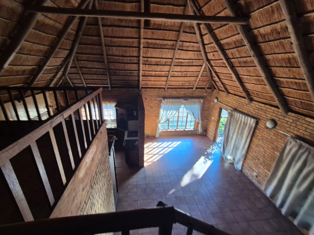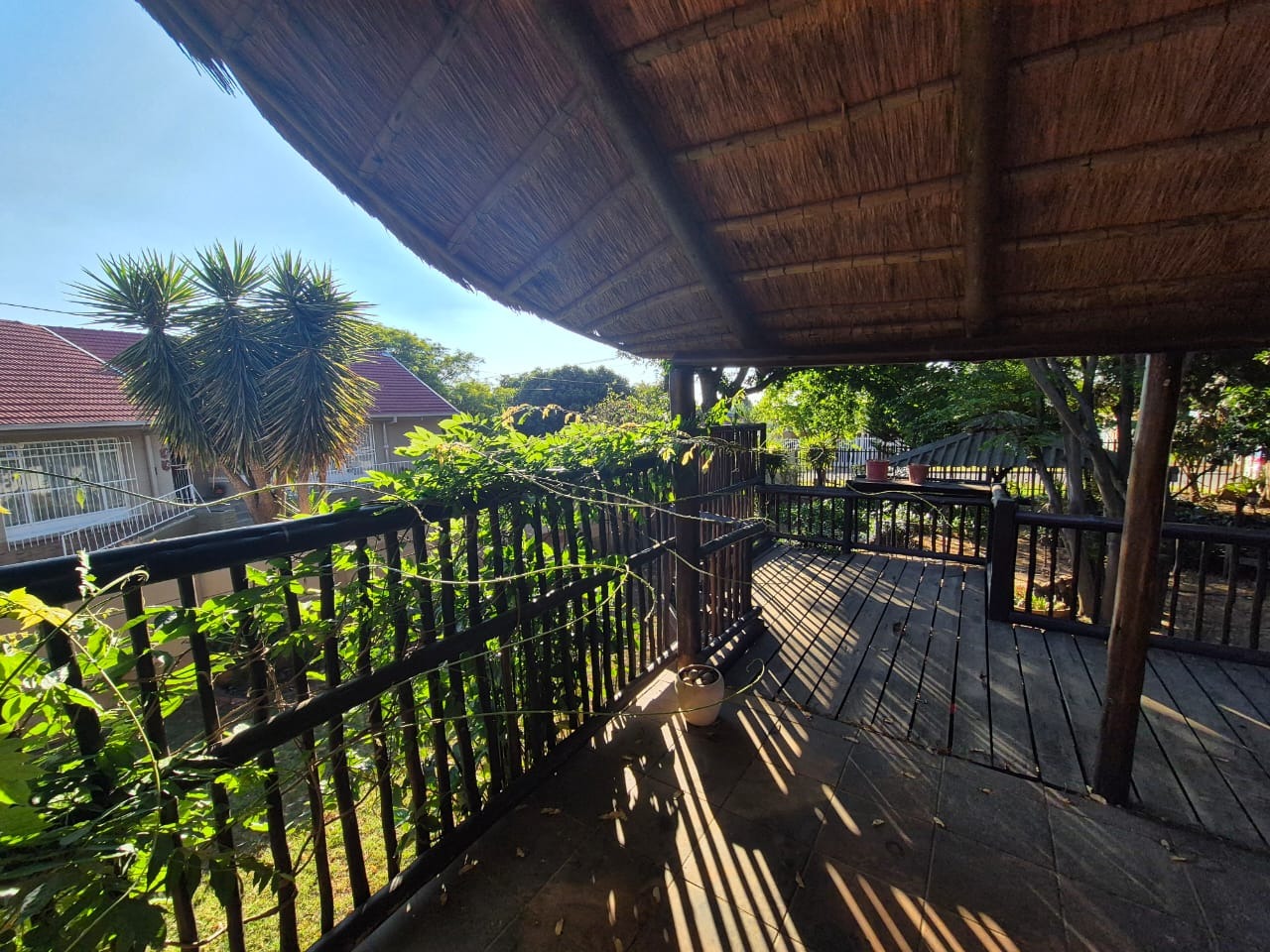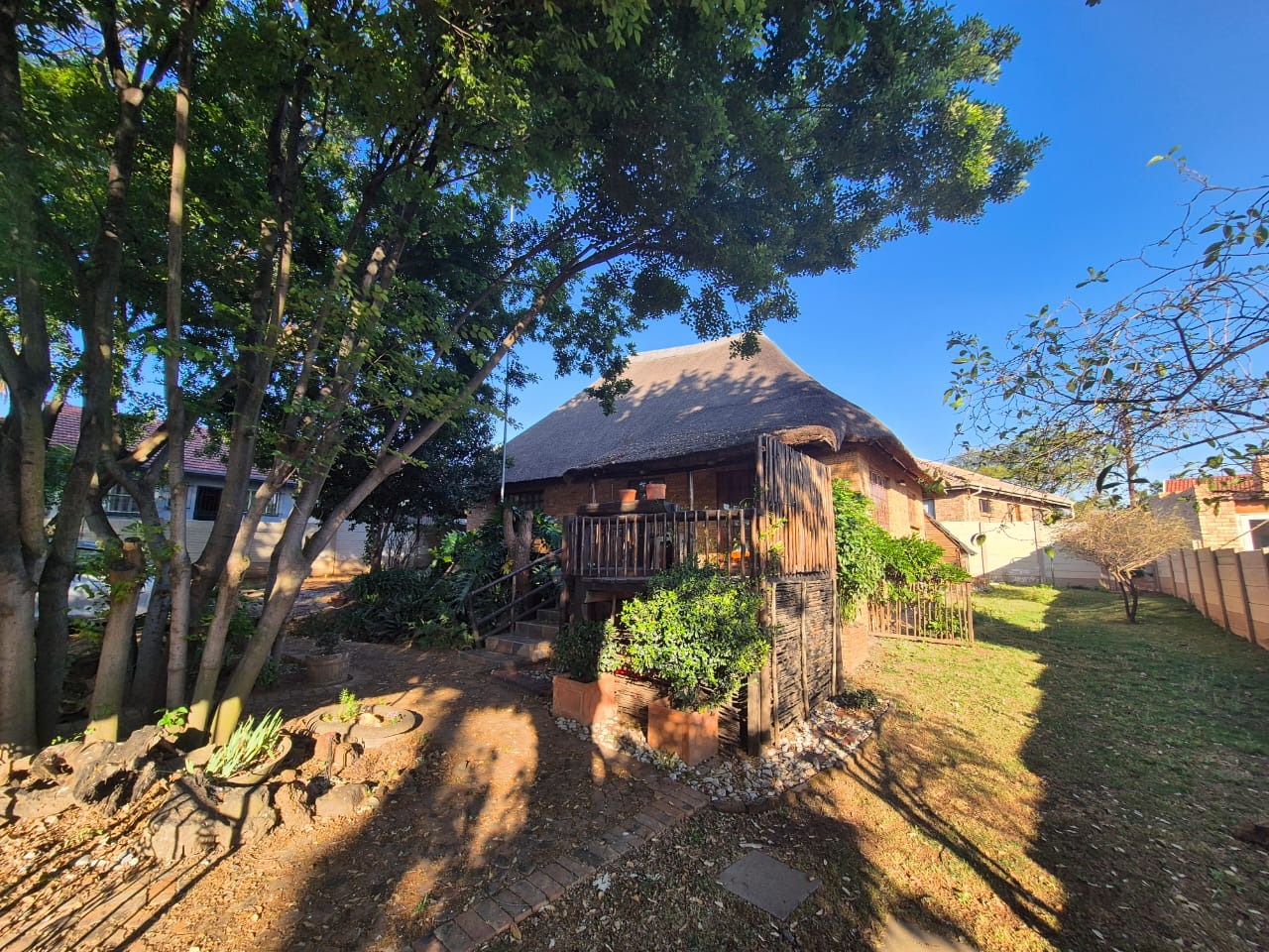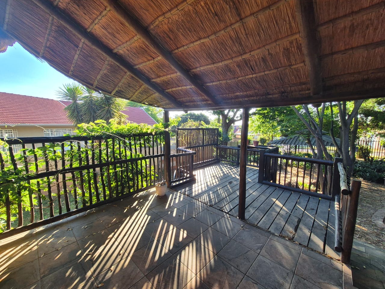 This warm and inviting thatch home in the heart of Greenhills offers a relaxed lifestyle with open-plan living and seamless indoor-outdoor flow. The spacious lounge and dining area feature tiled floors and connect effortlessly to a well-equipped kitchen with ample cupboard space, an eye-level oven, hob, extractor fan, and a separate scullery for convenience.