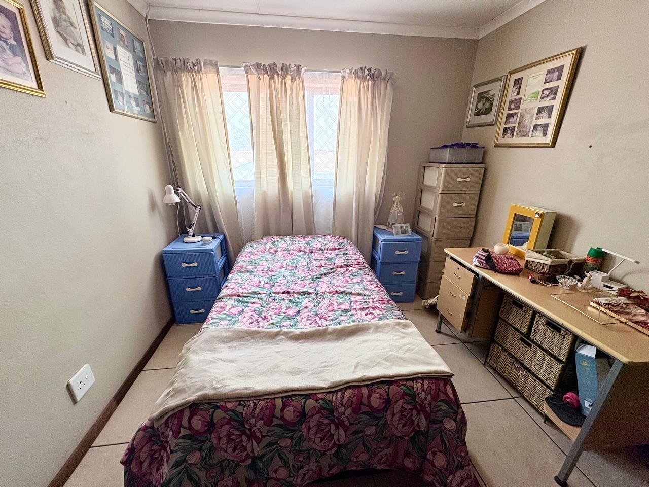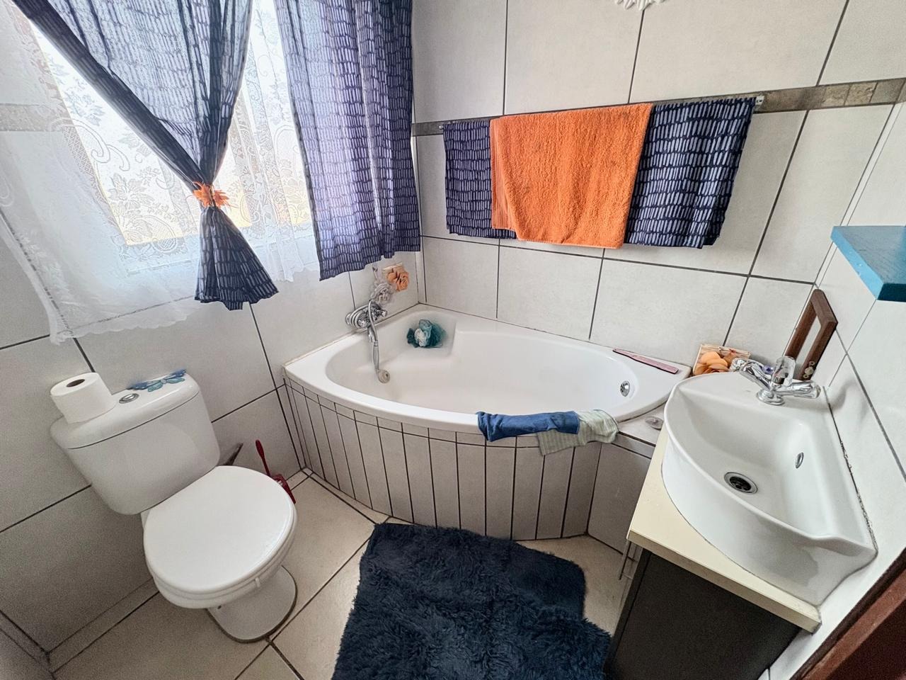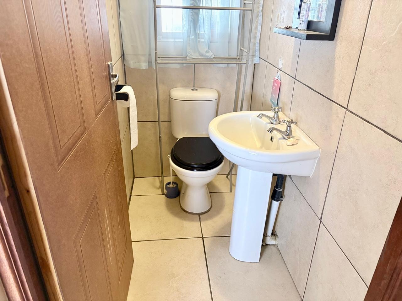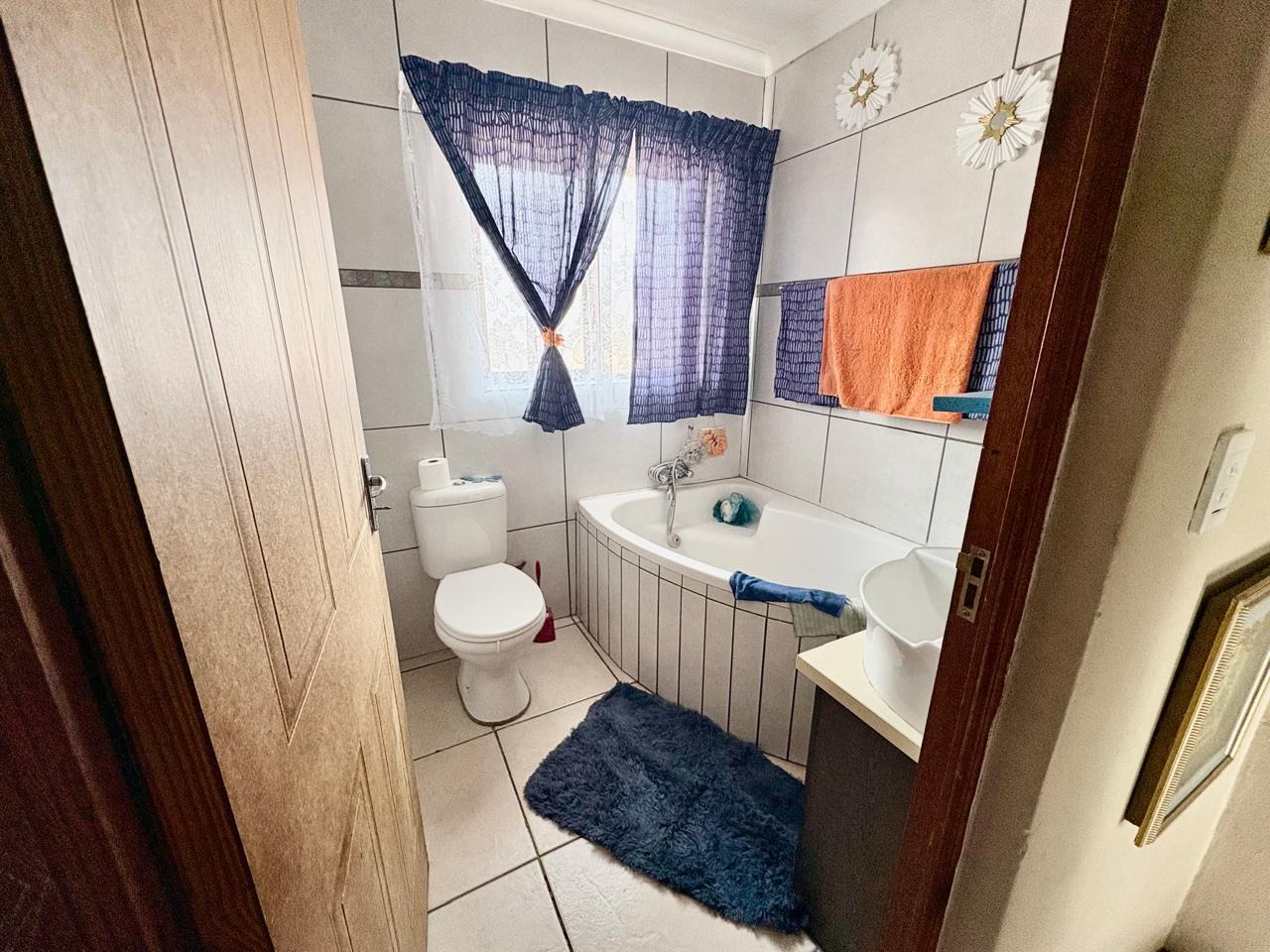 The home is entered via a double garage, offering both convenience and added security. The ground floor features a guest toilet with basin and a spacious open-plan kitchen complete with a breakfast nook, modern built-in cupboards, granite countertops, and an undercounter oven. A separate scullery/laundry area enhances functionality, while prepaid electricity adds to the home’s practicality.