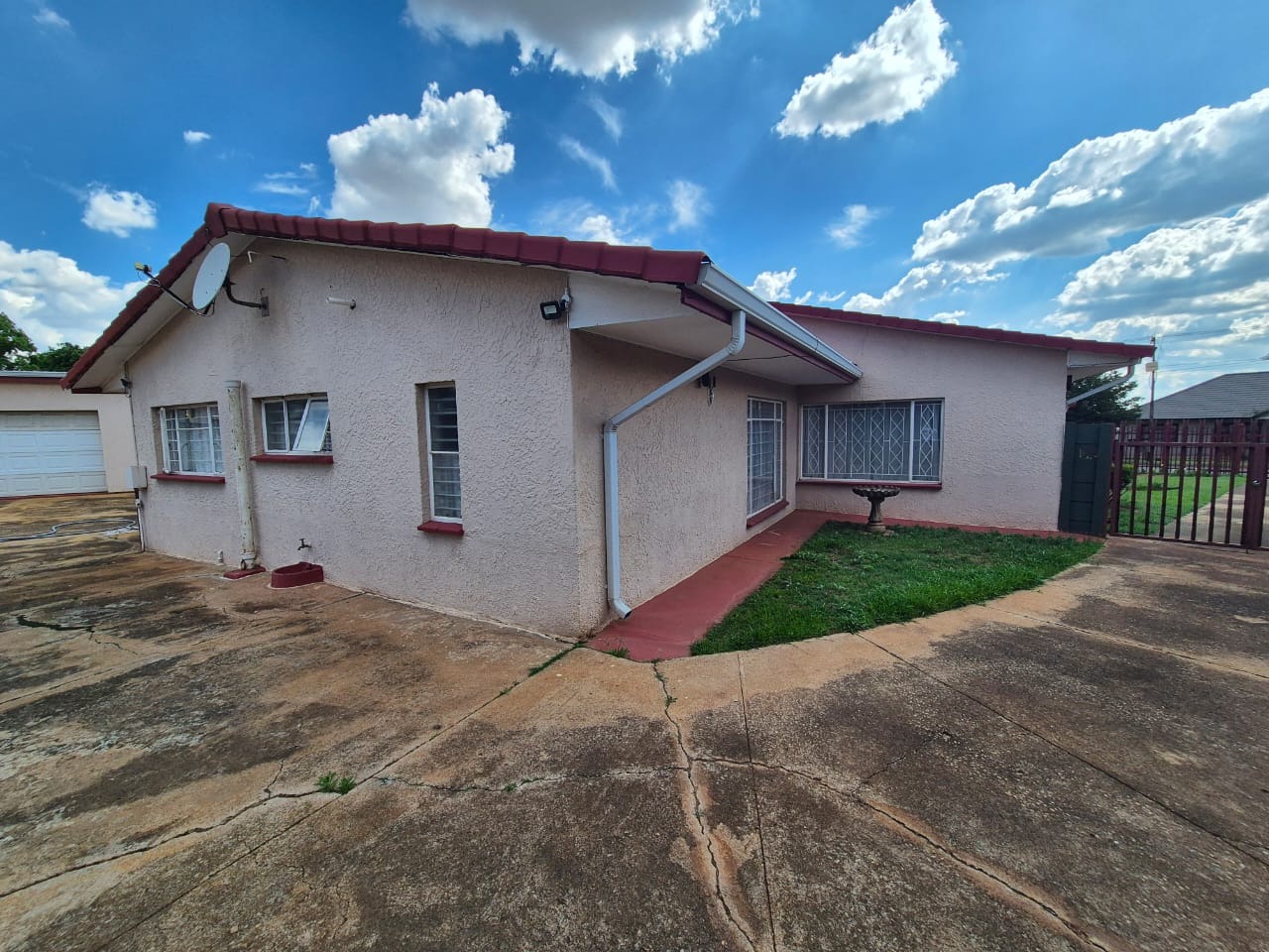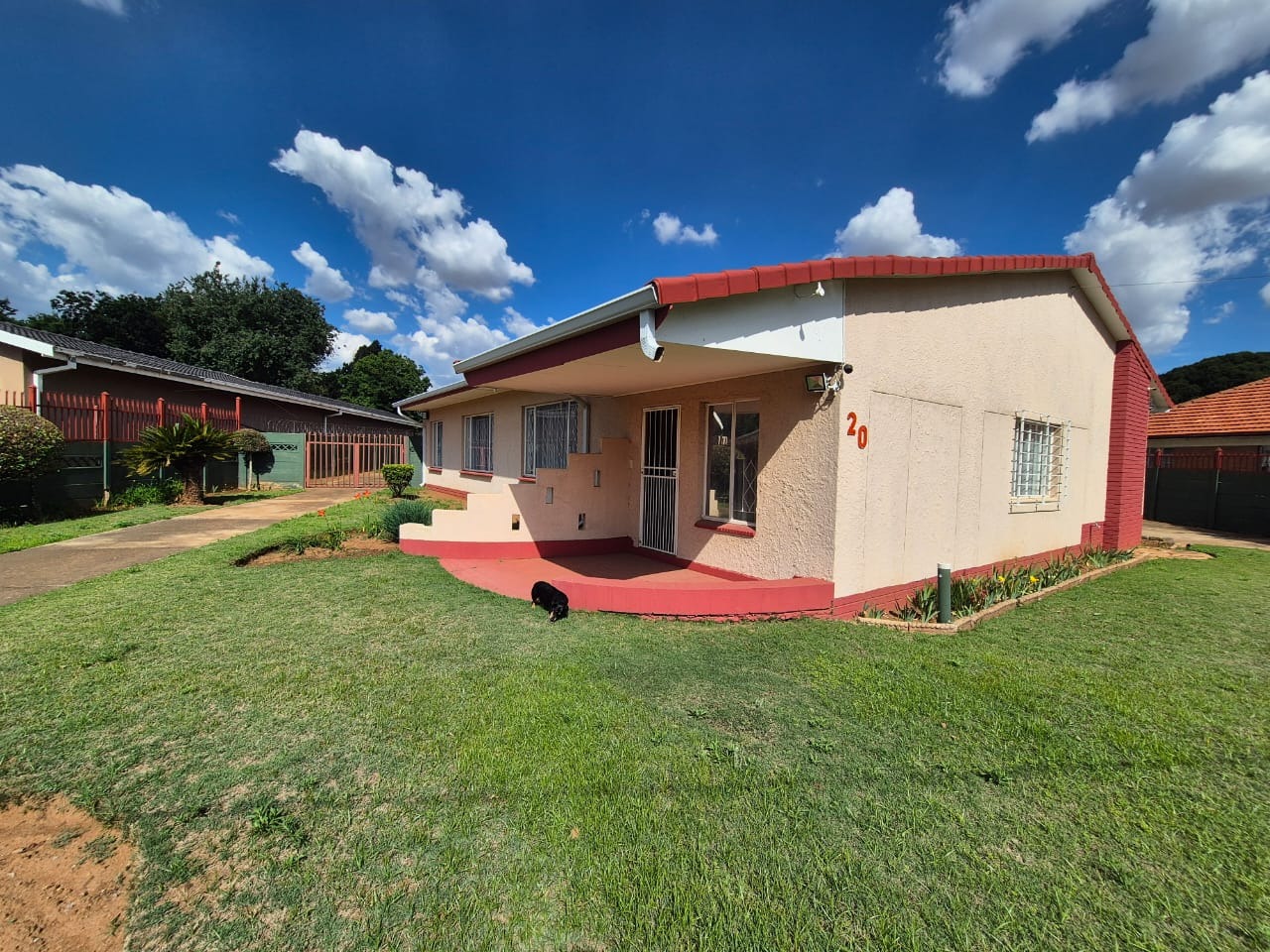 Nestled in the suburban area of Greenhills, Randfontein, this single-story residence presents a neat kerb appeal with its red tiled roof and light-colored exterior walls, complemented by red accents. A paved driveway leads to a double garage, and the property features a well-maintained front lawn and garden beds. Security bars on windows and doors, along with a gated entrance, provide peace of mind.