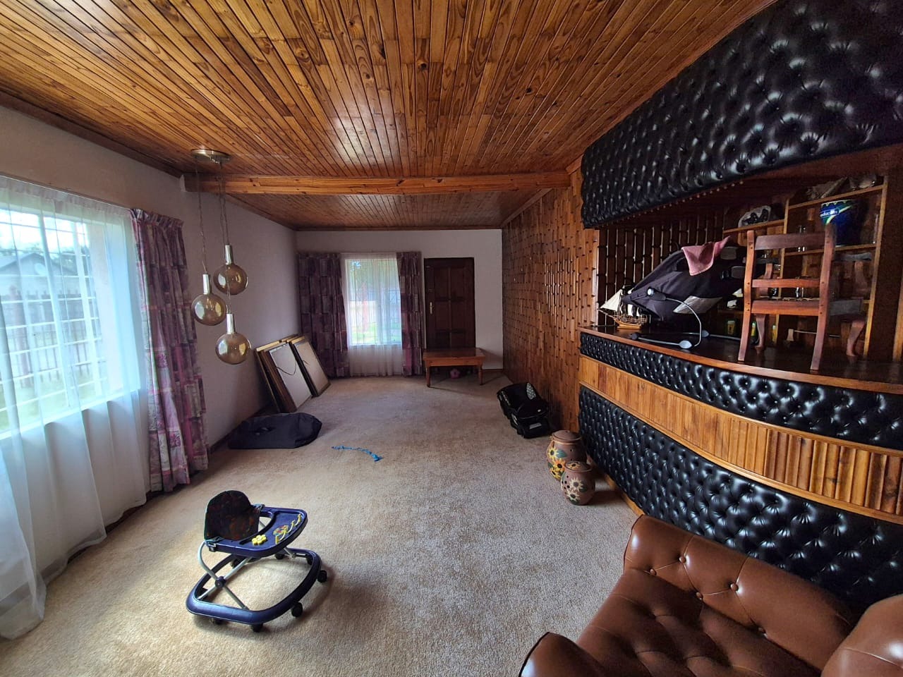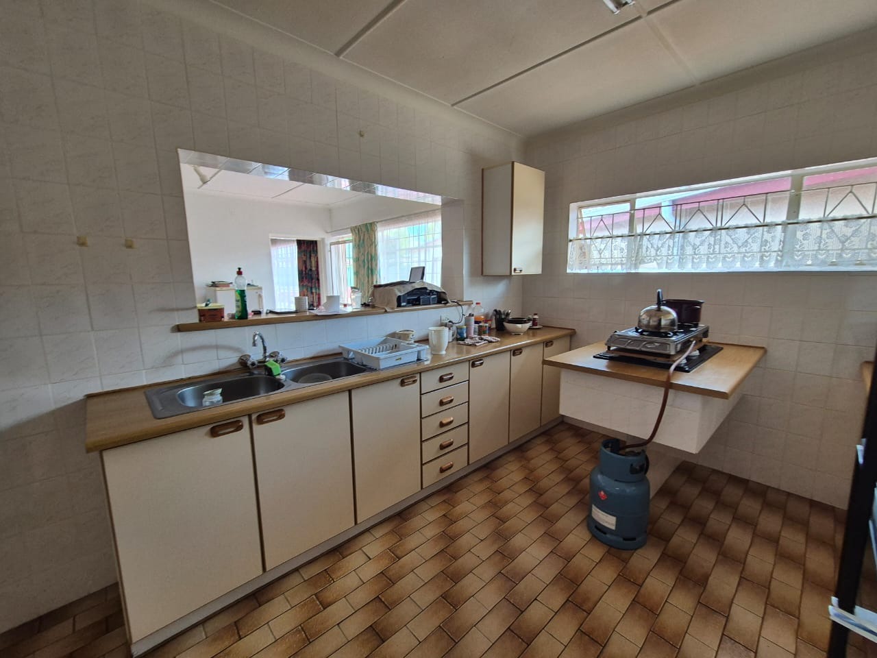 Inside, this spacious home offers a comfortable layout including one lounge and a dedicated dining room. The kitchen, featuring a gas stove, double sink, and ample countertop space, connects seamlessly to the living area via a breakfast bar, promoting social interaction. Tiled flooring extends throughout these areas, ensuring durability and easy maintenance. A separate utility room provides practical laundry facilities and additional storage.