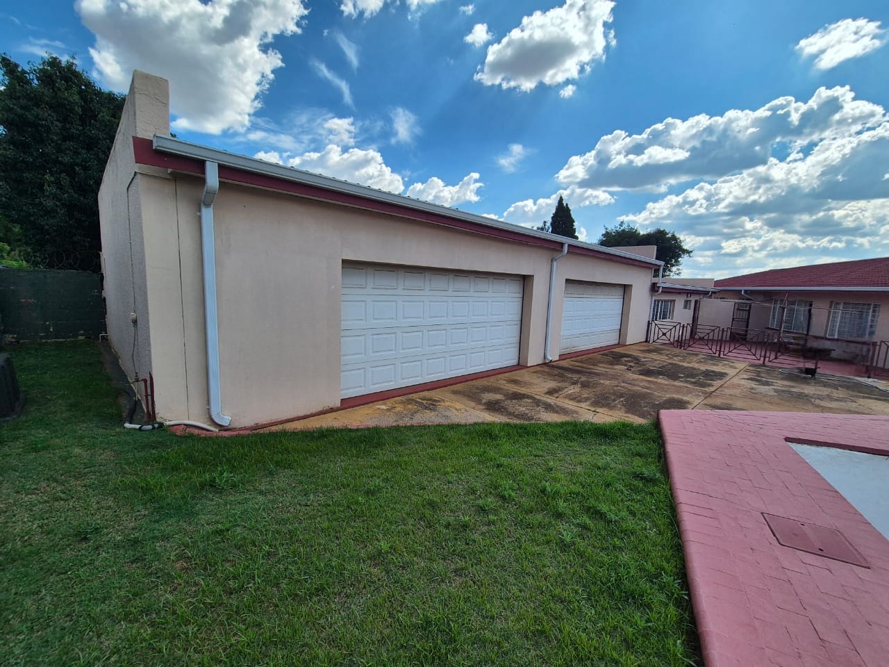 Nestled in the suburban area of Greenhills, Randfontein, this single-story residence presents a neat kerb appeal with its red tiled roof and light-colored exterior walls, complemented by red accents. A paved driveway leads to a double garage, and the property features a well-maintained front lawn and garden beds. Security bars on windows and doors, along with a gated entrance, provide peace of mind.