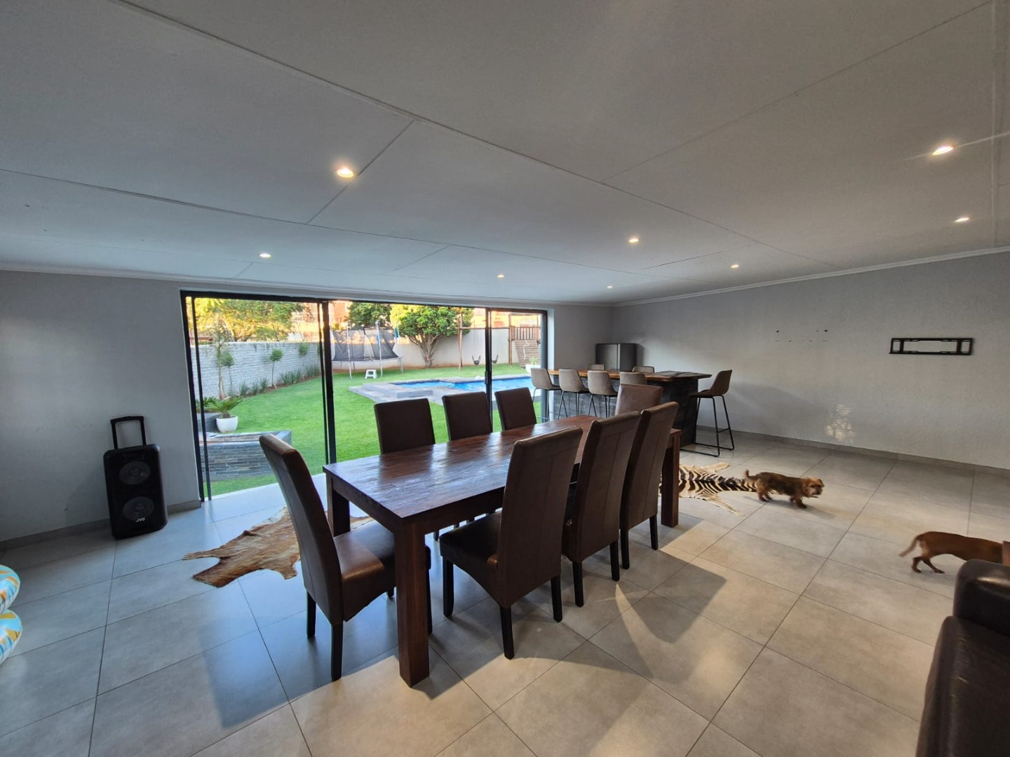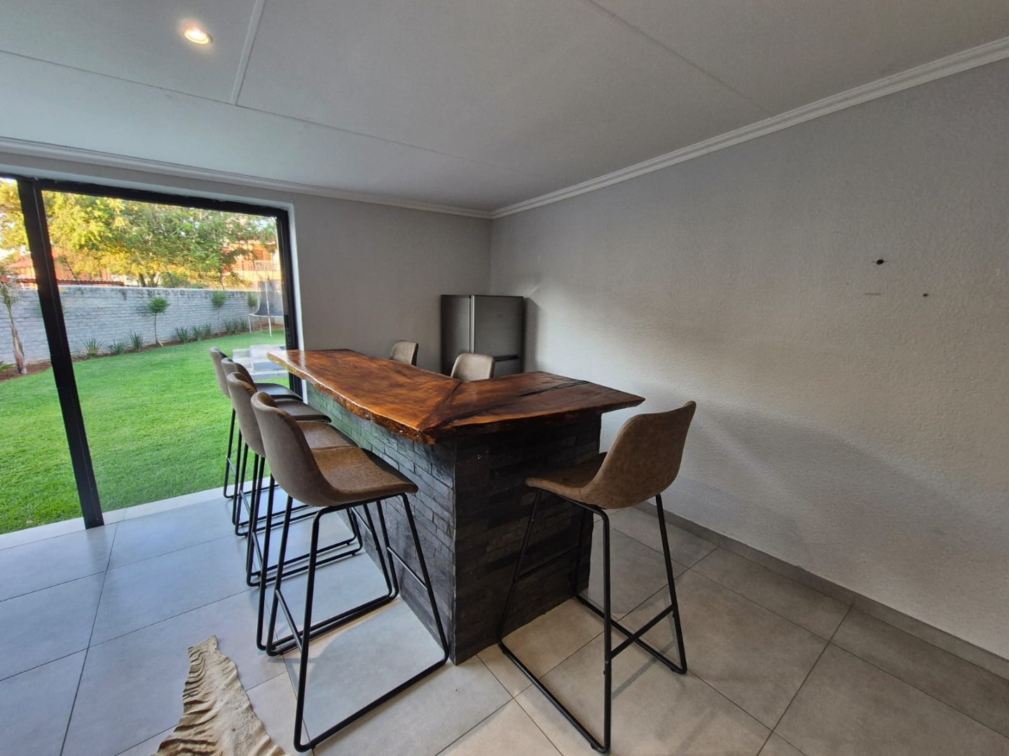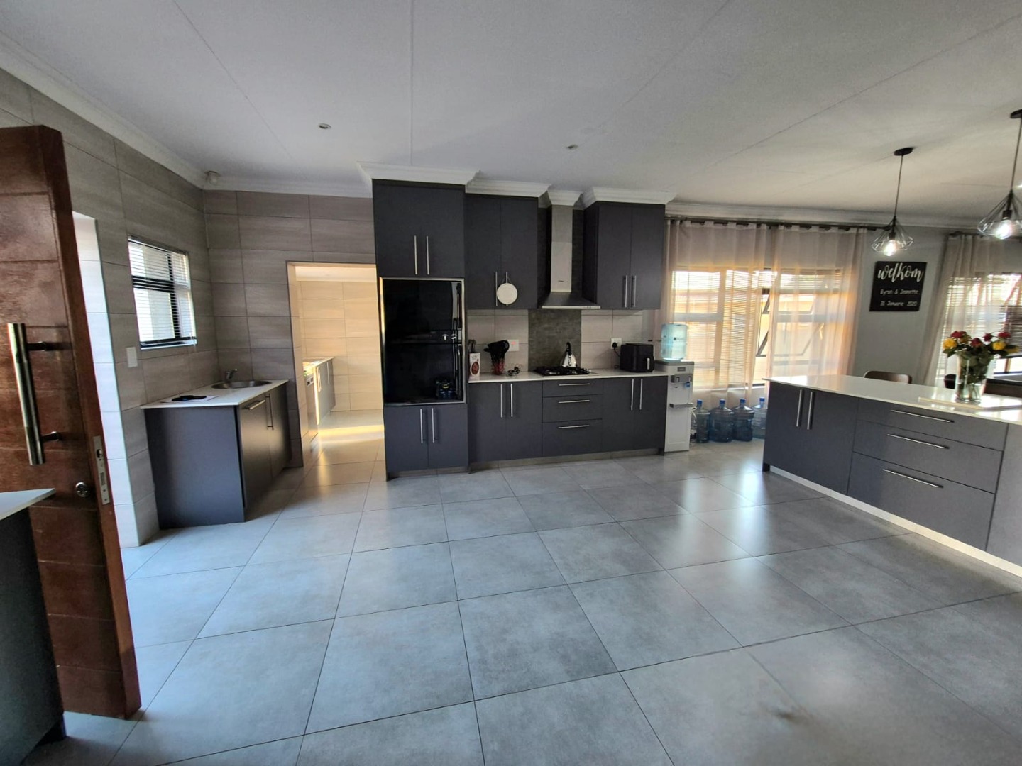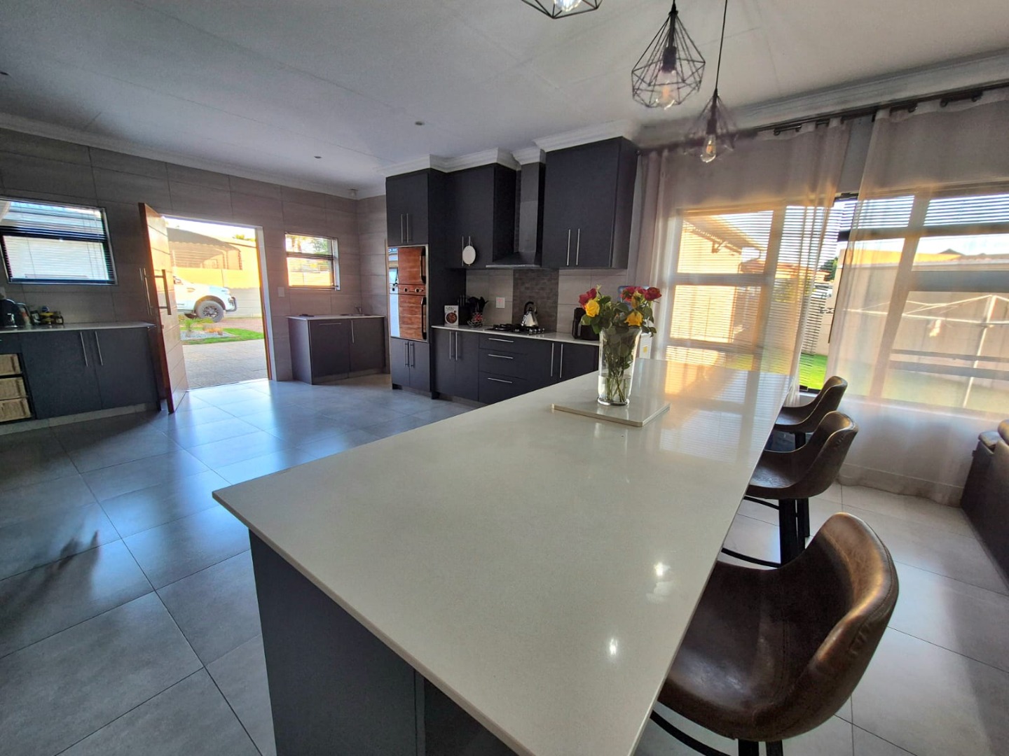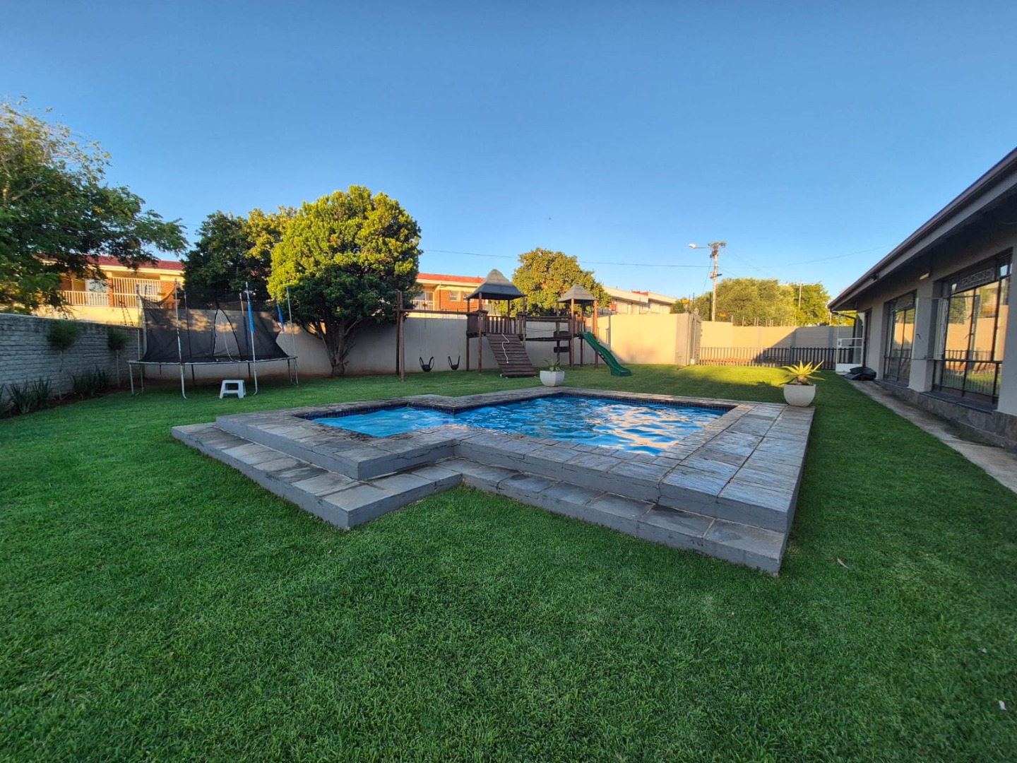 This modern family home in Greenhills, Randfontein, offers a spacious and contemporary living experience. The heart of the home features an inviting open-plan layout, seamlessly connecting the lounge, dining room, and a dedicated family/TV room. The stylish kitchen is a highlight, boasting dark cabinetry, light countertops, a large island with seating, and modern pendant lighting, all complemented by sleek tiled flooring. A convenient laundry area and a built-in bar enhance the functionality and entertainment potential of the interior. The residence comprises four comfortable bedrooms and 2.5 bathrooms, including a guest toilet, providing ample space for a growing family. Additionally, a dedicated study offers a quiet space for work or hobbies. Step outside to discover a private oasis designed for relaxation and entertainment. The property features a sparkling swimming pool, a lush green garden, and a dedicated children's play area, perfect for family enjoyment. An outdoor built-in braai area is ideal for social gatherings. Practical amenities include a double garage, domestic rooms, and outside toilets. Security is a priority, with comprehensive features such as an alarm system, access gate, electric fencing, CCTV, burglar bars, and a security gate, ensuring peace of mind for residents. This suburban property allows pets, adding to its family-friendly appeal. Key Features: * 4 Bedrooms, 2.5 Bathrooms * Modern Open-Plan Kitchen with Island * Spacious Lounge, Dining, and Family/TV Rooms * Private Swimming Pool & Lush Garden * Outdoor Built-in Braai Area * Double Garage * Comprehensive Security (Alarm, CCTV, Electric Fencing) * Dedicated Study * Domestic Rooms & Outside Toilets
