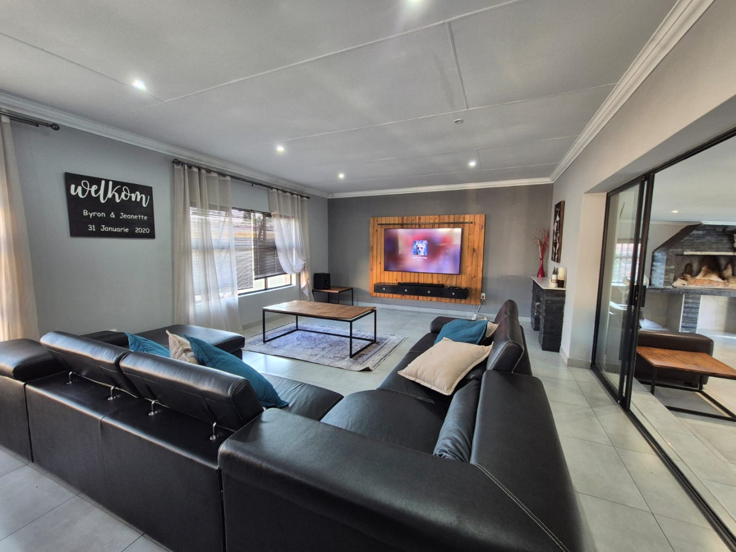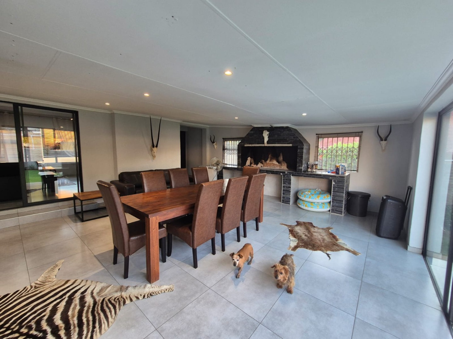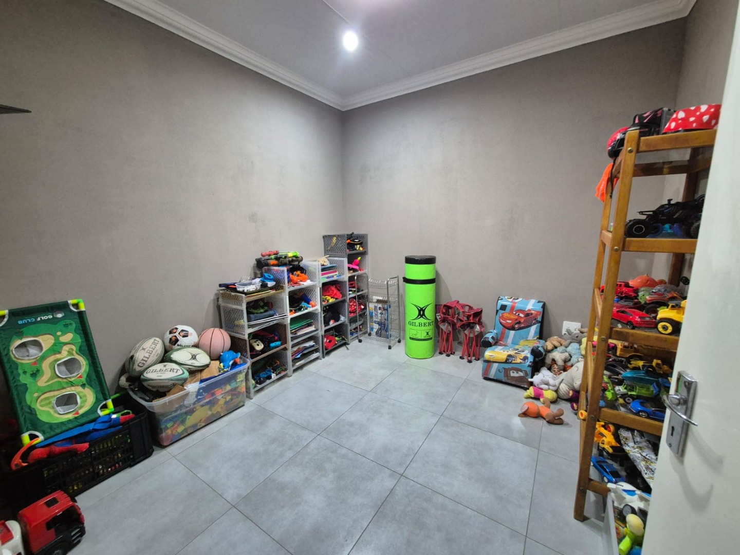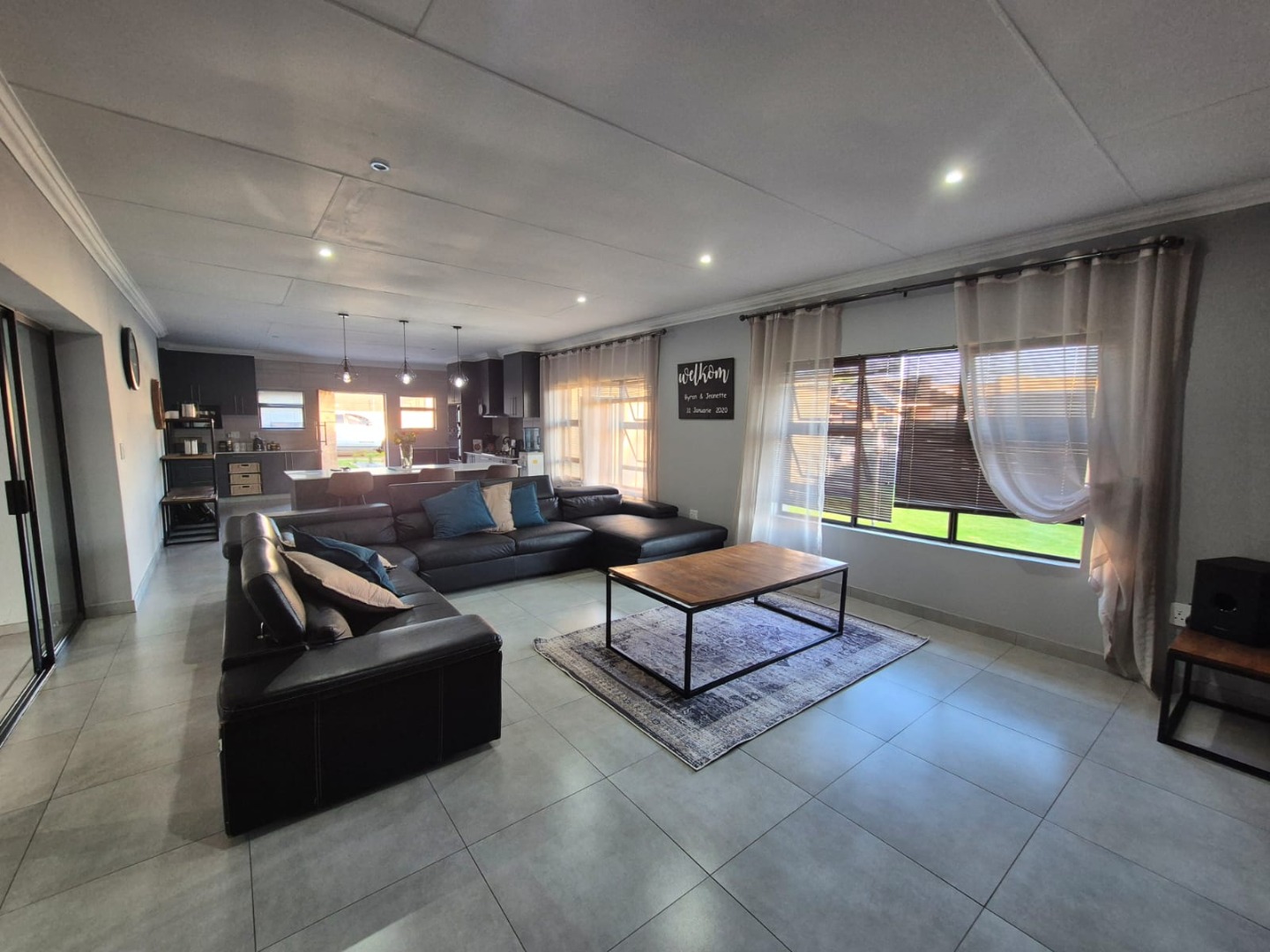 This modern family home in Greenhills, Randfontein, offers a spacious and contemporary living experience. The heart of the home features an inviting open-plan layout, seamlessly connecting the lounge, dining room, and a dedicated family/TV room. The stylish kitchen is a highlight, boasting dark cabinetry, light countertops, a large island with seating, and modern pendant lighting, all complemented by sleek tiled flooring. A convenient laundry area and a built-in bar enhance the functionality and entertainment potential of the interior. The residence comprises four comfortable bedrooms and 2.5 bathrooms, including a guest toilet, providing ample space for a growing family. Additionally, a dedicated study offers a quiet space for work or hobbies. Step outside to discover a private oasis designed for relaxation and entertainment. The property features a sparkling swimming pool, a lush green garden, and a dedicated children's play area, perfect for family enjoyment. An outdoor built-in braai area is ideal for social gatherings. Practical amenities include a double garage, domestic rooms, and outside toilets. Security is a priority, with comprehensive features such as an alarm system, access gate, electric fencing, CCTV, burglar bars, and a security gate, ensuring peace of mind for residents. This suburban property allows pets, adding to its family-friendly appeal. Key Features: * 4 Bedrooms, 2.5 Bathrooms * Modern Open-Plan Kitchen with Island * Spacious Lounge, Dining, and Family/TV Rooms * Private Swimming Pool & Lush Garden * Outdoor Built-in Braai Area * Double Garage * Comprehensive Security (Alarm, CCTV, Electric Fencing) * Dedicated Study * Domestic Rooms & Outside Toilets