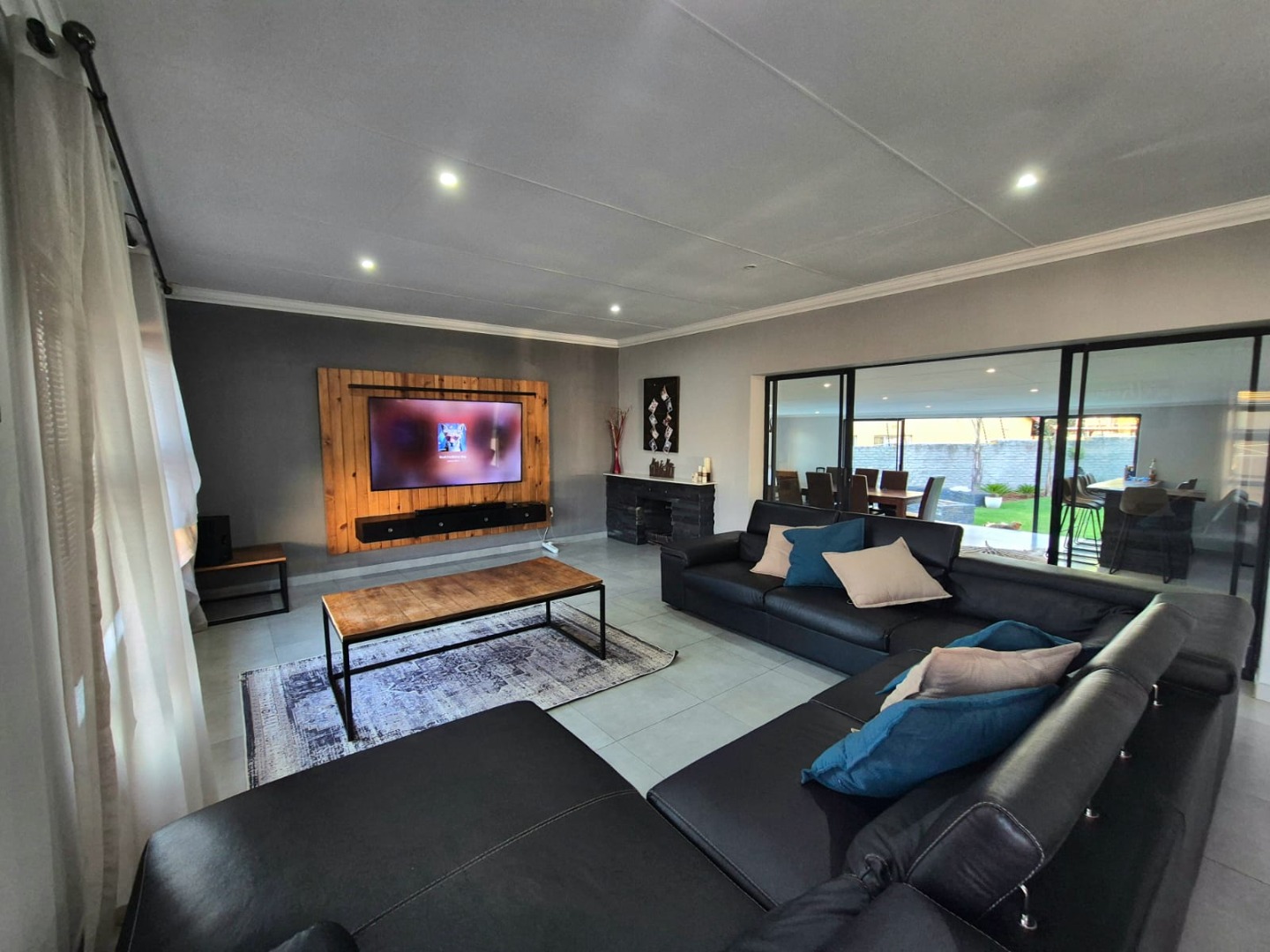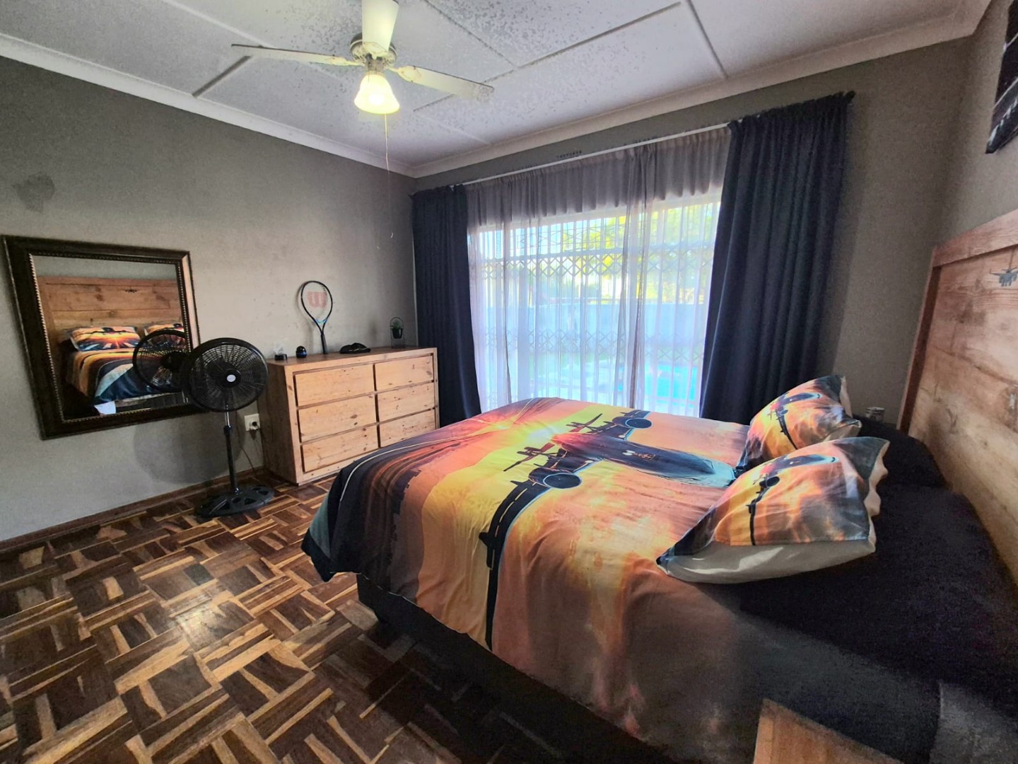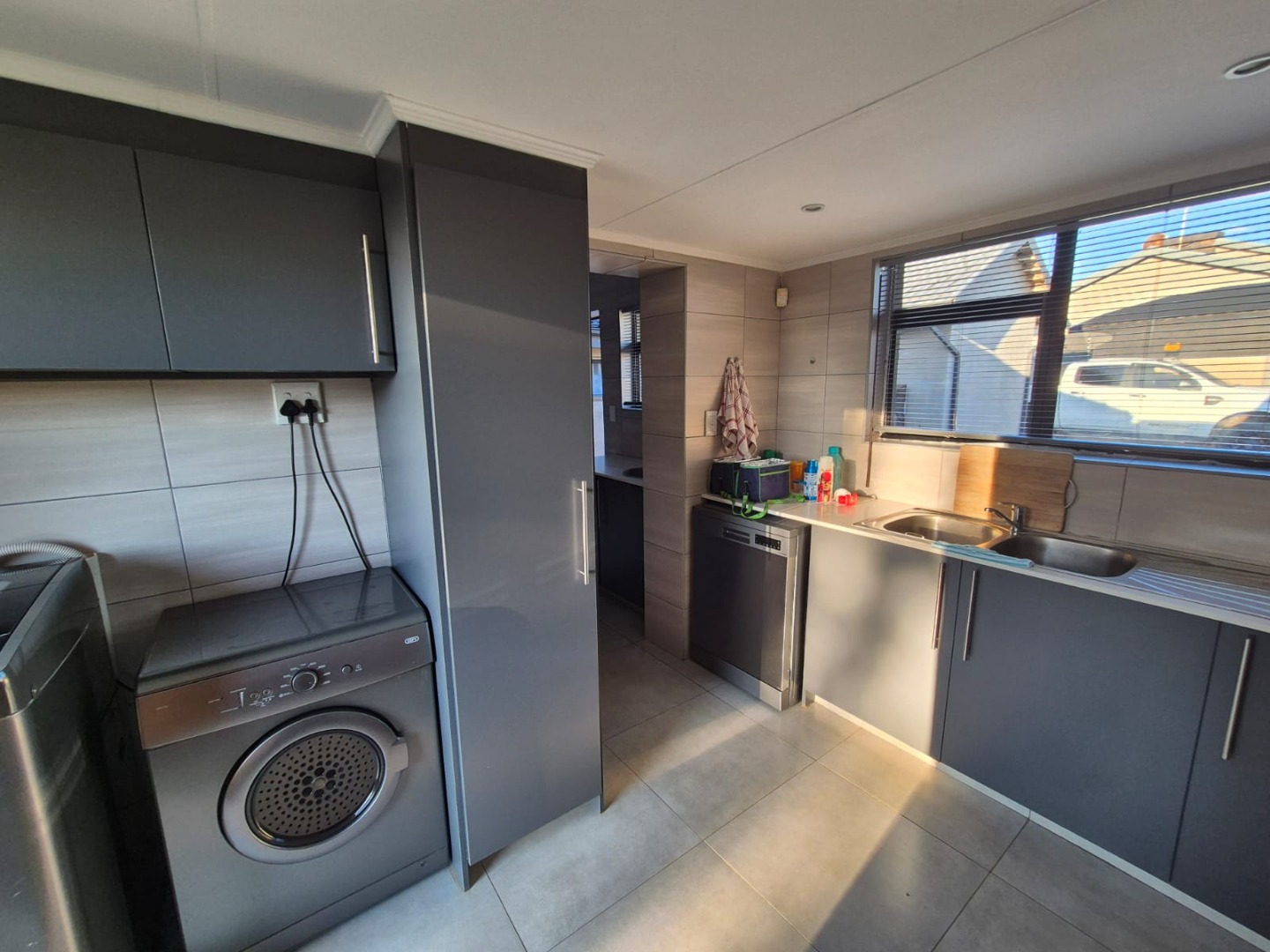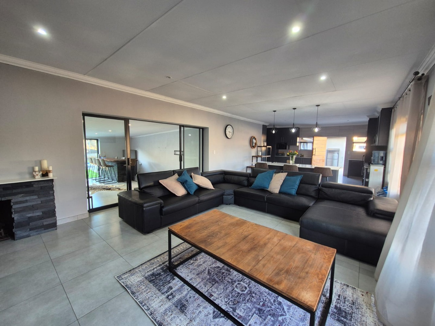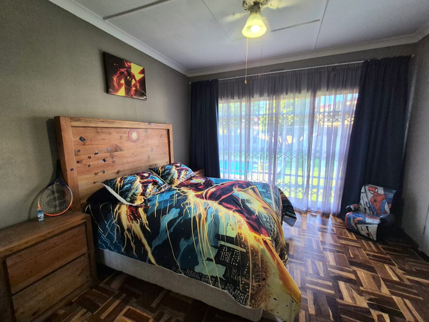 This modern family home in Greenhills, Randfontein, offers a spacious and contemporary living experience. The heart of the home features an inviting open-plan layout, seamlessly connecting the lounge, dining room, and a dedicated family/TV room. The stylish kitchen is a highlight, boasting dark cabinetry, light countertops, a large island with seating, and modern pendant lighting, all complemented by sleek tiled flooring. A convenient laundry area and a built-in bar enhance the functionality and entertainment potential of the interior. The residence comprises four comfortable bedrooms and 2.5 bathrooms, including a guest toilet, providing ample space for a growing family. Additionally, a dedicated study offers a quiet space for work or hobbies. Step outside to discover a private oasis designed for relaxation and entertainment. The property features a sparkling swimming pool, a lush green garden, and a dedicated children's play area, perfect for family enjoyment. An outdoor built-in braai area is ideal for social gatherings. Practical amenities include a double garage, domestic rooms, and outside toilets. Security is a priority, with comprehensive features such as an alarm system, access gate, electric fencing, CCTV, burglar bars, and a security gate, ensuring peace of mind for residents. This suburban property allows pets, adding to its family-friendly appeal. Key Features: * 4 Bedrooms, 2.5 Bathrooms * Modern Open-Plan Kitchen with Island * Spacious Lounge, Dining, and Family/TV Rooms * Private Swimming Pool & Lush Garden * Outdoor Built-in Braai Area * Double Garage * Comprehensive Security (Alarm, CCTV, Electric Fencing) * Dedicated Study * Domestic Rooms & Outside Toilets