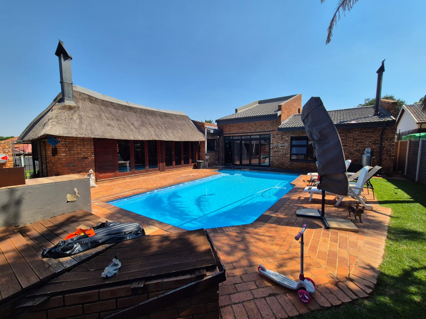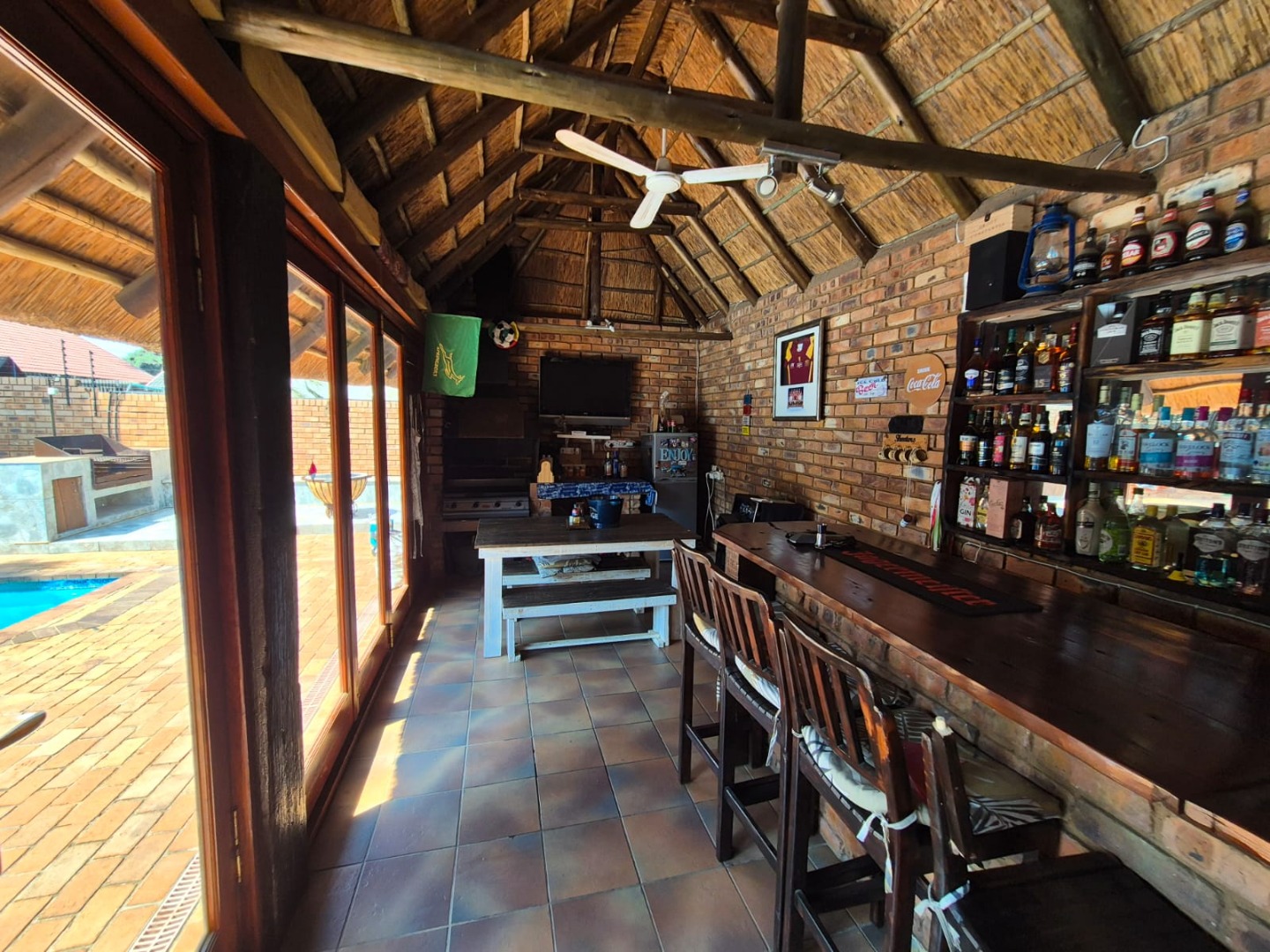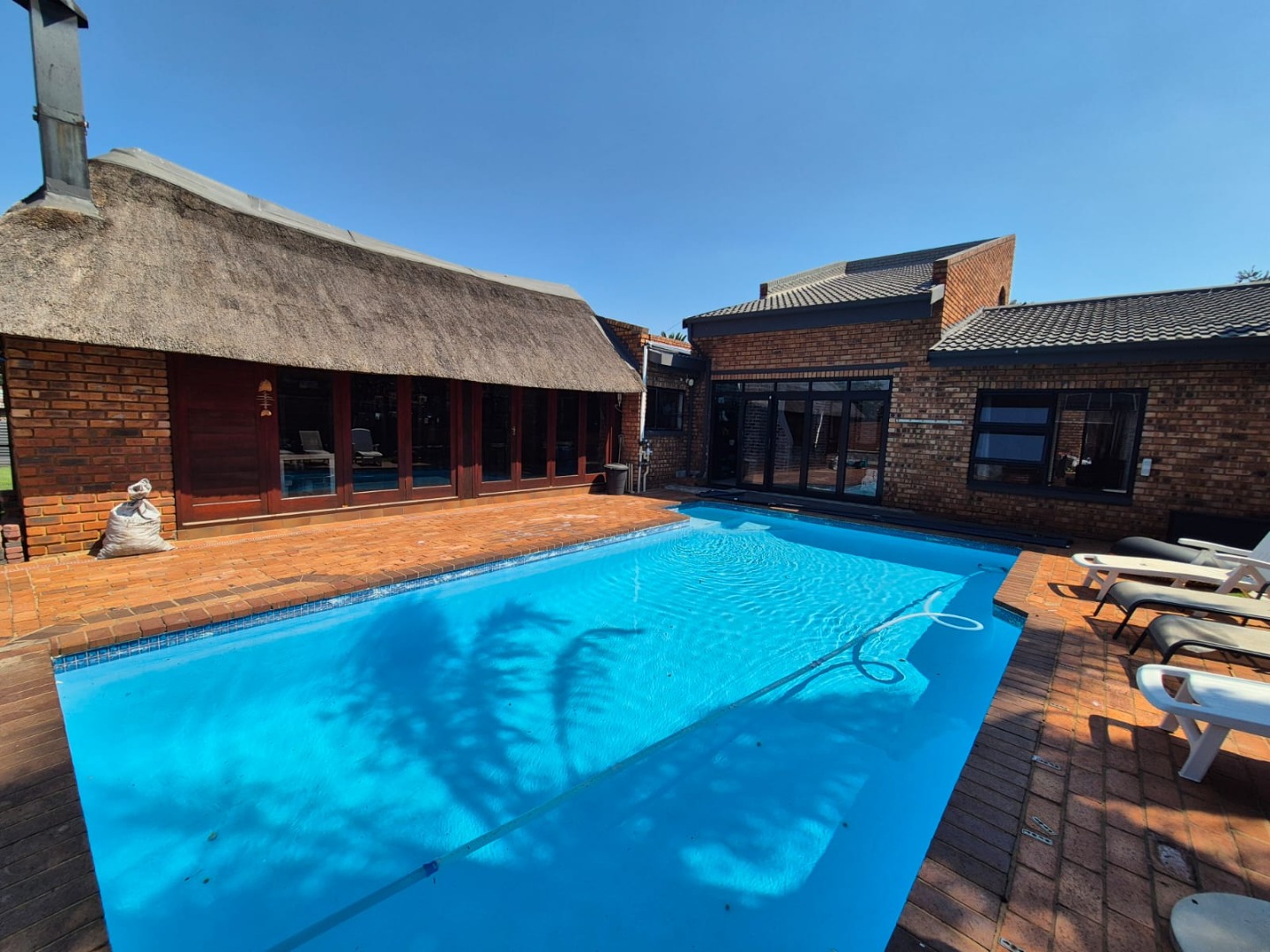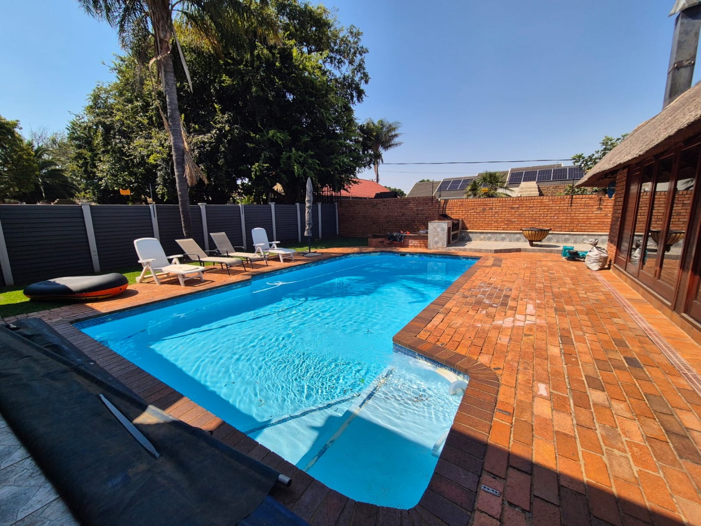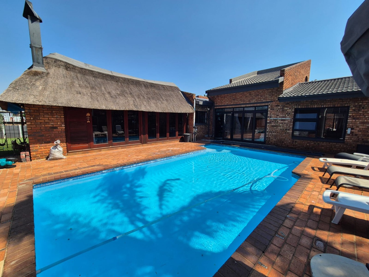 Discover this spacious five-bedroom, four-bathroom residence nestled in the suburban heart of Greenhills, Randfontein. This property immediately impresses with its neat front lawn, paved driveway, and a double garage complemented by an additional carport, offering ample secure parking. The durable red brick exterior and security bars on windows provide a sense of robust kerb appeal and safety. Step inside to an expansive open-plan living and dining area, bathed in natural light from high ceilings and architectural windows. Distinctive whitewashed exposed brick arches and accent walls add character, creating a unique aesthetic. The main kitchen boasts modern dark green cabinetry and a granite-topped island, seamlessly flowing into a thatched outdoor entertainment area, perfect for hosting. A second, functional kitchen features extensive sage green cabinetry and built-in appliances, catering to all culinary needs. Beyond the interiors, the property offers an exceptional outdoor lifestyle. A large, clean swimming pool is surrounded by spacious brick paving, inviting relaxation and recreation. The thatched patio, visible from the living area, provides an ideal spot for al fresco dining, further enhanced by a built-in braai. The well-maintained garden benefits from an irrigation system, ensuring lush greenery year-round. Security is a priority, with features including an alarm system, electric fencing, an access gate, burglar bars, and security gates. For modern convenience and sustainability, the home is equipped with solar panels, fibre, and ADSL connectivity. This Greenhills home combines generous living spaces with excellent outdoor amenities and robust security, making it an ideal family haven. Key Features: * 5 Bedrooms, 4 Bathrooms * Double Garage & Carport * Open-Plan Living with High Ceilings * Modern Kitchen with Granite Island * Large Swimming Pool & Thatched Patio * Built-in Braai * Solar Panels & Fibre Connectivity * Alarm System & Electric Fencing * Erf Size: 1236 sqm, Floor Size: 380 sqm