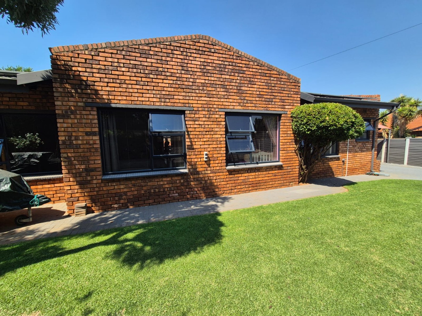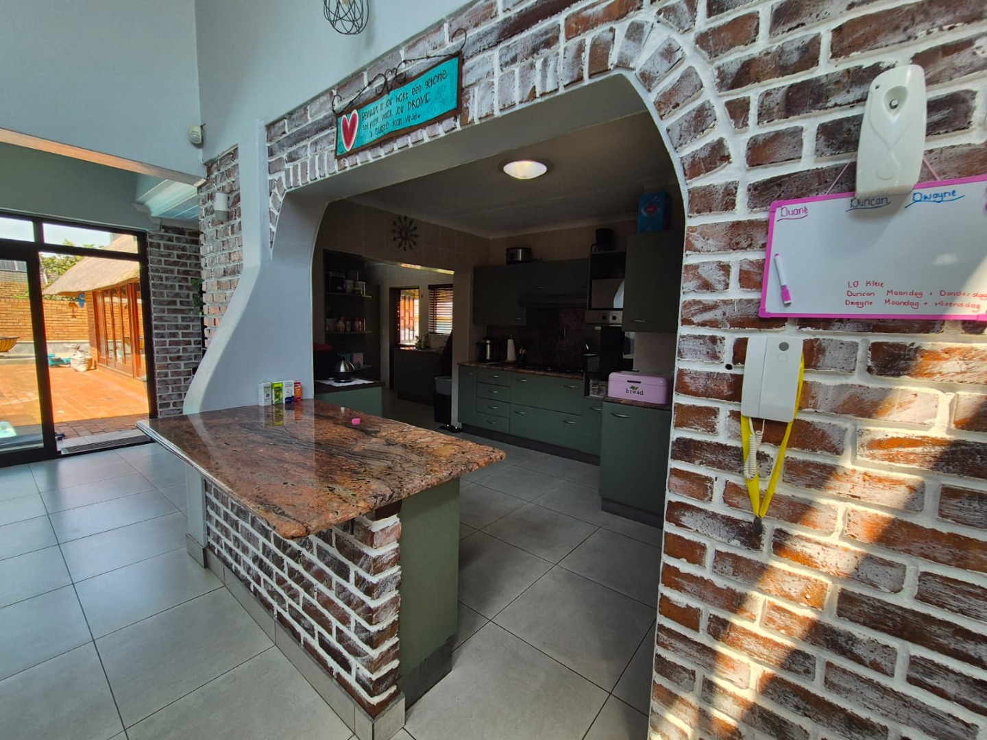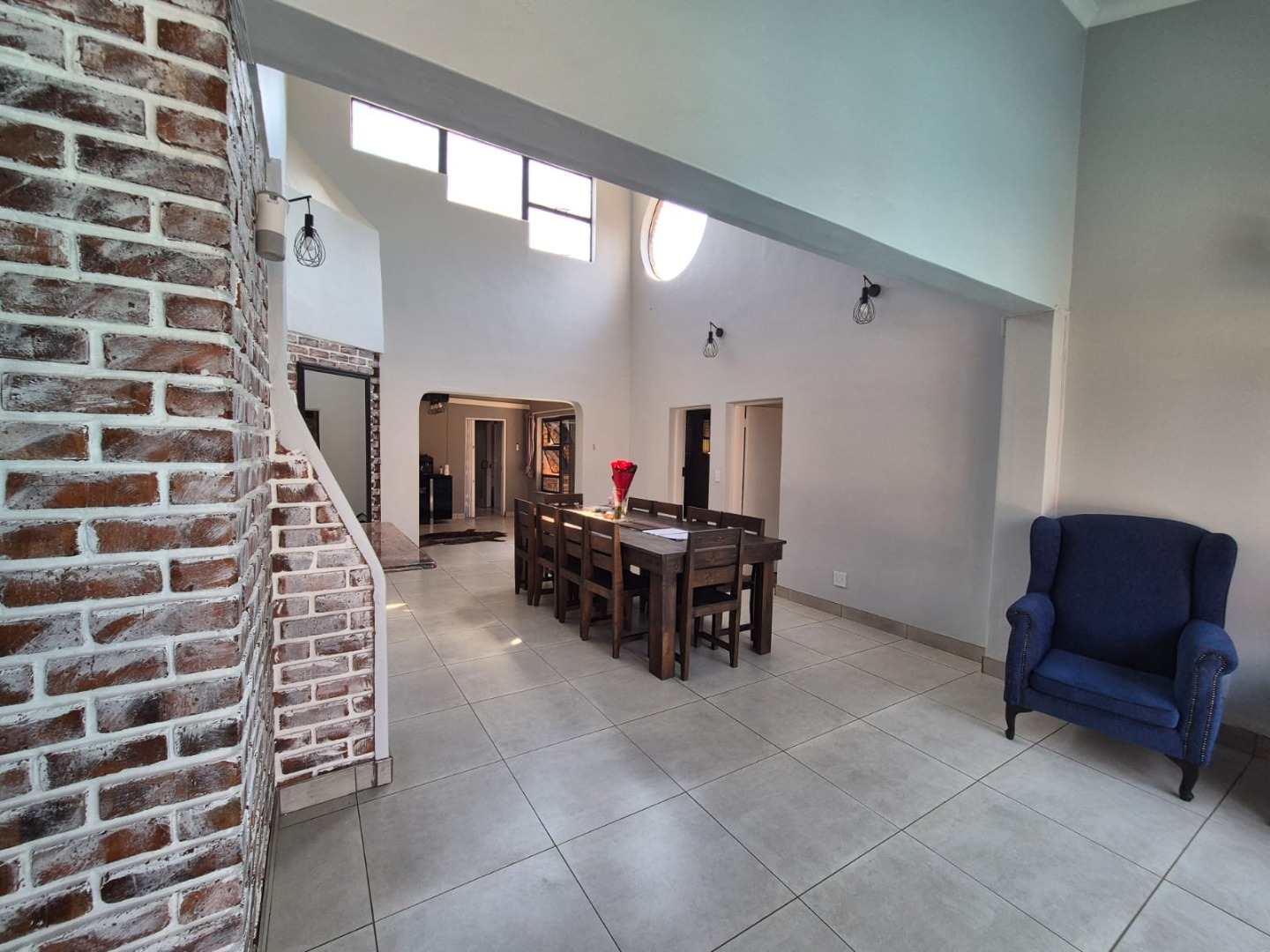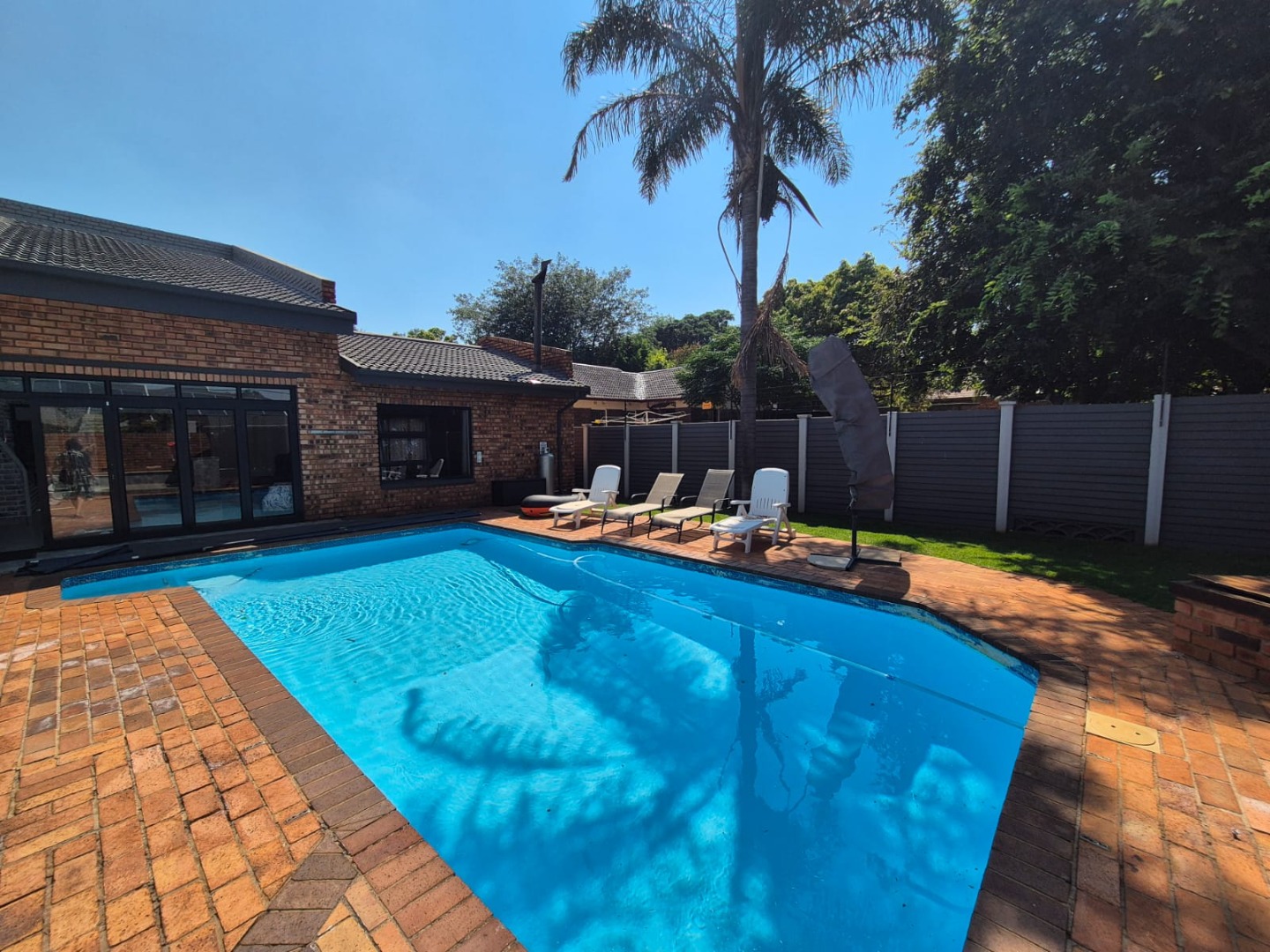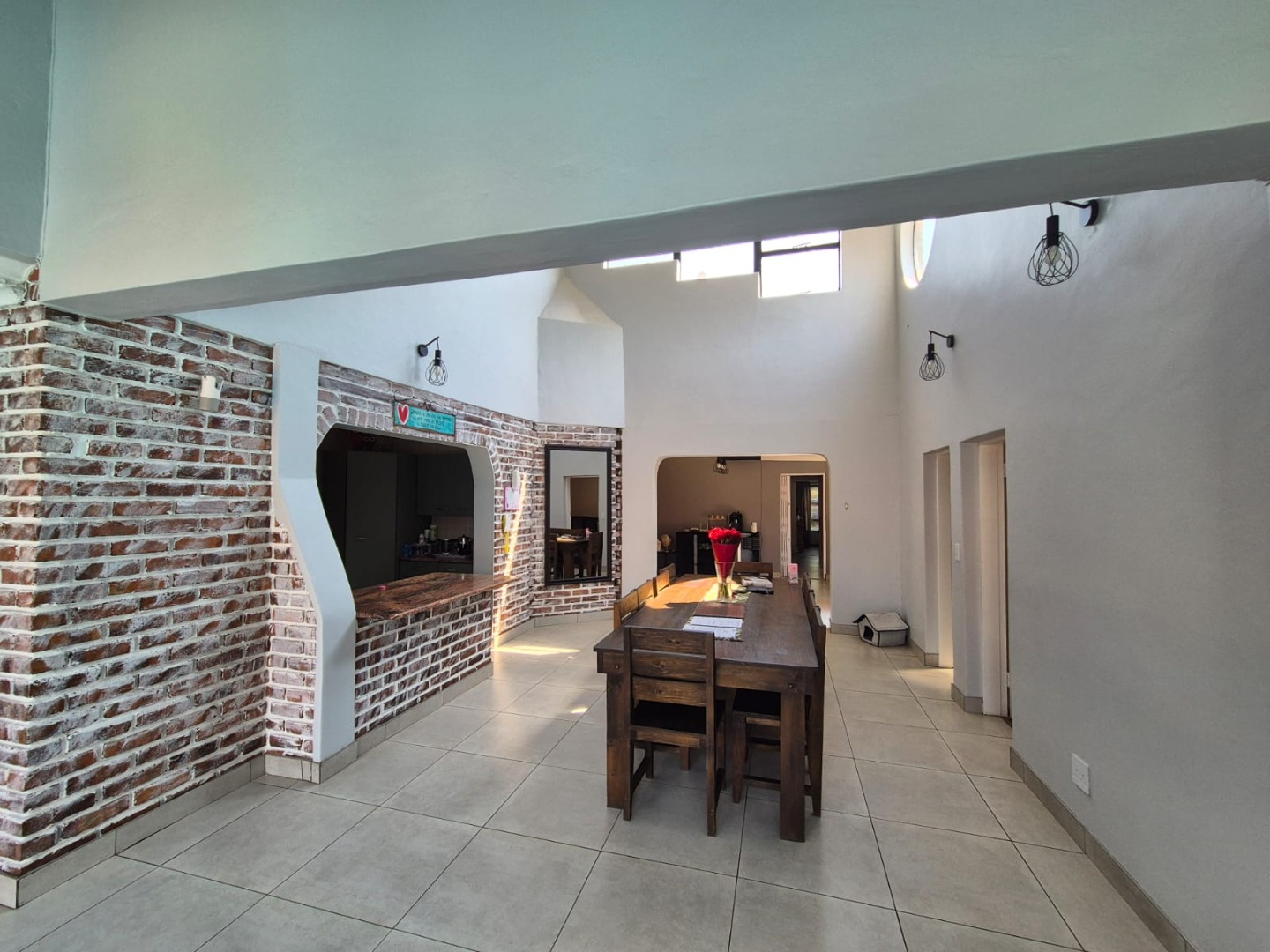 Discover this spacious five-bedroom, four-bathroom residence nestled in the suburban heart of Greenhills, Randfontein. This property immediately impresses with its neat front lawn, paved driveway, and a double garage complemented by an additional carport, offering ample secure parking. The durable red brick exterior and security bars on windows provide a sense of robust kerb appeal and safety. Step inside to an expansive open-plan living and dining area, bathed in natural light from high ceilings and architectural windows. Distinctive whitewashed exposed brick arches and accent walls add character, creating a unique aesthetic. The main kitchen boasts modern dark green cabinetry and a granite-topped island, seamlessly flowing into a thatched outdoor entertainment area, perfect for hosting. A second, functional kitchen features extensive sage green cabinetry and built-in appliances, catering to all culinary needs. Beyond the interiors, the property offers an exceptional outdoor lifestyle. A large, clean swimming pool is surrounded by spacious brick paving, inviting relaxation and recreation. The thatched patio, visible from the living area, provides an ideal spot for al fresco dining, further enhanced by a built-in braai. The well-maintained garden benefits from an irrigation system, ensuring lush greenery year-round. Security is a priority, with features including an alarm system, electric fencing, an access gate, burglar bars, and security gates. For modern convenience and sustainability, the home is equipped with solar panels, fibre, and ADSL connectivity. This Greenhills home combines generous living spaces with excellent outdoor amenities and robust security, making it an ideal family haven. Key Features: * 5 Bedrooms, 4 Bathrooms * Double Garage & Carport * Open-Plan Living with High Ceilings * Modern Kitchen with Granite Island * Large Swimming Pool & Thatched Patio * Built-in Braai * Solar Panels & Fibre Connectivity * Alarm System & Electric Fencing * Erf Size: 1236 sqm, Floor Size: 380 sqm