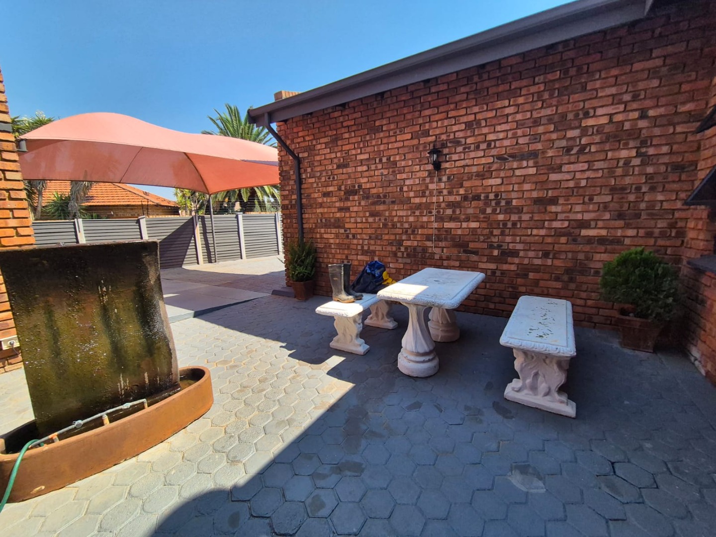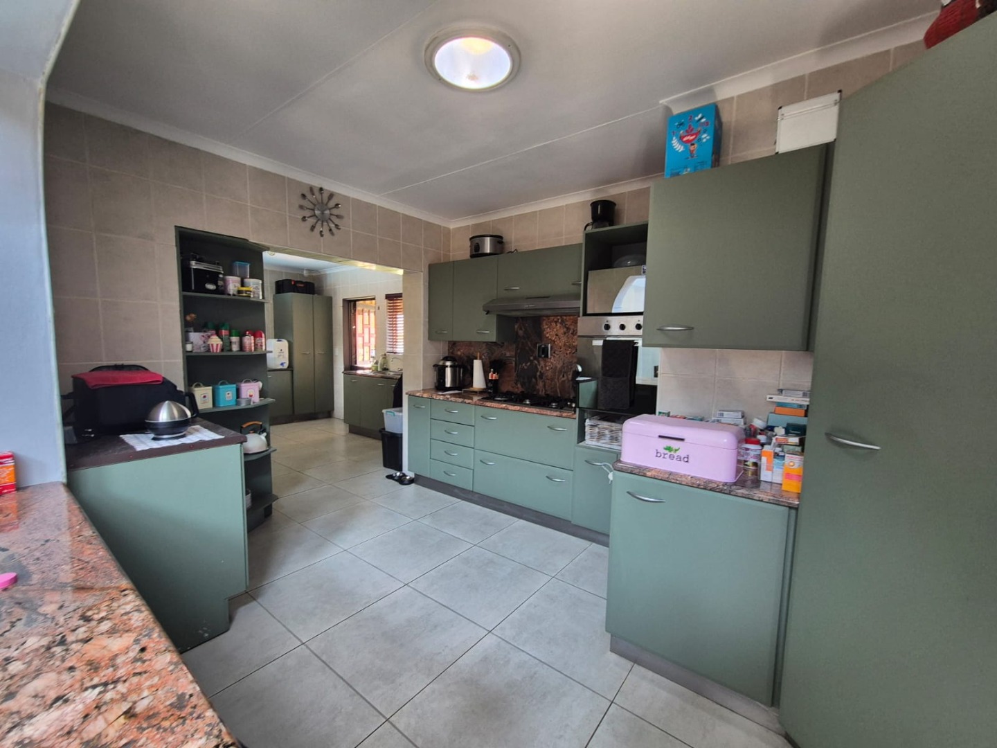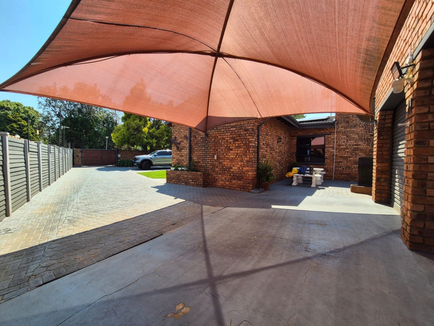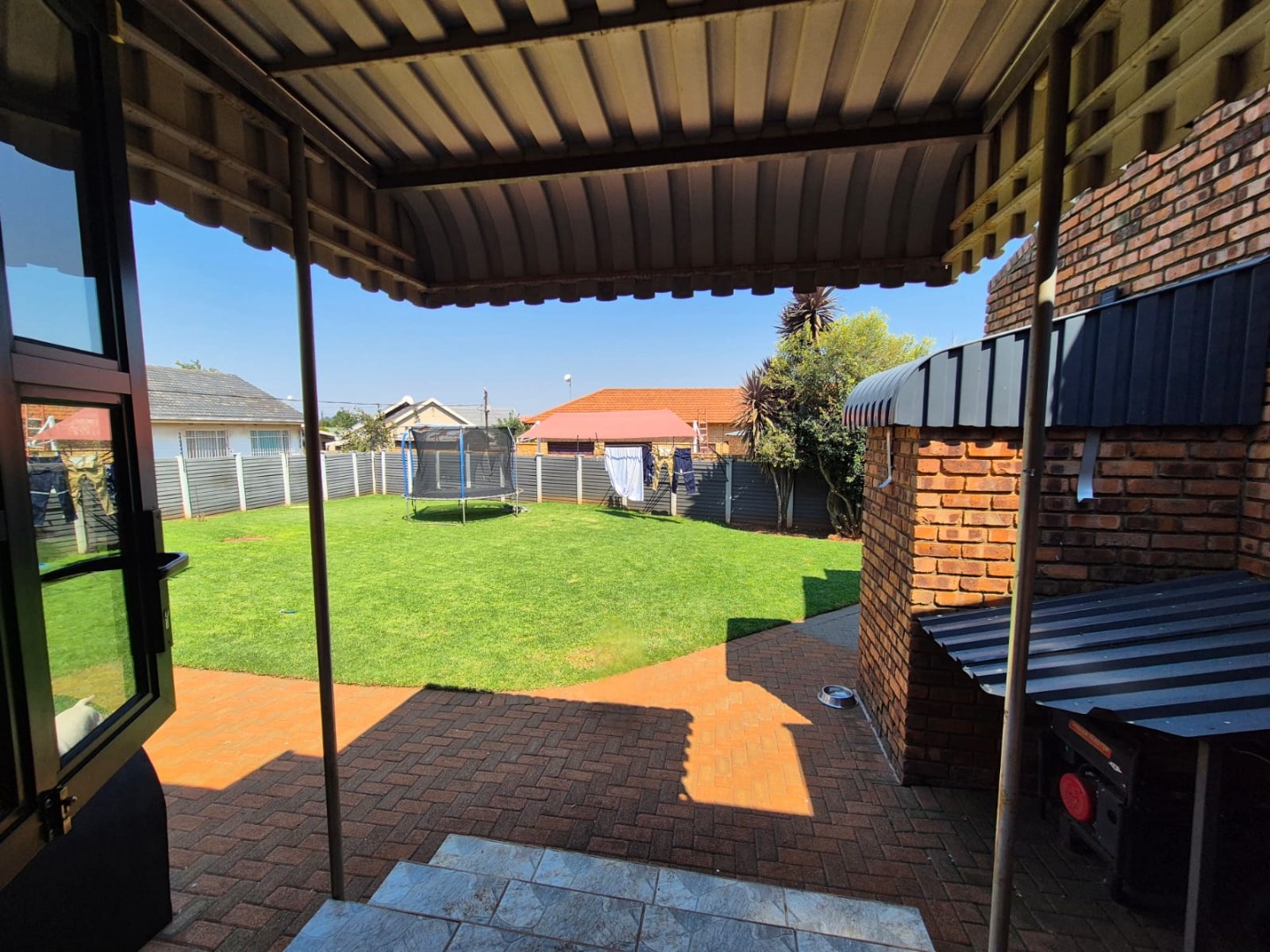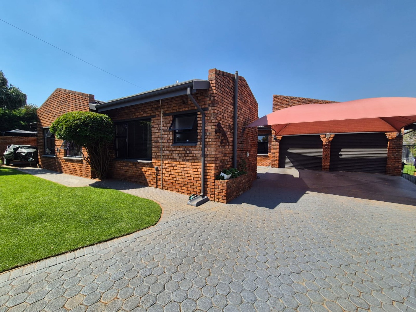 Discover this spacious five-bedroom, four-bathroom residence nestled in the suburban heart of Greenhills, Randfontein. This property immediately impresses with its neat front lawn, paved driveway, and a double garage complemented by an additional carport, offering ample secure parking. The durable red brick exterior and security bars on windows provide a sense of robust kerb appeal and safety. Step inside to an expansive open-plan living and dining area, bathed in natural light from high ceilings and architectural windows. Distinctive whitewashed exposed brick arches and accent walls add character, creating a unique aesthetic. The main kitchen boasts modern dark green cabinetry and a granite-topped island, seamlessly flowing into a thatched outdoor entertainment area, perfect for hosting. A second, functional kitchen features extensive sage green cabinetry and built-in appliances, catering to all culinary needs. Beyond the interiors, the property offers an exceptional outdoor lifestyle. A large, clean swimming pool is surrounded by spacious brick paving, inviting relaxation and recreation. The thatched patio, visible from the living area, provides an ideal spot for al fresco dining, further enhanced by a built-in braai. The well-maintained garden benefits from an irrigation system, ensuring lush greenery year-round. Security is a priority, with features including an alarm system, electric fencing, an access gate, burglar bars, and security gates. For modern convenience and sustainability, the home is equipped with solar panels, fibre, and ADSL connectivity. This Greenhills home combines generous living spaces with excellent outdoor amenities and robust security, making it an ideal family haven. Key Features: * 5 Bedrooms, 4 Bathrooms * Double Garage & Carport * Open-Plan Living with High Ceilings * Modern Kitchen with Granite Island * Large Swimming Pool & Thatched Patio * Built-in Braai * Solar Panels & Fibre Connectivity * Alarm System & Electric Fencing * Erf Size: 1236 sqm, Floor Size: 380 sqm