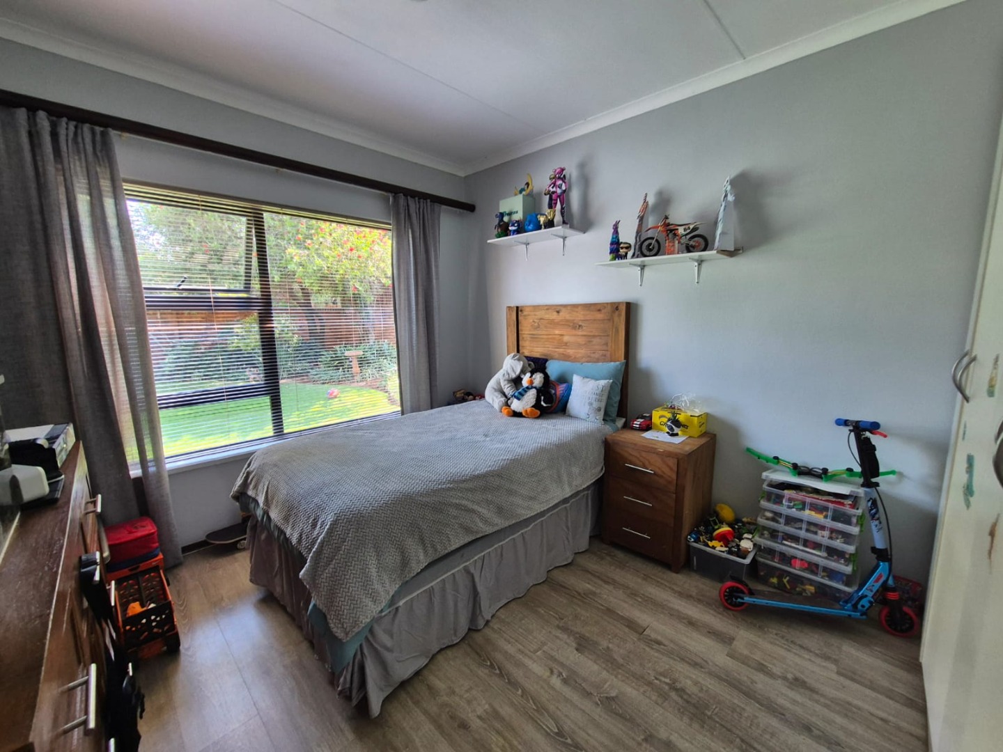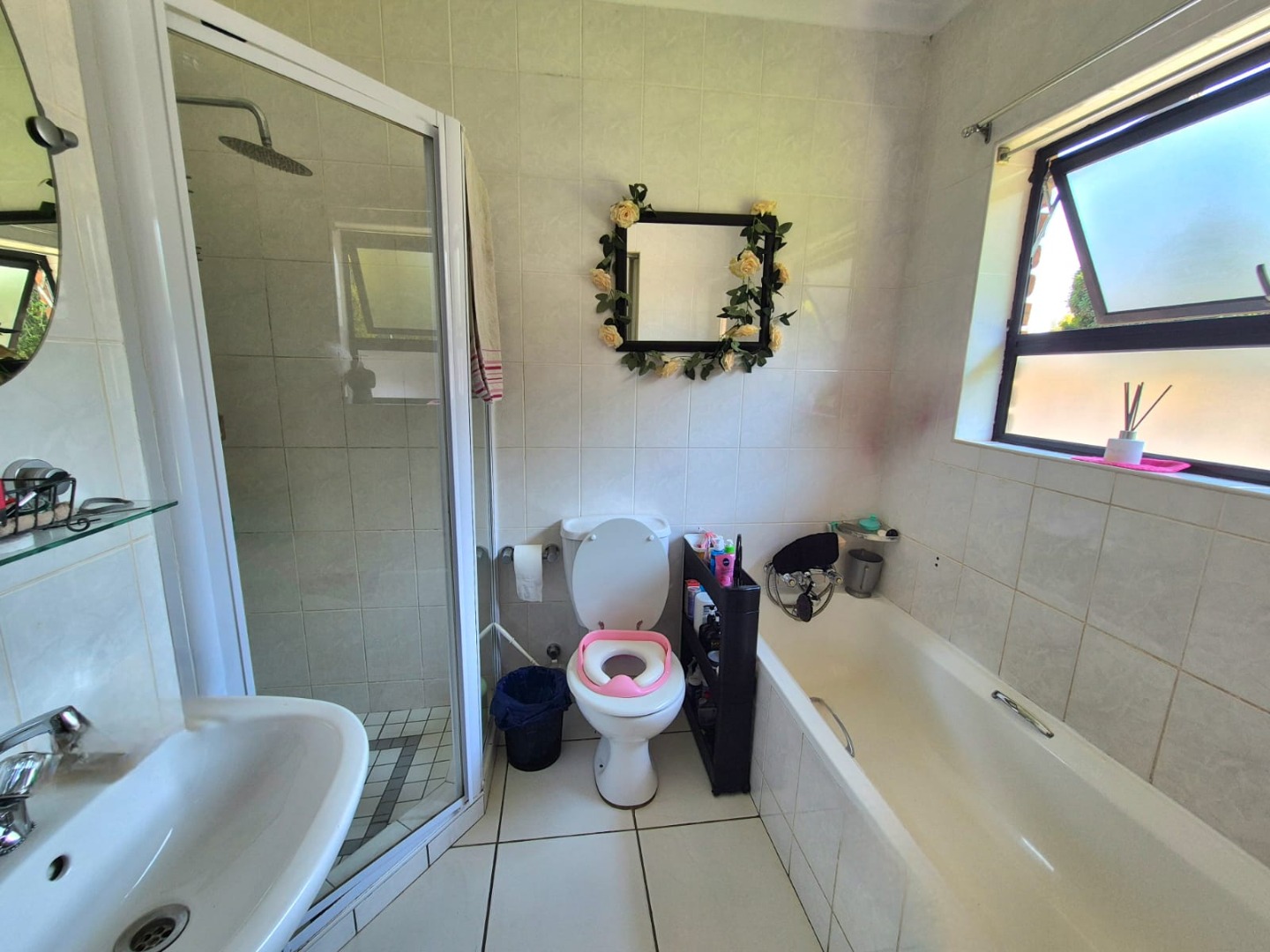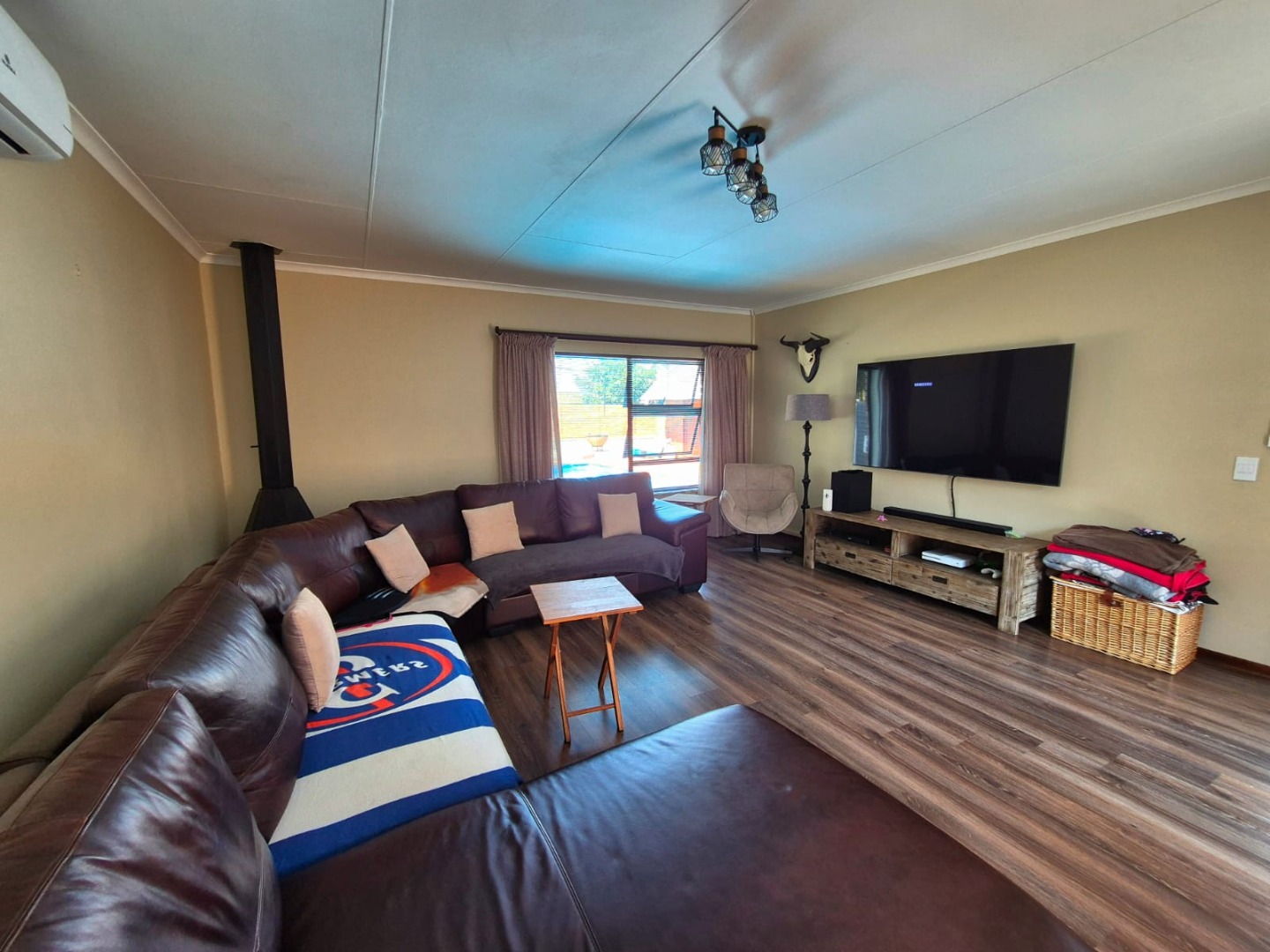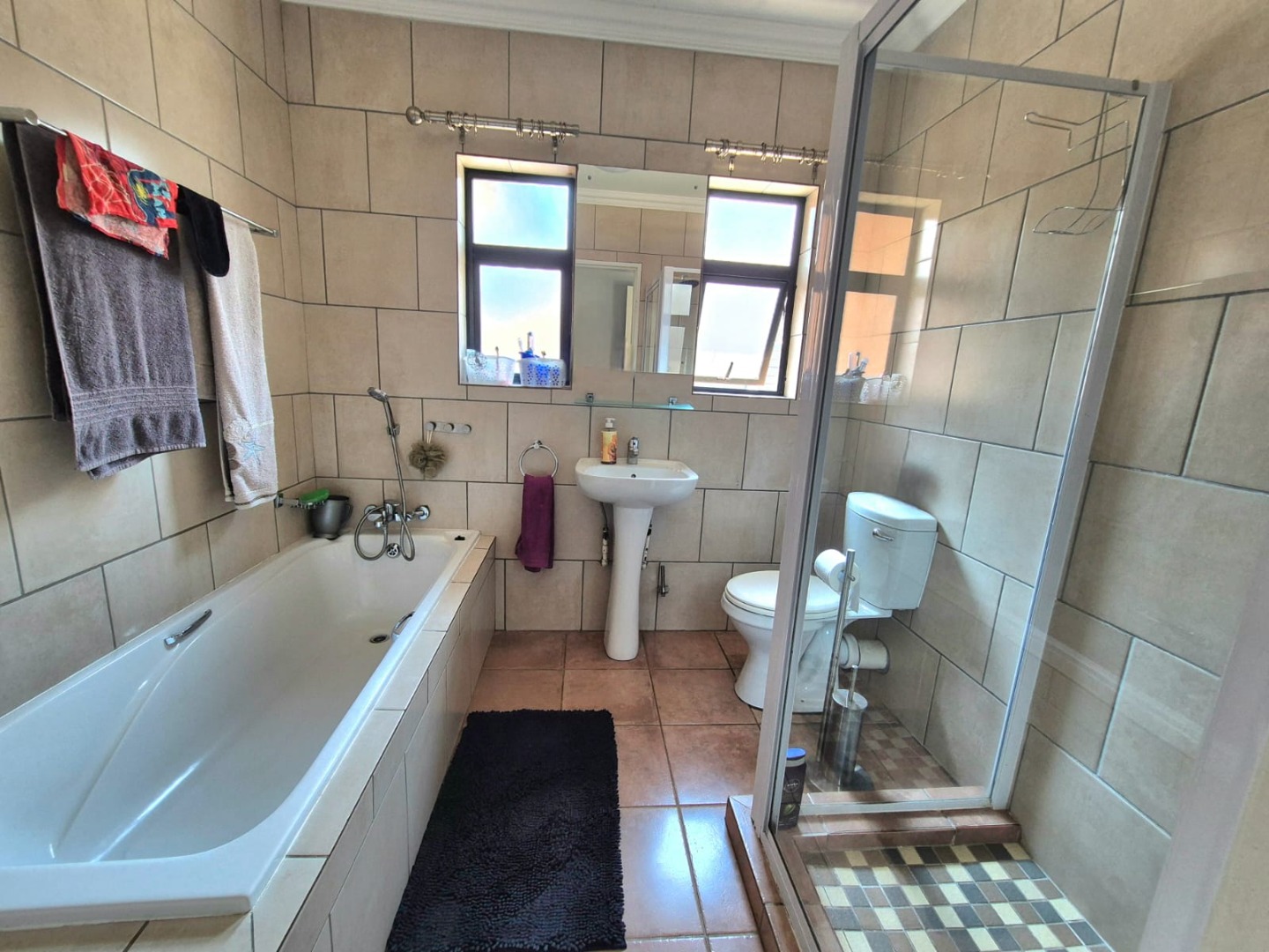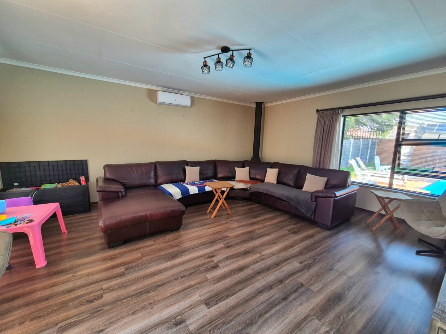 Discover this spacious five-bedroom, four-bathroom residence nestled in the suburban heart of Greenhills, Randfontein. This property immediately impresses with its neat front lawn, paved driveway, and a double garage complemented by an additional carport, offering ample secure parking. The durable red brick exterior and security bars on windows provide a sense of robust kerb appeal and safety. Step inside to an expansive open-plan living and dining area, bathed in natural light from high ceilings and architectural windows. Distinctive whitewashed exposed brick arches and accent walls add character, creating a unique aesthetic. The main kitchen boasts modern dark green cabinetry and a granite-topped island, seamlessly flowing into a thatched outdoor entertainment area, perfect for hosting. A second, functional kitchen features extensive sage green cabinetry and built-in appliances, catering to all culinary needs. Beyond the interiors, the property offers an exceptional outdoor lifestyle. A large, clean swimming pool is surrounded by spacious brick paving, inviting relaxation and recreation. The thatched patio, visible from the living area, provides an ideal spot for al fresco dining, further enhanced by a built-in braai. The well-maintained garden benefits from an irrigation system, ensuring lush greenery year-round. Security is a priority, with features including an alarm system, electric fencing, an access gate, burglar bars, and security gates. For modern convenience and sustainability, the home is equipped with solar panels, fibre, and ADSL connectivity. This Greenhills home combines generous living spaces with excellent outdoor amenities and robust security, making it an ideal family haven. Key Features: * 5 Bedrooms, 4 Bathrooms * Double Garage & Carport * Open-Plan Living with High Ceilings * Modern Kitchen with Granite Island * Large Swimming Pool & Thatched Patio * Built-in Braai * Solar Panels & Fibre Connectivity * Alarm System & Electric Fencing * Erf Size: 1236 sqm, Floor Size: 380 sqm