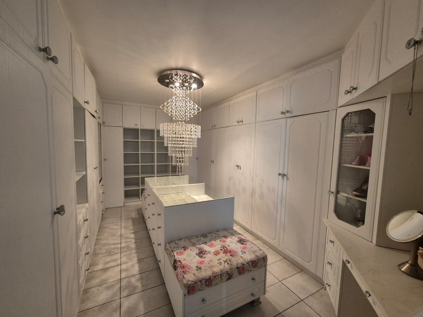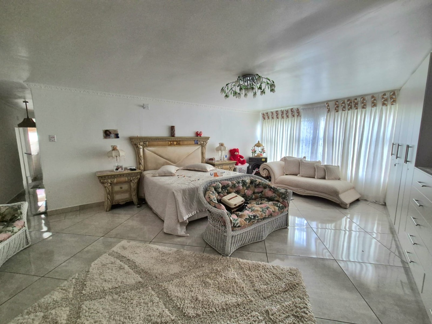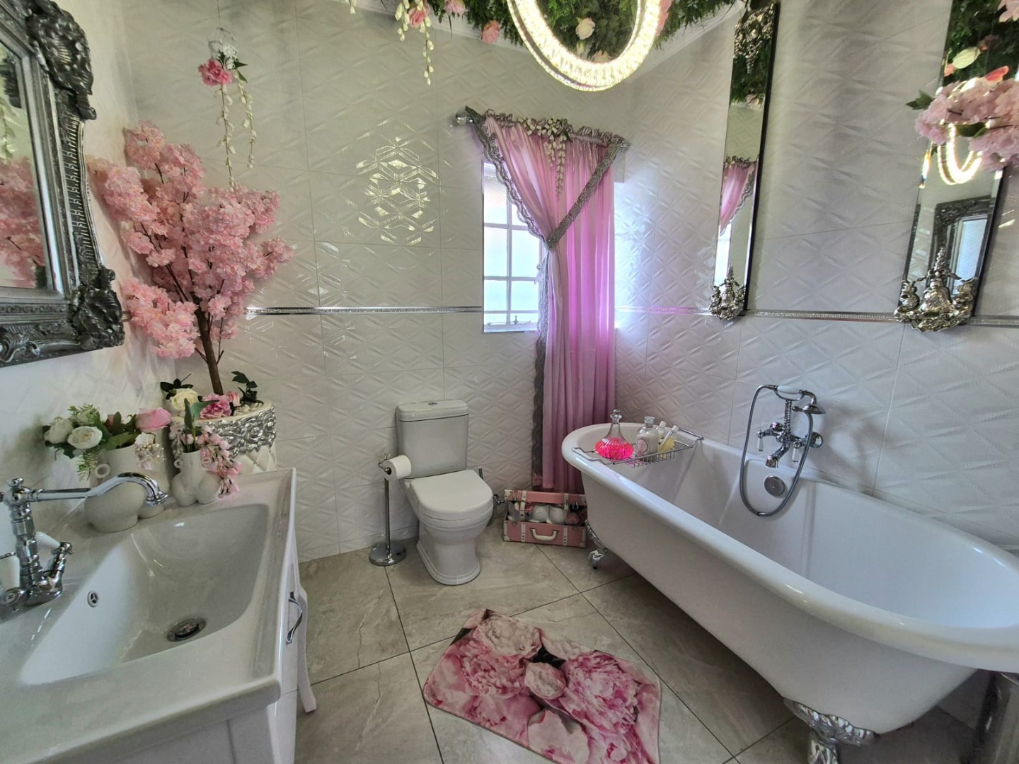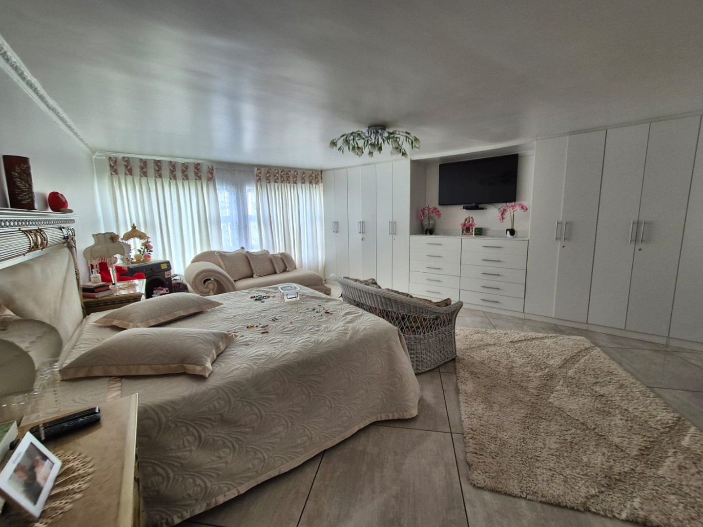 The interior features six spacious bedrooms and five bathrooms, providing abundant accommodation for a large family or guests. The property includes two well-appointed kitchens, a dedicated dining room, two lounges, and a family TV room, ensuring versatile living and entertaining options. Several bedrooms benefit from abundant natural light and unique decorative touches, while a luxurious walk-in closet offers extensive built-in storage and a central island, perfect for organisation. Bathrooms are equipped with both classic clawfoot tubs and modern freestanding options.