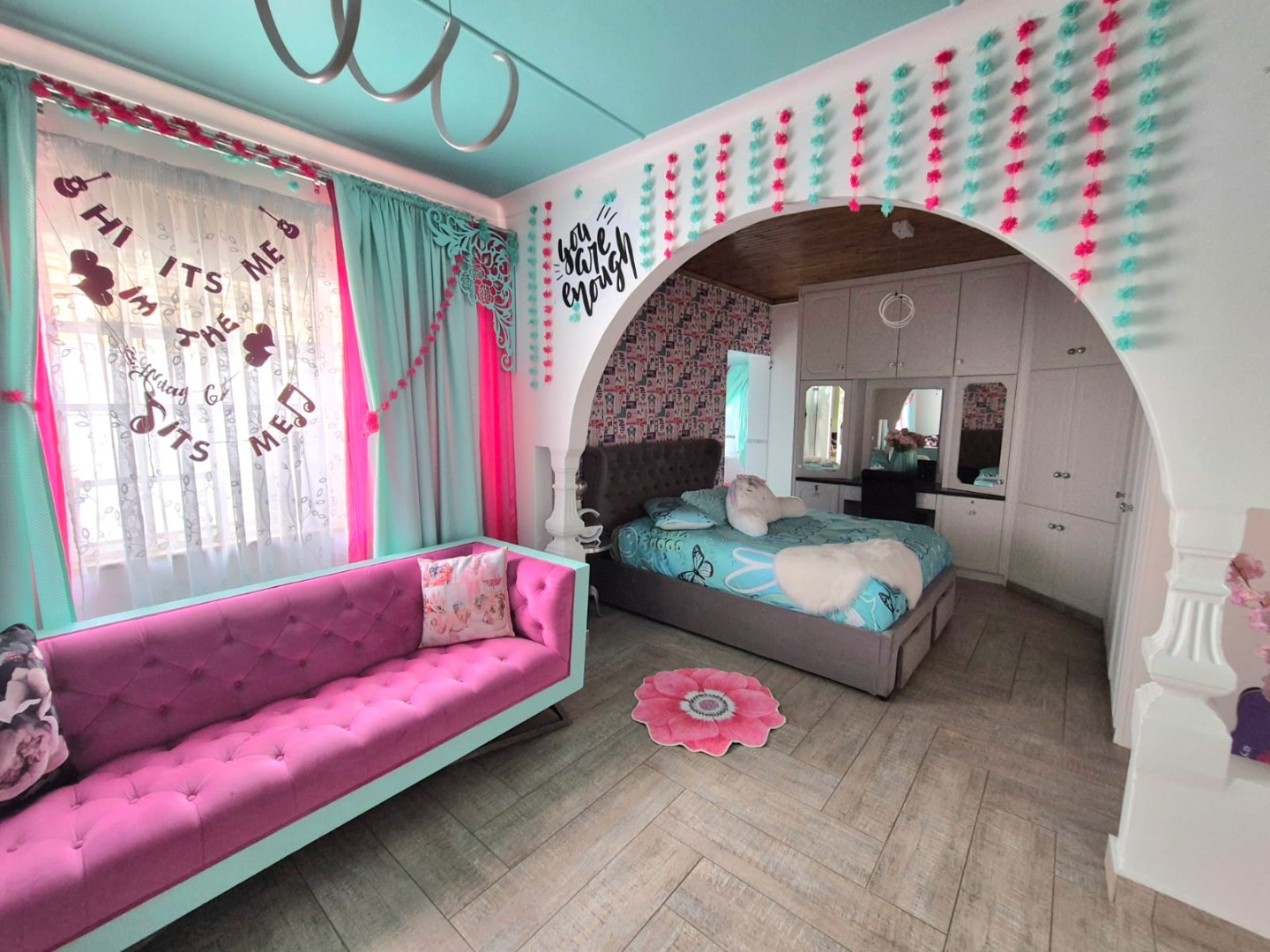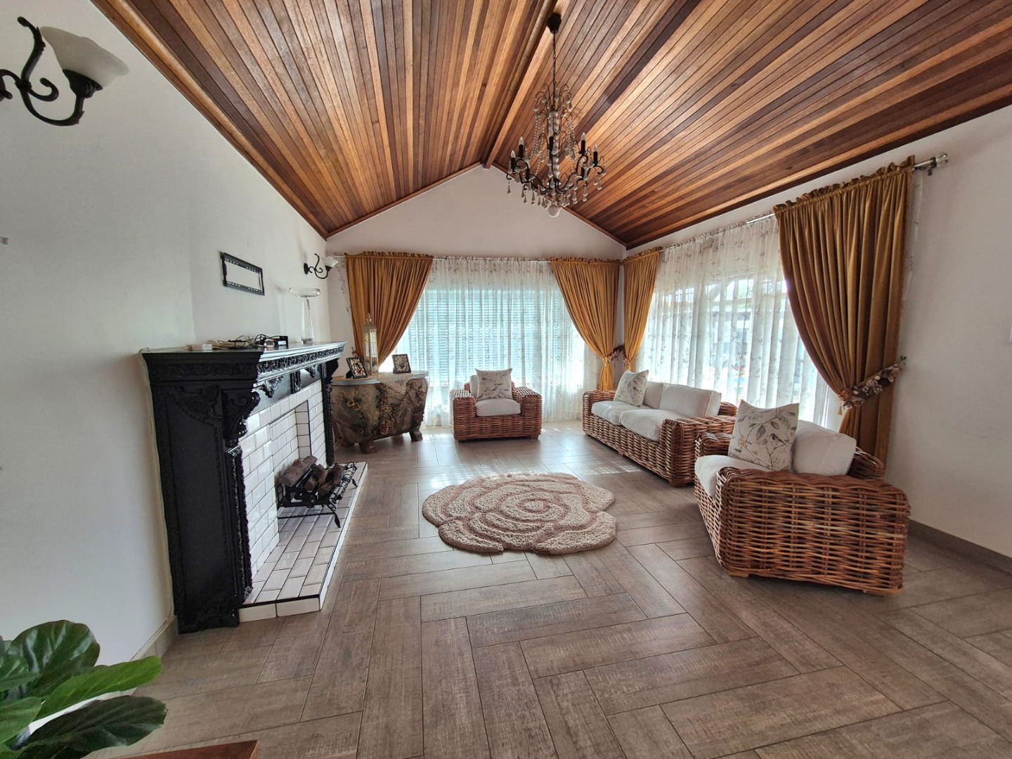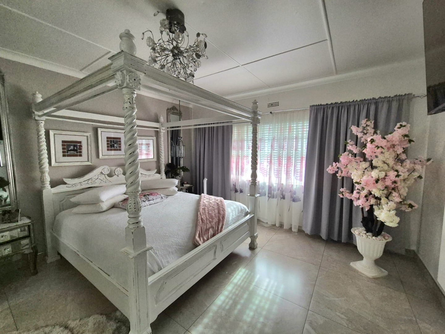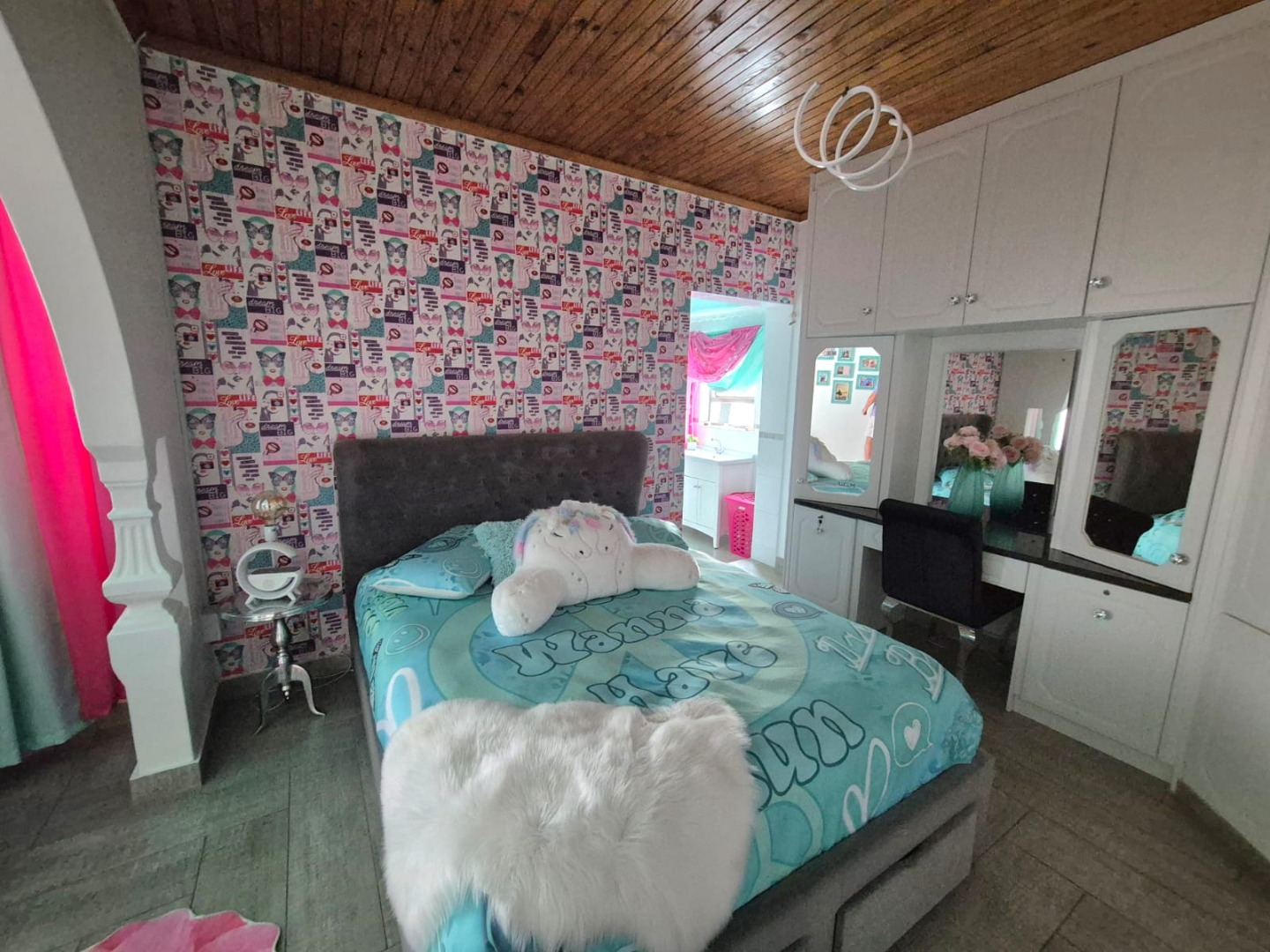 The interior features six spacious bedrooms and five bathrooms, providing abundant accommodation for a large family or guests. The property includes two well-appointed kitchens, a dedicated dining room, two lounges, and a family TV room, ensuring versatile living and entertaining options. Several bedrooms benefit from abundant natural light and unique decorative touches, while a luxurious walk-in closet offers extensive built-in storage and a central island, perfect for organisation. Bathrooms are equipped with both classic clawfoot tubs and modern freestanding options.