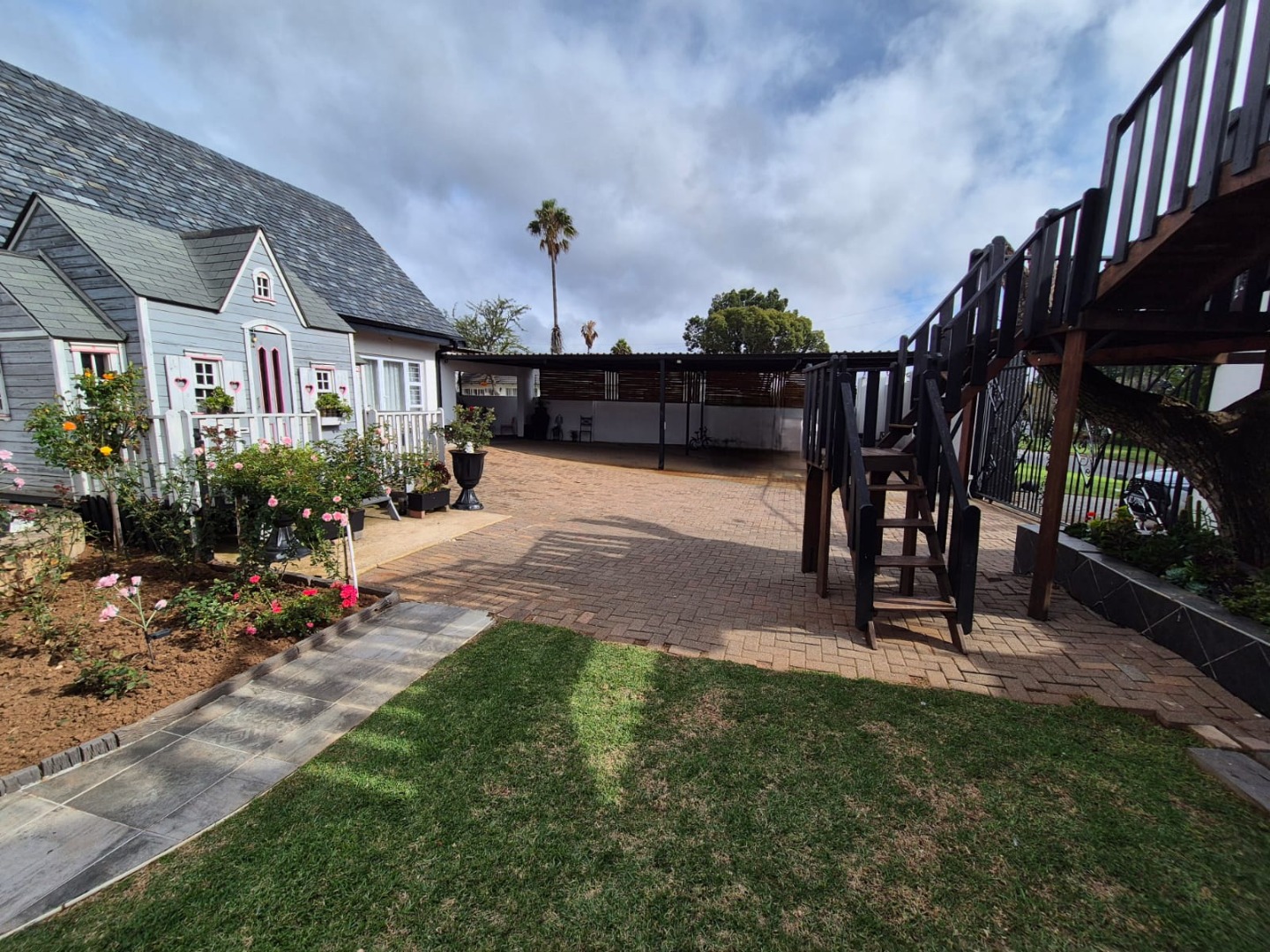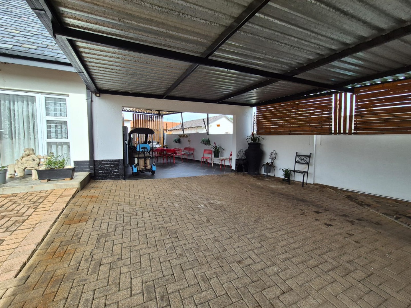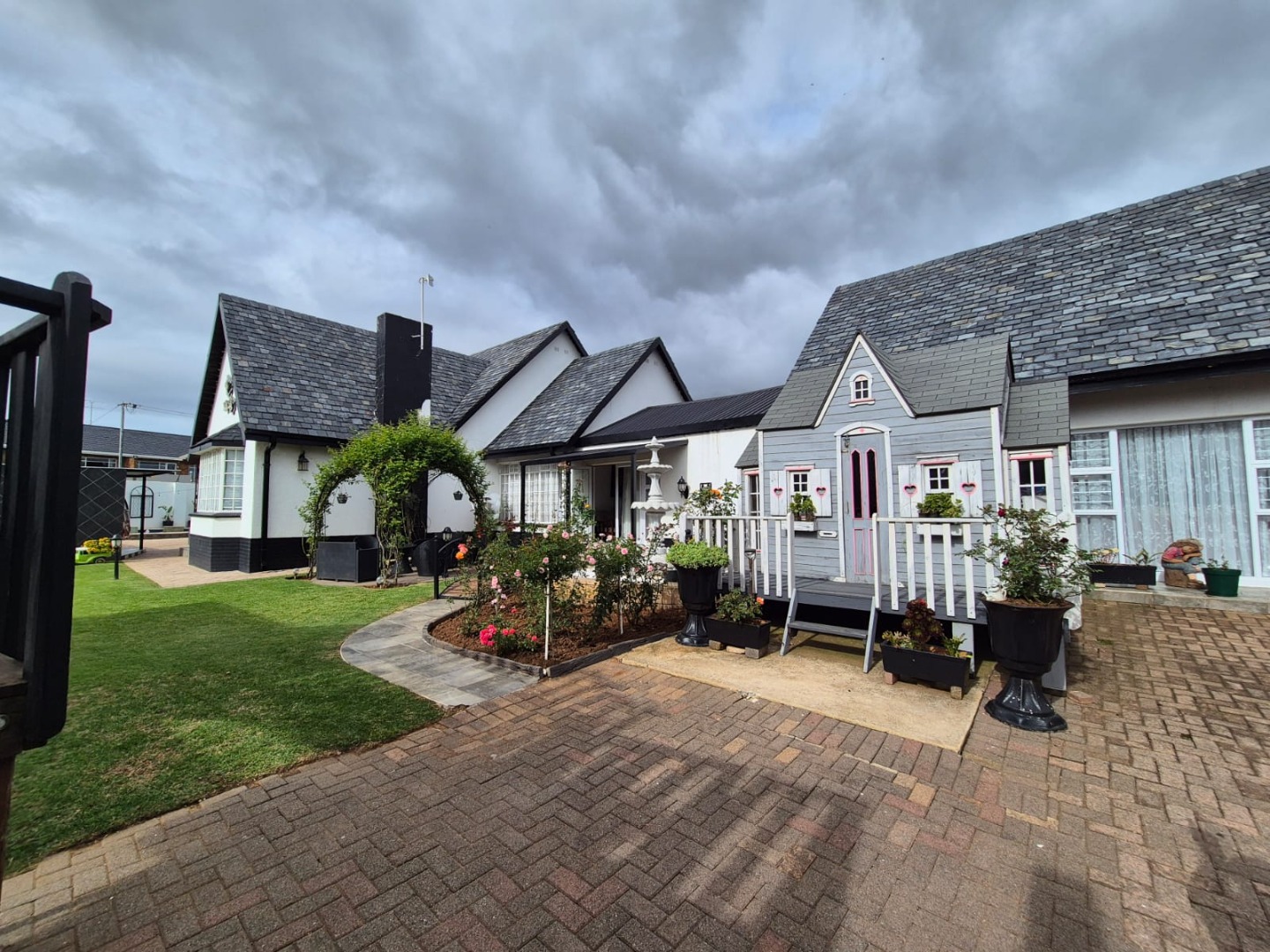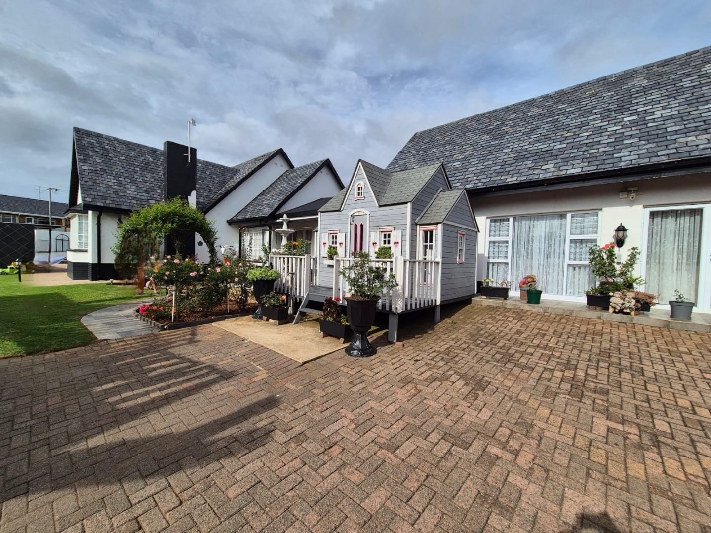 Discover this expansive family home situated on a generous 1518 sqm erf in the suburban heart of Greenhills, Randfontein. Boasting distinctive gabled architecture and a large paved courtyard, this property offers both character and ample space for comfortable living. The well-maintained lawn and charming garden, complete with a children's playhouse, create an inviting outdoor environment.