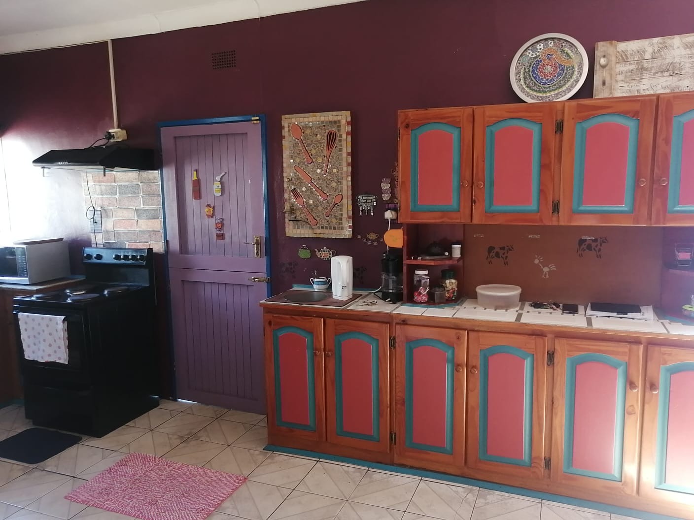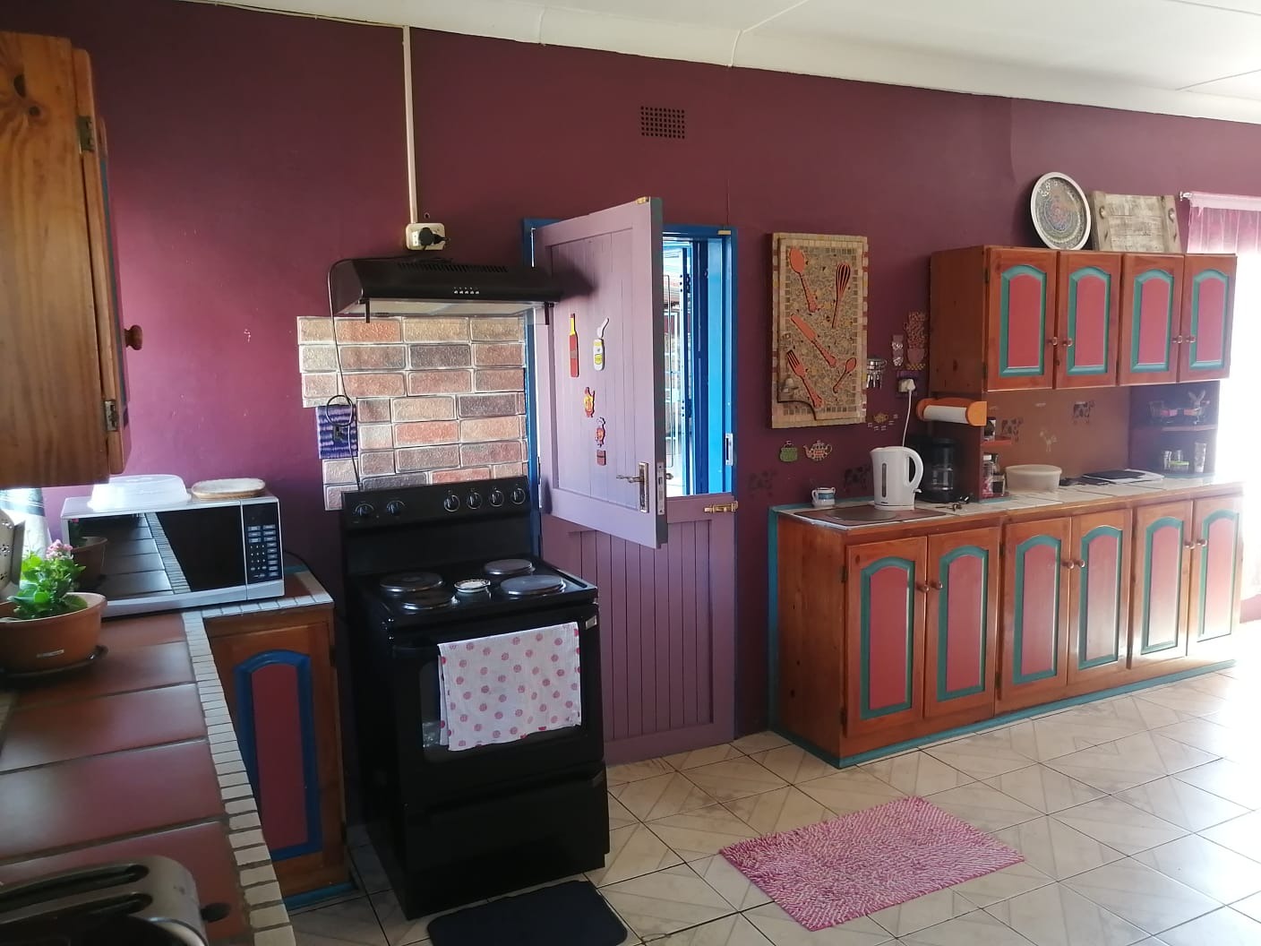 Inside, the home boasts a comfortable 288 sqm floor size, featuring an open-plan layout that connects the living spaces seamlessly. It comprises a welcoming lounge, a dedicated dining room, and an additional family TV room, providing versatile areas for daily living and entertainment. The kitchen presents a distinctive and vibrant aesthetic with custom-built wooden cabinetry, featuring colourful accents, set against deep purple walls. It includes tiled floors, essential appliances like a stove, microwave, and extractor fan, alongside a convenient pantry for additional storage.