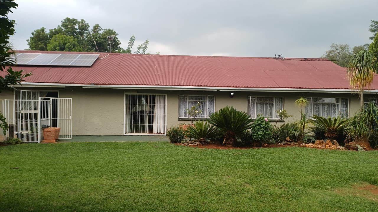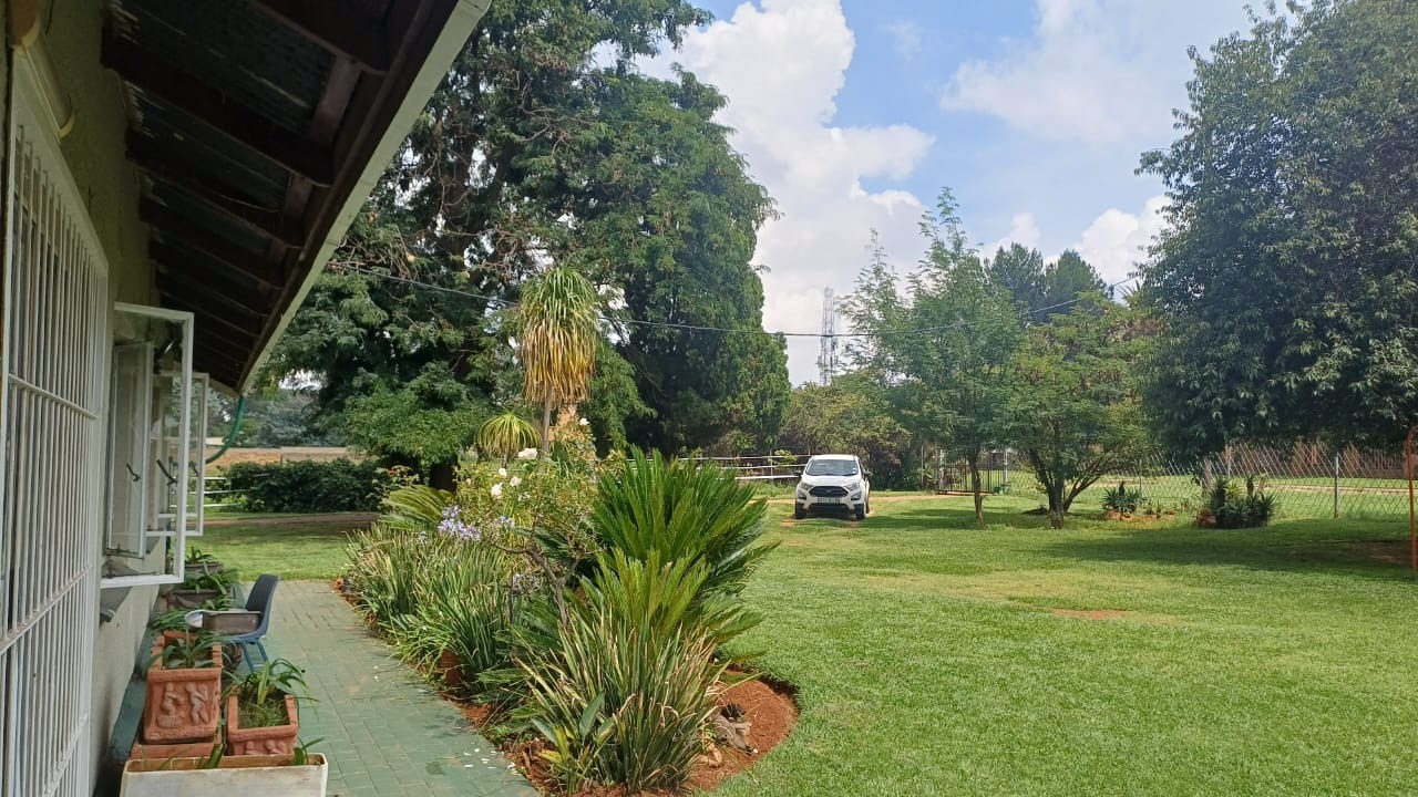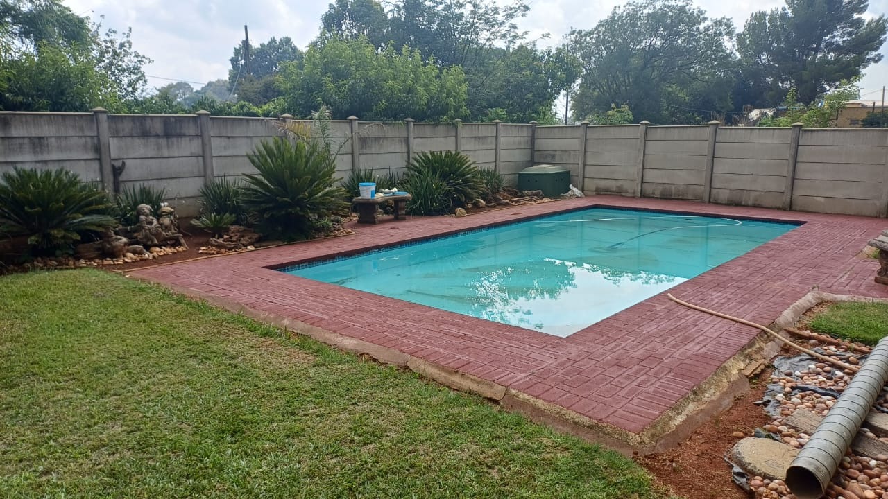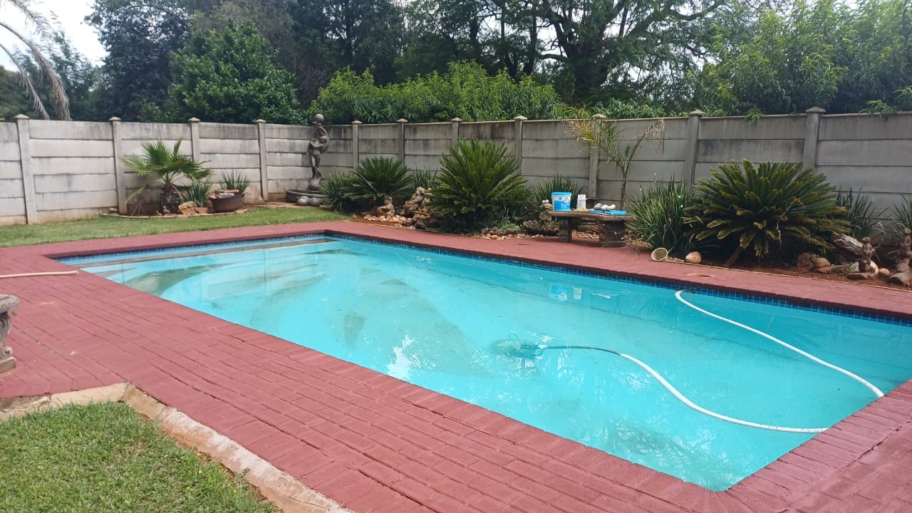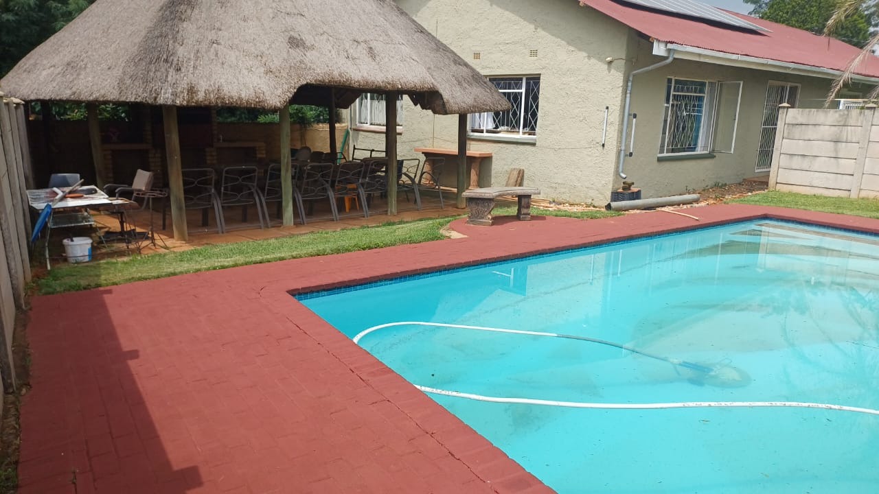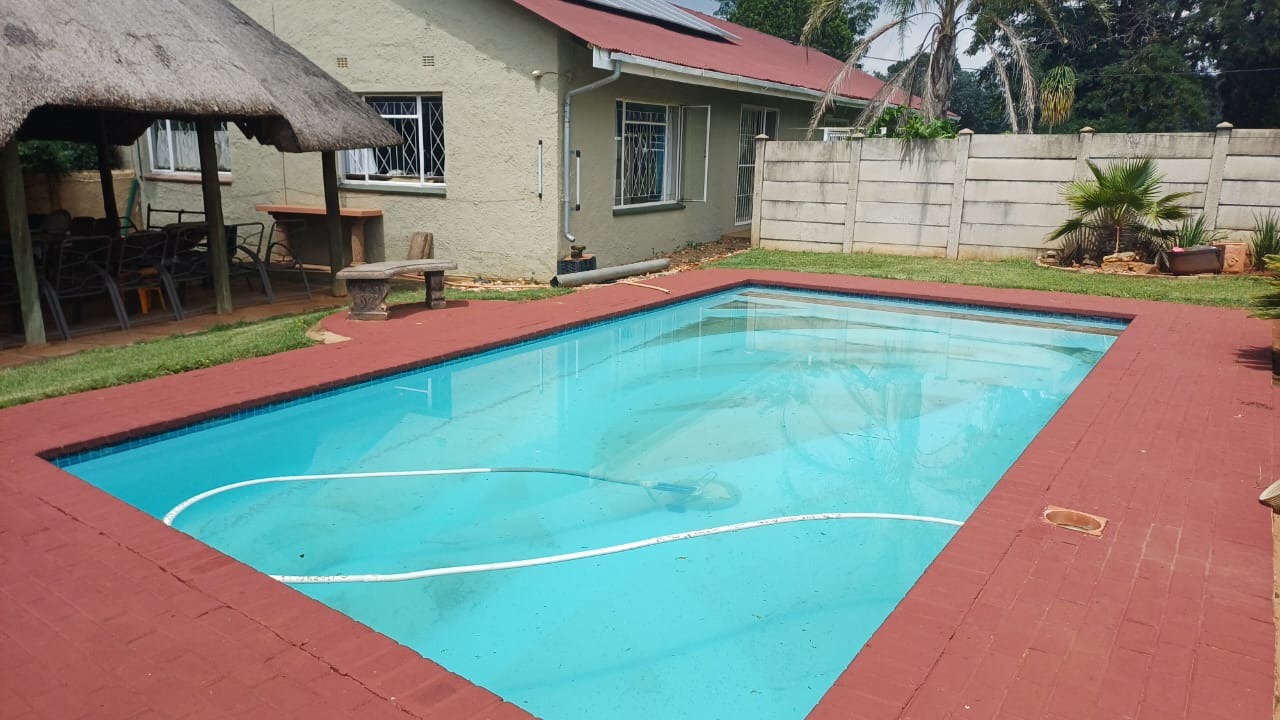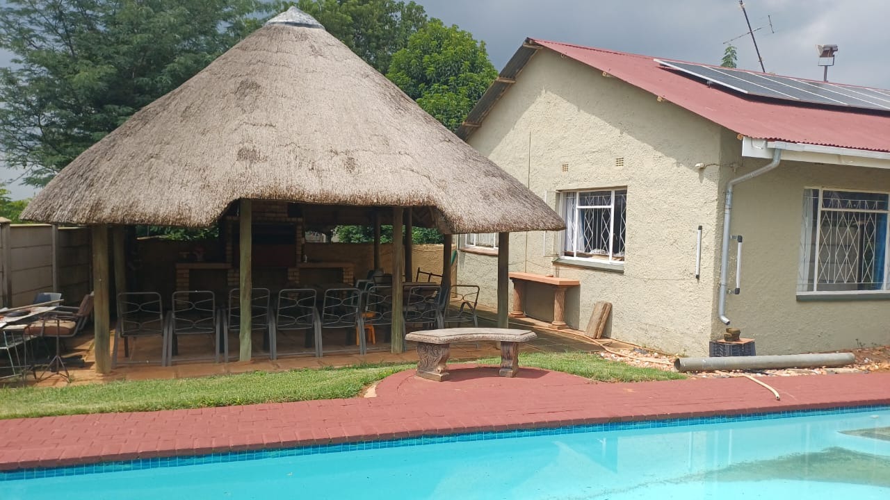 For entertaining and outdoor living, there is a large lapa situated next to the house with a built-in braai, as well as a large swimming pool. The property further includes an outside building that functions as a flat, offering a bedroom with built-in cupboards, a kitchen with built-in cupboards, a bathroom with a shower, basin, and toilet, and a dining and living area. Additional outside buildings consist of three staff quarters with an outside toilet. Parking is well catered for with undercover parking for four vehicles.